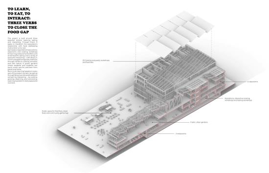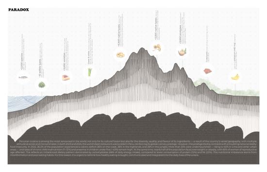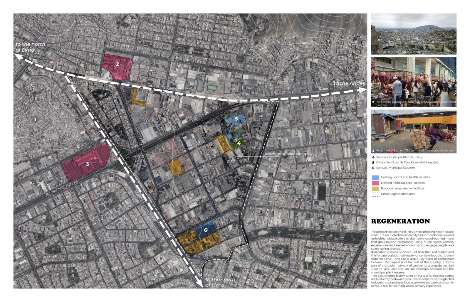 Set in a post-industrial area of Lima, near the Yerbateros slaughterhouse and fruit market, this project addresses malnutrition in Peru— not as a problem of scarcity, but of misinformation and poor eating habits. It proposes Between Knowledge and Flavour: a gastronomy school that teaches through space, experience, and the senses, rather than theory alone.