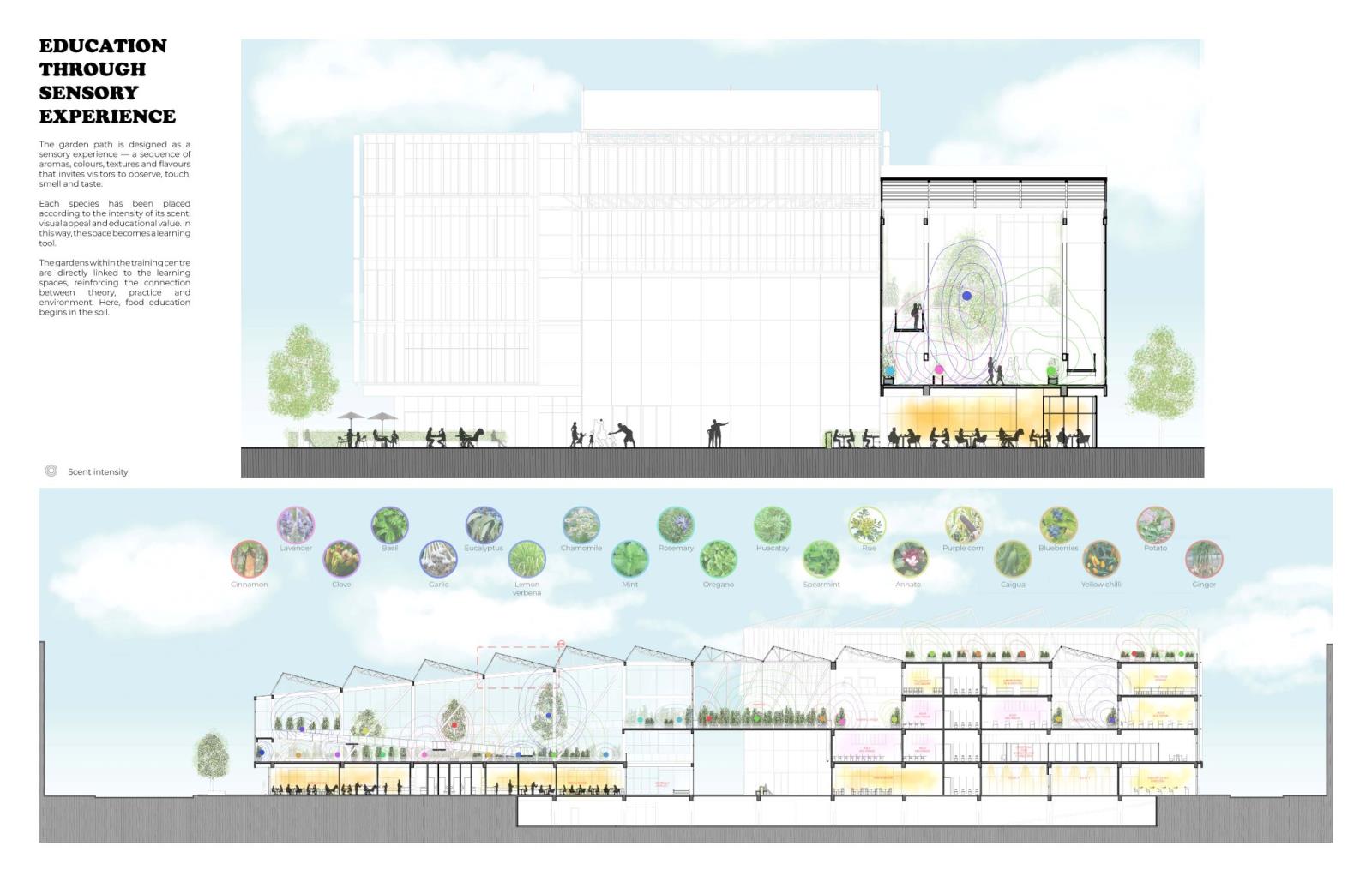 Public plazas surrounding the school host gastronomic fairs and street food, reinforcing food as a cultural and communal act. Edible gardens and open-air learning spaces are part of the educational programme, allowing students to engage directly with food cycles— growing, harvesting, preparing, and tasting.