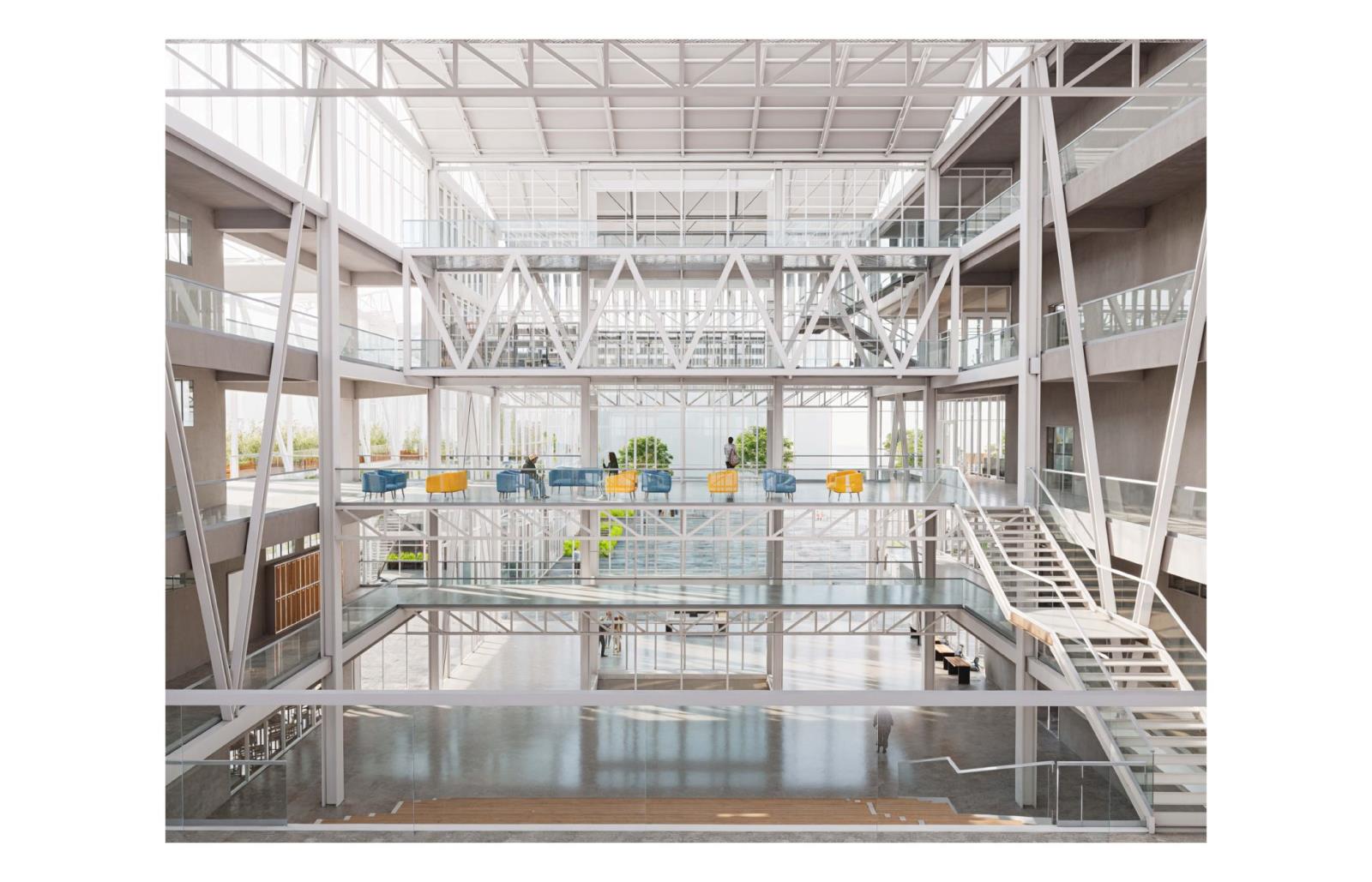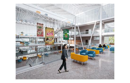 Two academic blocks are linked by a generous central space—a dynamic core for exhibitions, rest, and interaction. In contrast to conventional educational buildings organised around corridors and enclosed classrooms, this spatial arrangement prioritises user wellbeing, comfort, and connection.