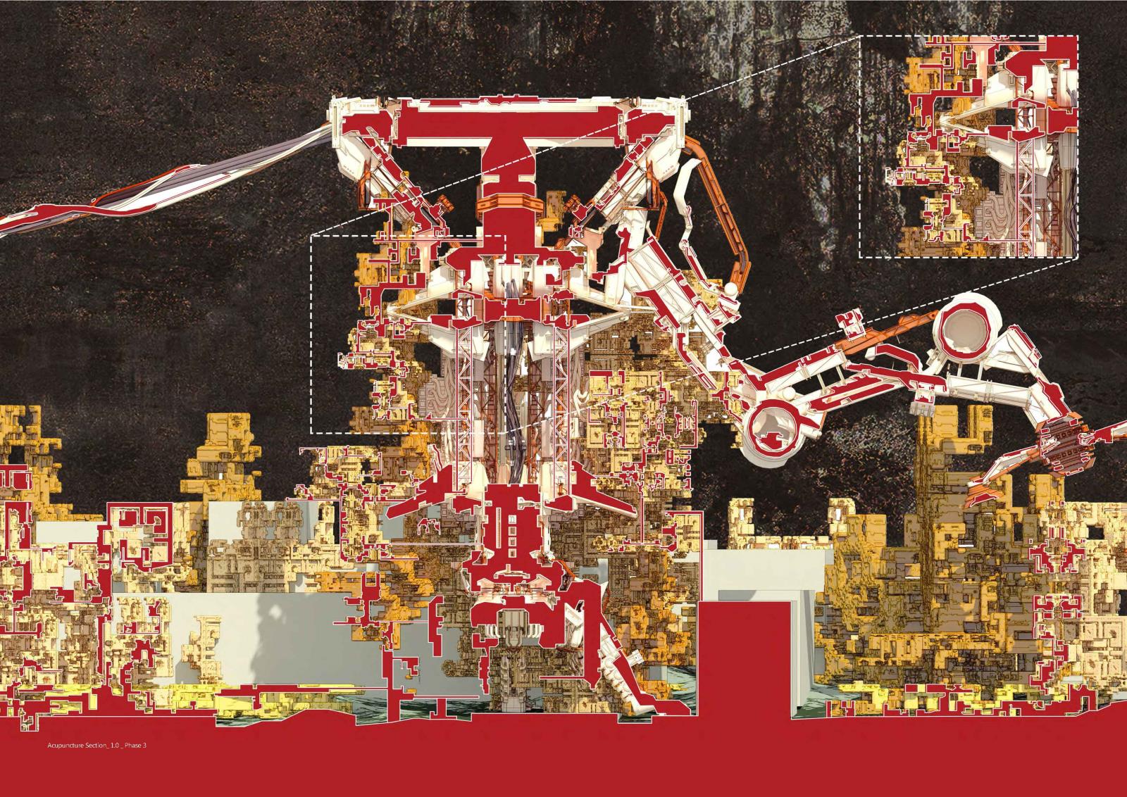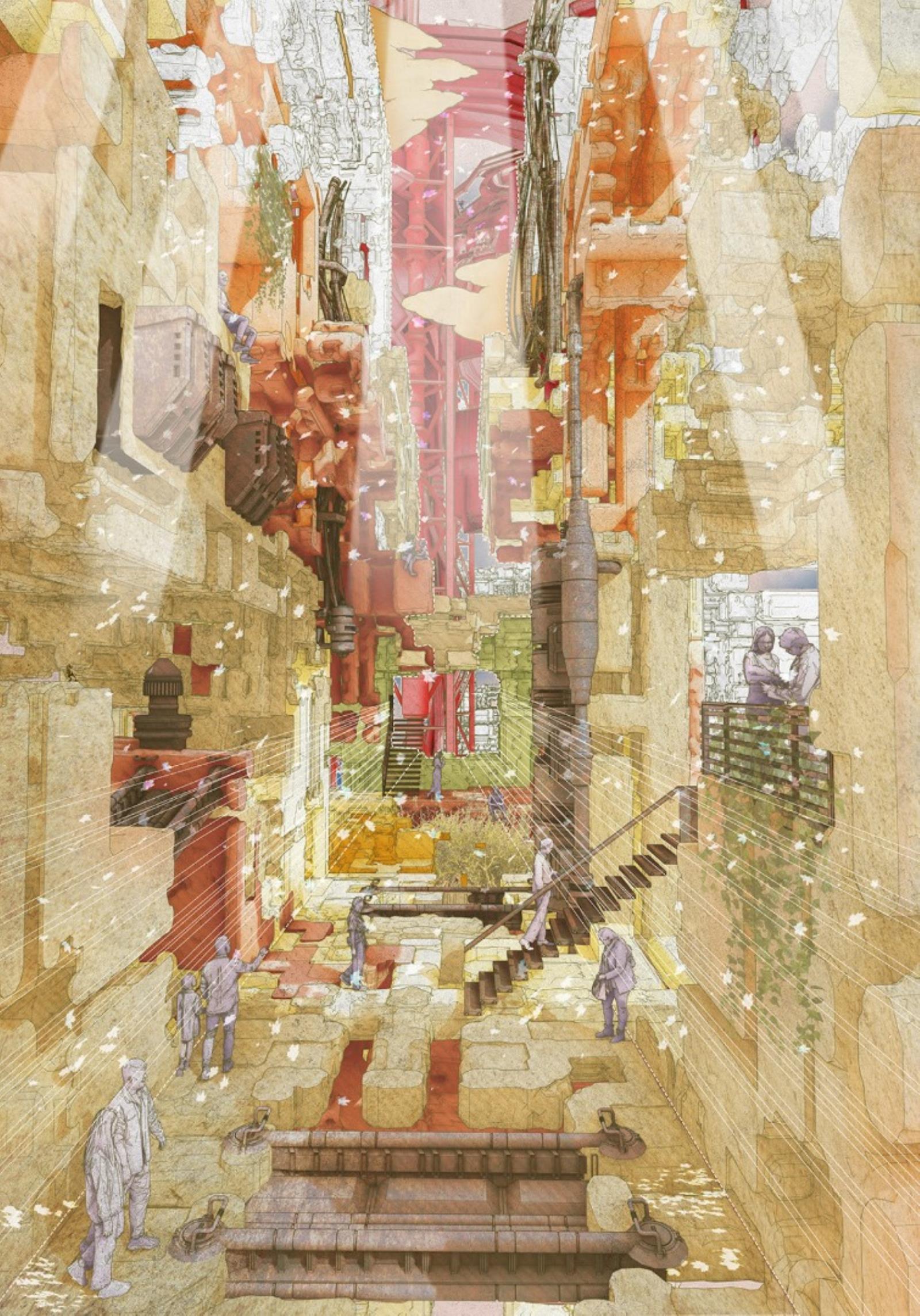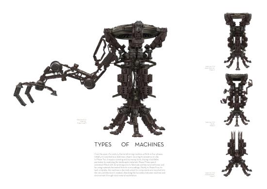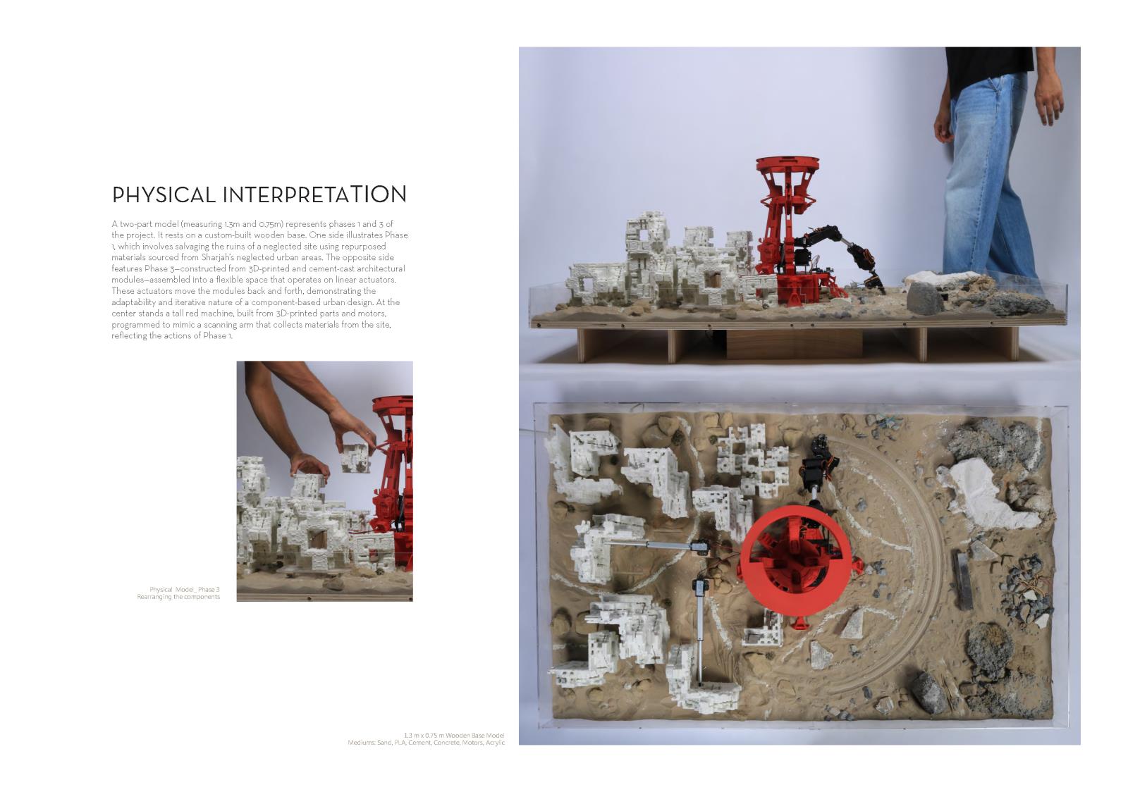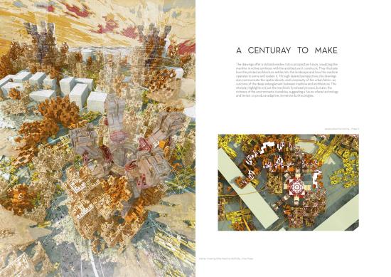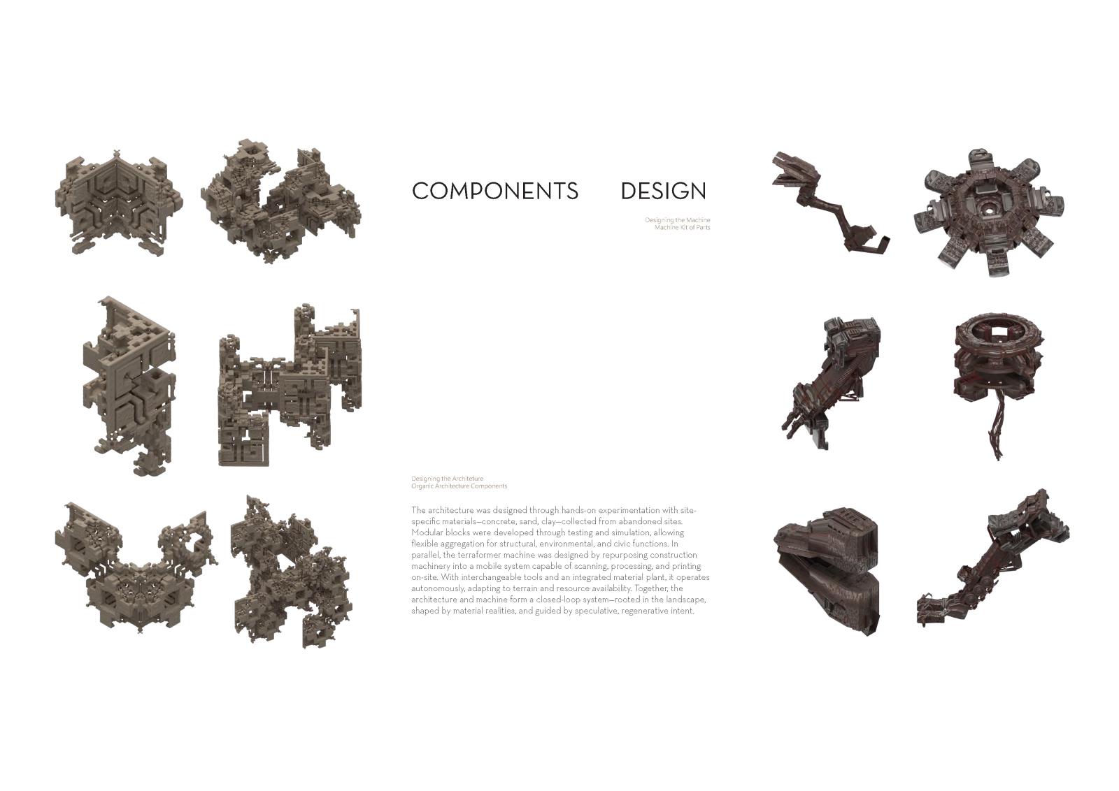 Inspired by Dubai’s large-scale land transformations, we propose autonomous “terraformers”—robotic machines functioning like giant 3D printers. These machines scan sites, collect materials, and produce architecture directly from what they gather. At their core, an industrial plant processes debris into filament for construction, merging advanced AI with ecological care.