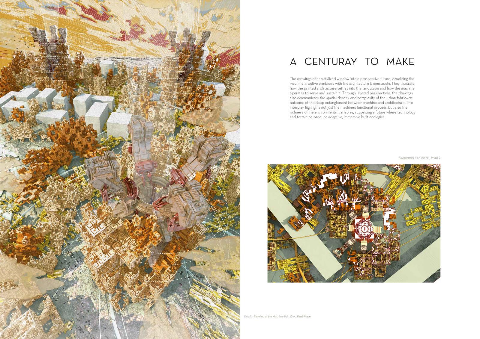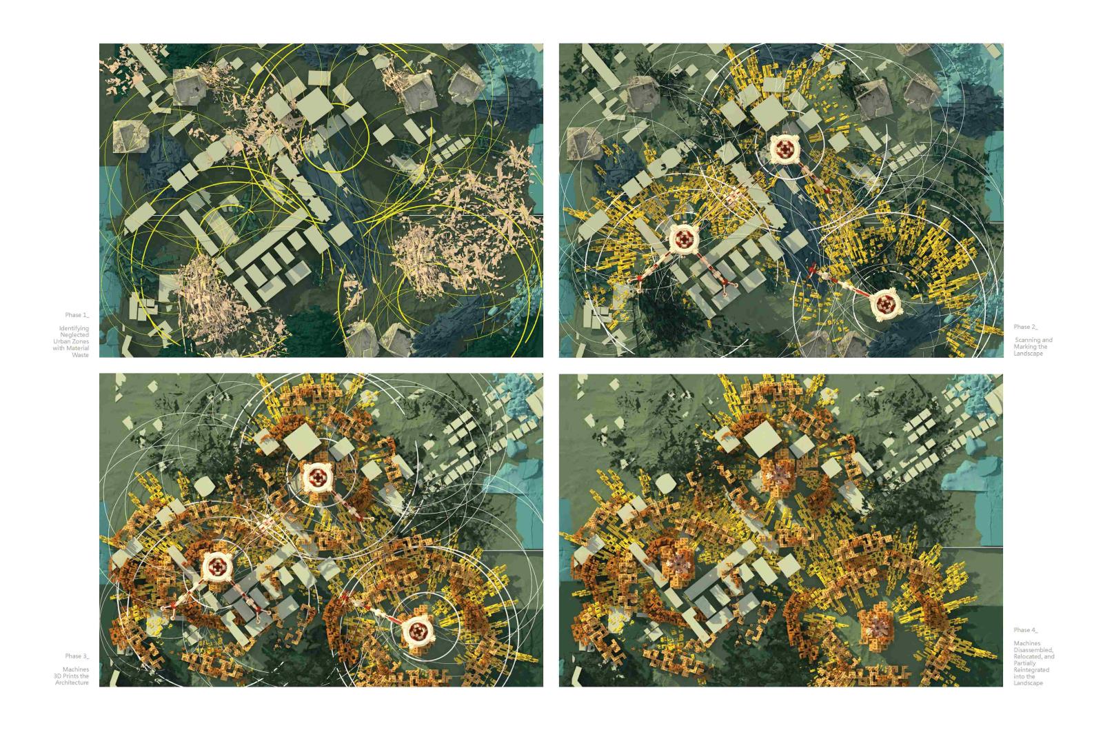 Our speculative design unfolds over decades: machines are deployed, prepare the terrain, build structures, then integrate into the completed habitats. The project speaks to architects, planners, researchers, and communities interested in innovative, adaptive urban solutions—proposing a way to redesign the landscape through the use of an automated object.