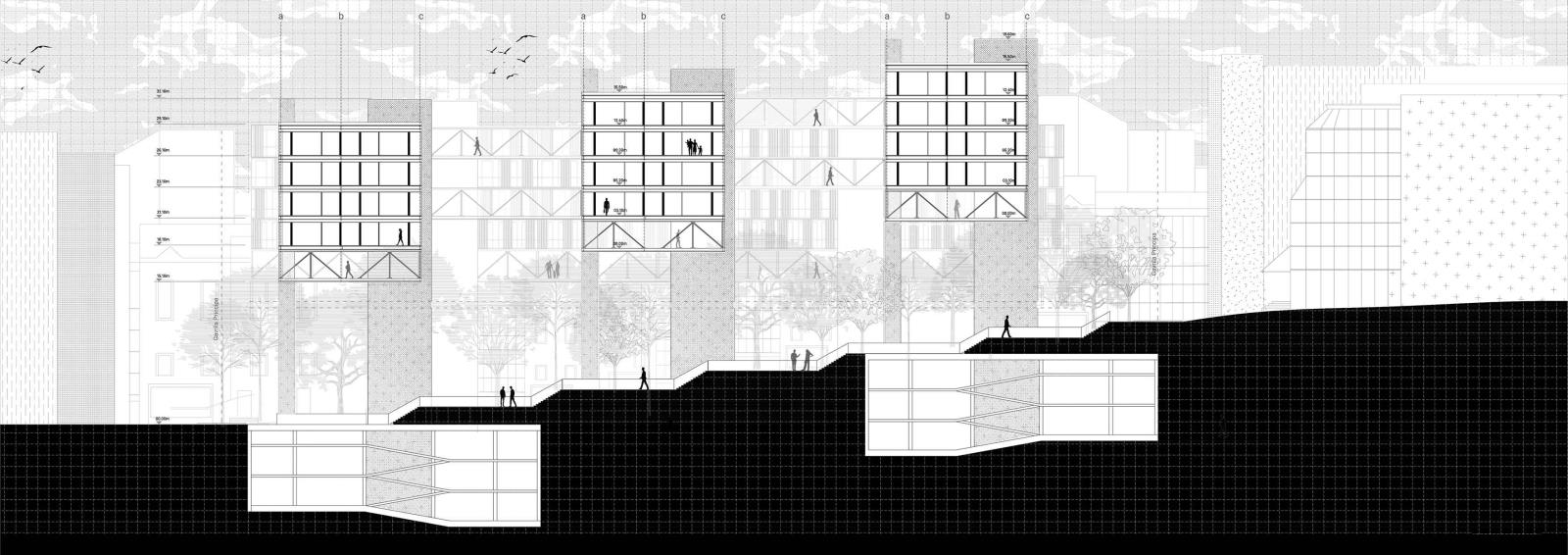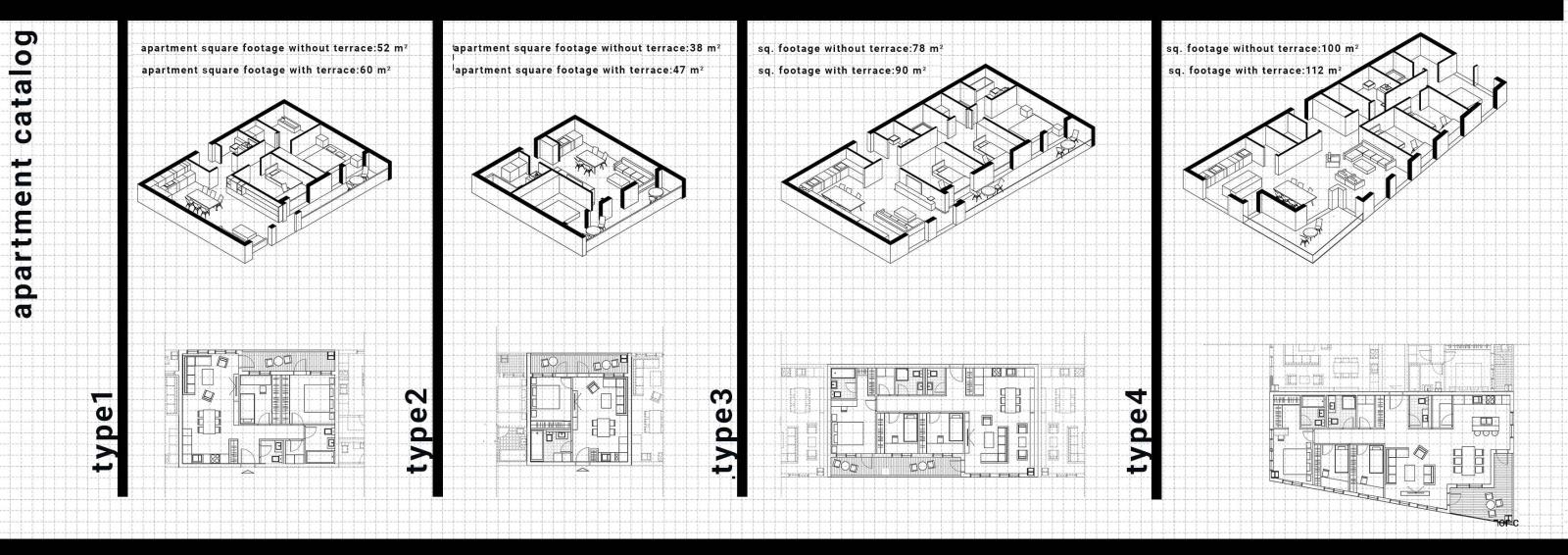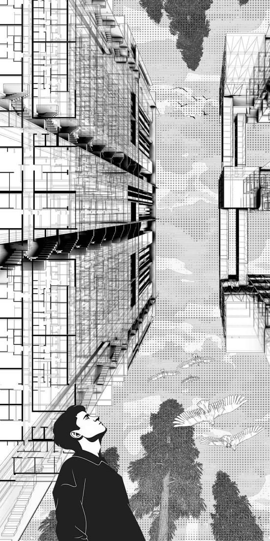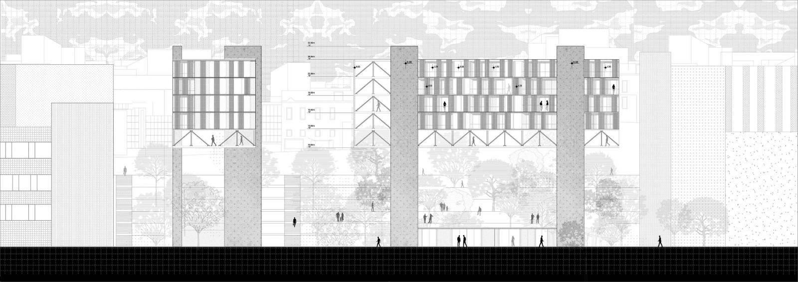 The project explores ways to introduce a higher level of comfort into residential living. Given the location’s high activity and dynamic character, elevating the residential units above street level enhances privacy, while the ground floor would be home to commercial buildings and a large amount of greenery that contribute to the environmental value of the entire complex. On each typical floor there is a common space that serves the residents for recreational activities and mutual communication. The core as a form of vertical communication connects the apartments, ground floor and garages below the building, which is important in order to increase the usable area on the ground floor and avoid a feeling of stuffiness. This free open floor is made possible due to a specific constructive system - floors are supported by lattice beams that transfer loads directly to the concrete core, eliminating the need for ground-level columns. The project aims to offer new perspectives on contemporary housing, with a focus on improving everyday living conditions.
