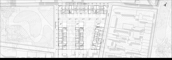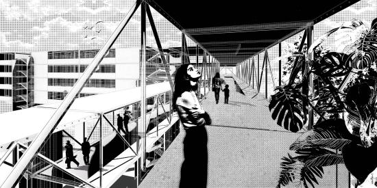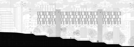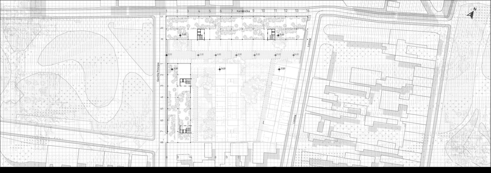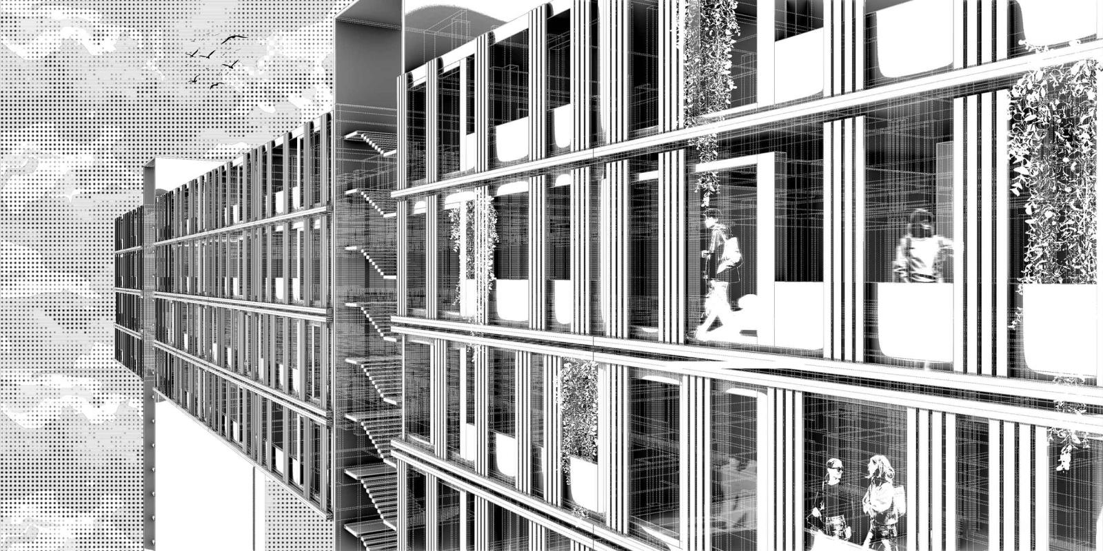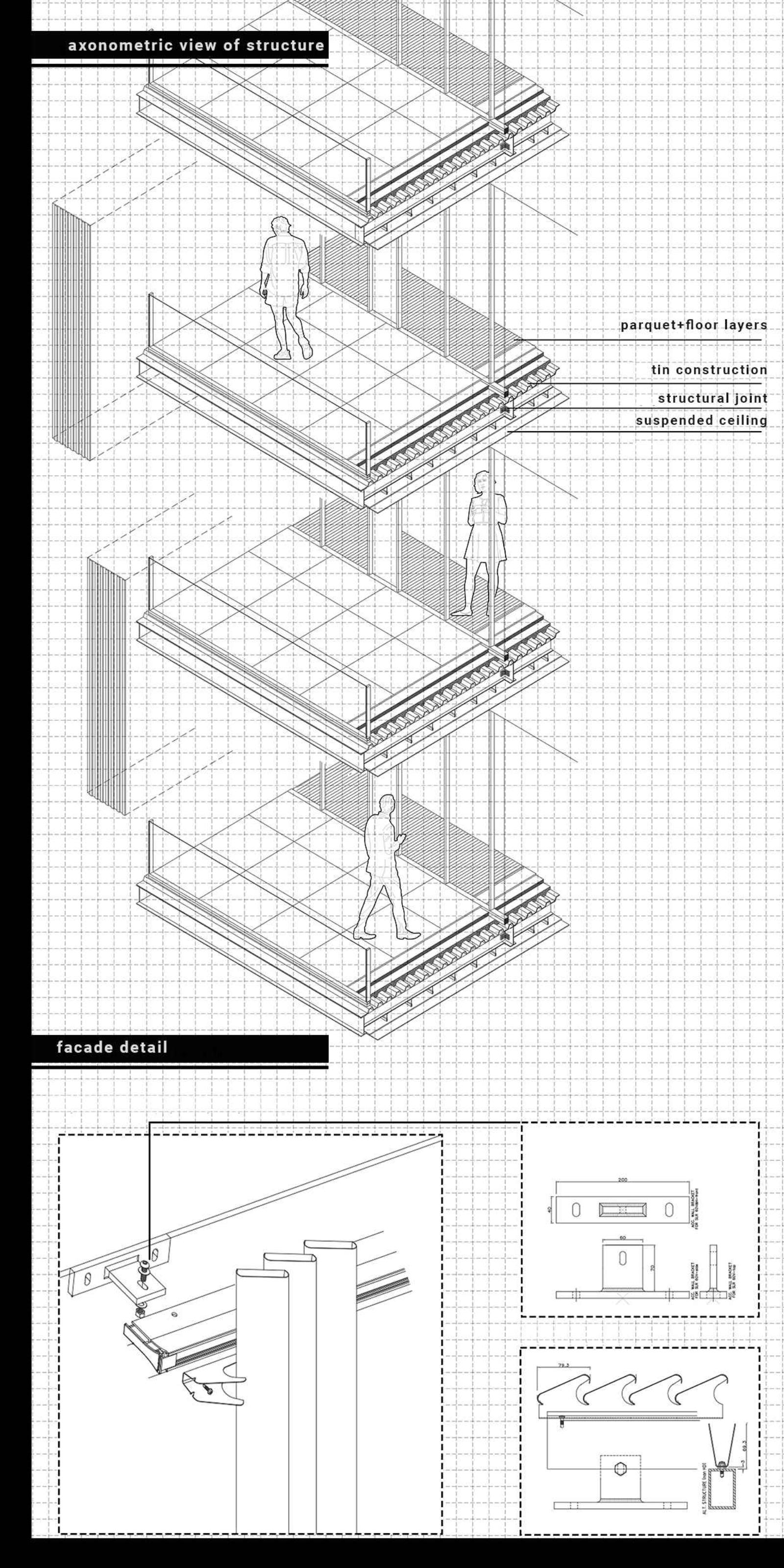 The project explores ways to introduce a higher level of comfort into residential living. Given the location’s high activity and dynamic character, elevating the residential units above street level enhances privacy, while the ground floor would be home to commercial buildings and a large amount of greenery that contribute to the environmental value of the entire complex. On each typical floor there is a common space that serves the residents for recreational activities and mutual communication. The core as a form of vertical communication connects the apartments, ground floor and garages below the building, which is important in order to increase the usable area on the ground floor and avoid a feeling of stuffiness. This free open floor is made possible due to a specific constructive system - floors are supported by lattice beams that transfer loads directly to the concrete core, eliminating the need for ground-level columns. The project aims to offer new perspectives on contemporary housing, with a focus on improving everyday living conditions.