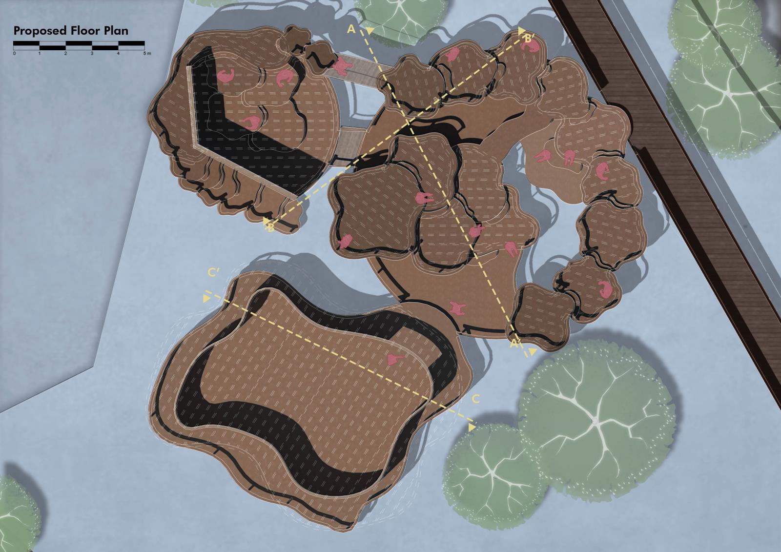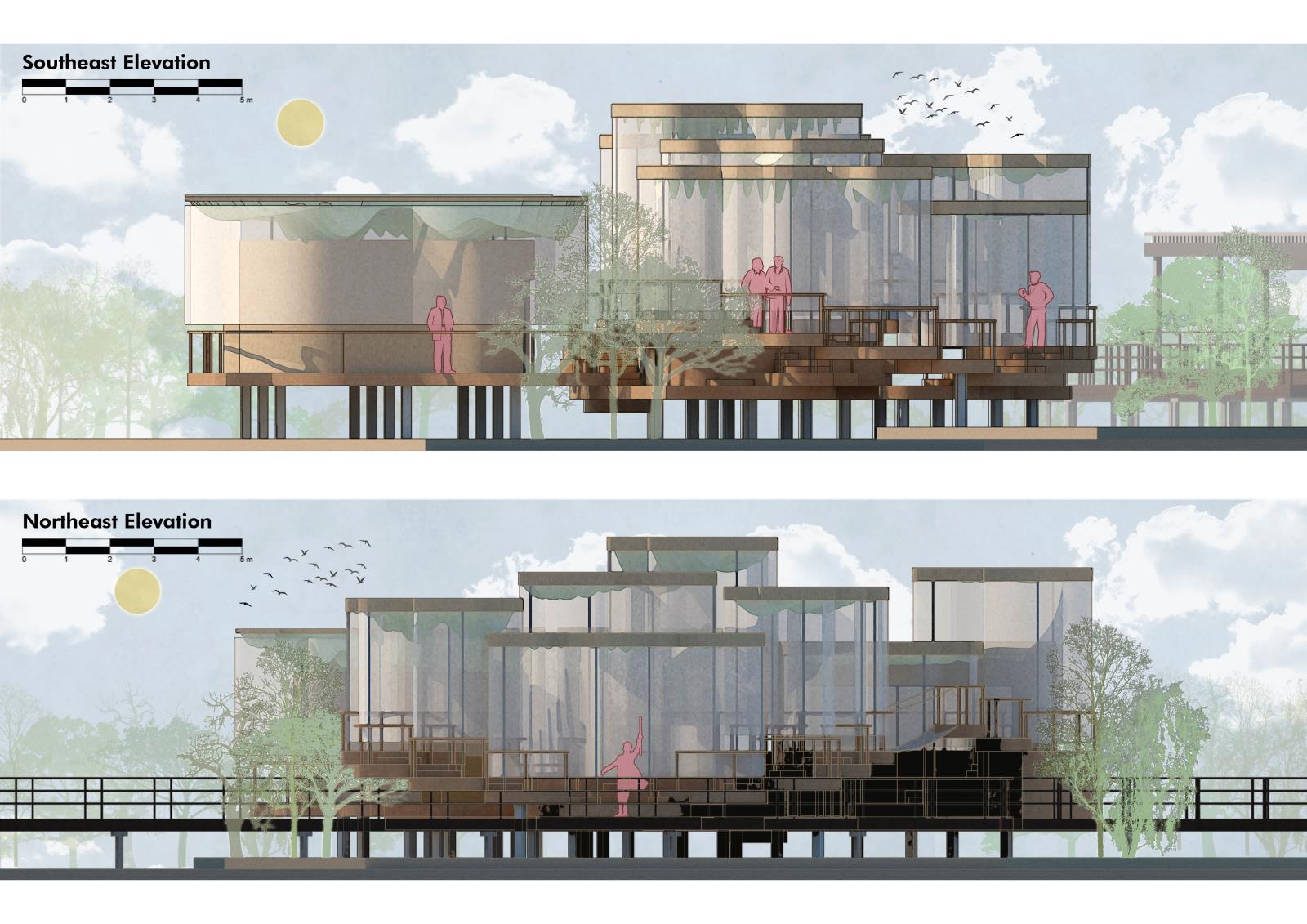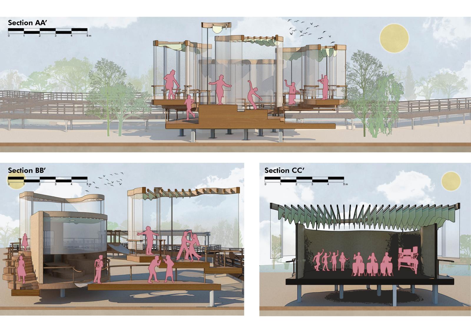 The project addressed the brief by creating a small-scale performing arts centre that aimed to make said arts accessible to people of all age groups and from different cultural and educational backgrounds. The project’s concept was to create a venue that attempts to redefine performance and blend with the surrounding mangrove environment, inspired by different musical films.