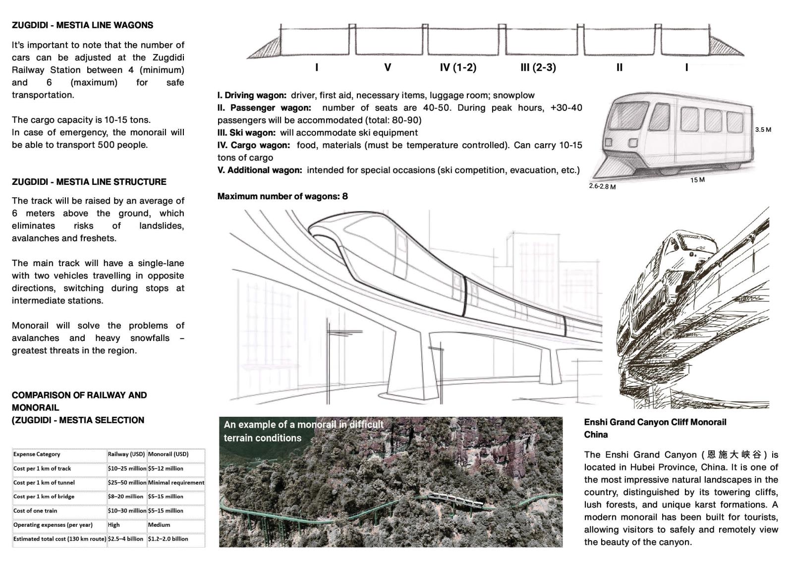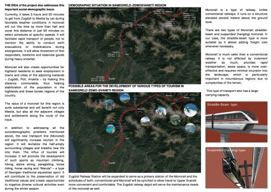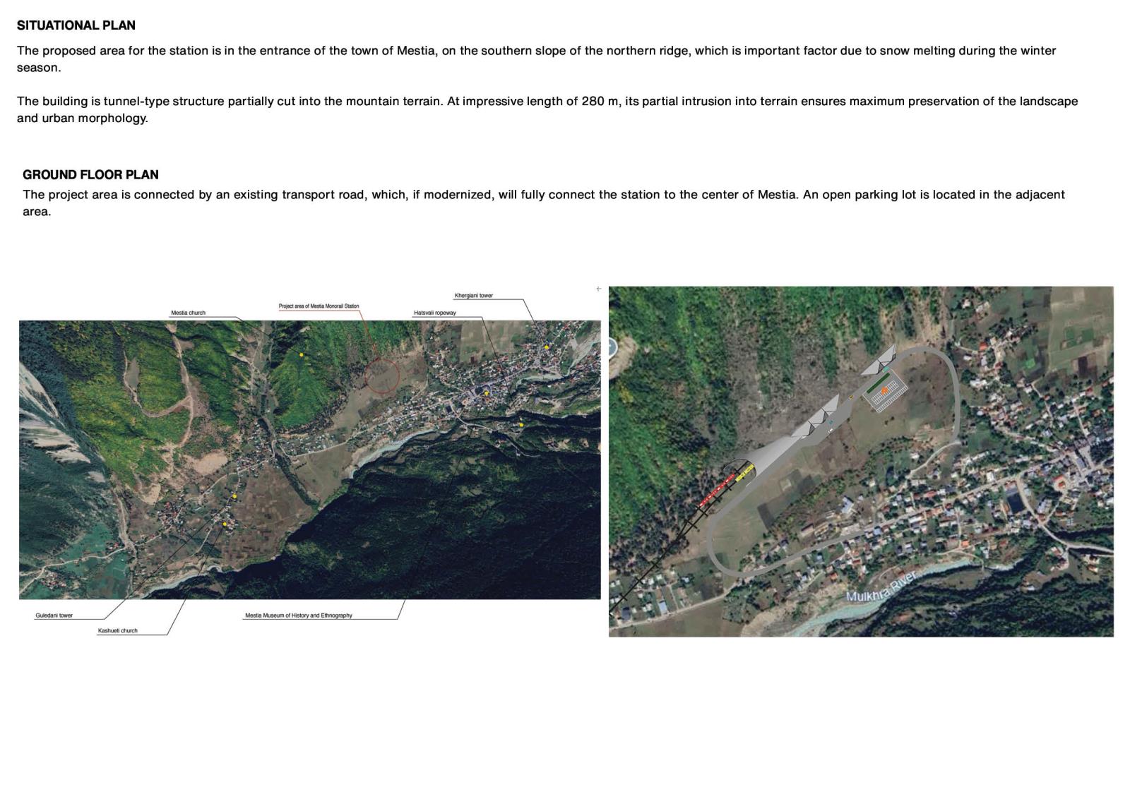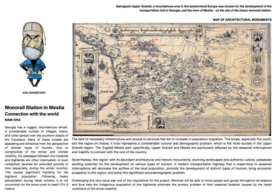 Monorail Station in Mestia: Connection with the world Part 1 Project 2025 Lizi Nioradze Caucasus University Tbilisi | Georgia This project envisions a sustainable electric monorail connecting Zugdidi to Mestia in Georgia’s Svaneti region—an area often isolated during winter due to extreme terrain and weather. The concept merges transportation infrastructure with social responsibility, aiming to bridge the physical and economic gap between remote mountain communities and urban centers.The primary aim is to ensure year-round, safe, and ecological mobility while preserving the natural landscape and cultural identity of the region. The monorail provides a clean alternative to traditional road expansion, reducing carbon emissions and preventing further damage to fragile ecosystems. By enabling access to education, healthcare, markets, and tourism, the project empowers local residents and fosters regional development.The outcome is not just a transit system, but a lifeline—a resilient thread connecting people, nature, and progress. Through careful integration of topography, weather conditions, and community needs, the project demonstrates how architecture and infrastructure can be tools for equity and inclusion.This work highlights the role of architects in reimagining mobility as a form of care. The Zugdidi–Mestia Monorail is a response to both environmental urgency and social isolation, proposing a visionary yet grounded approach to designing for remote futures. Tutor(s)