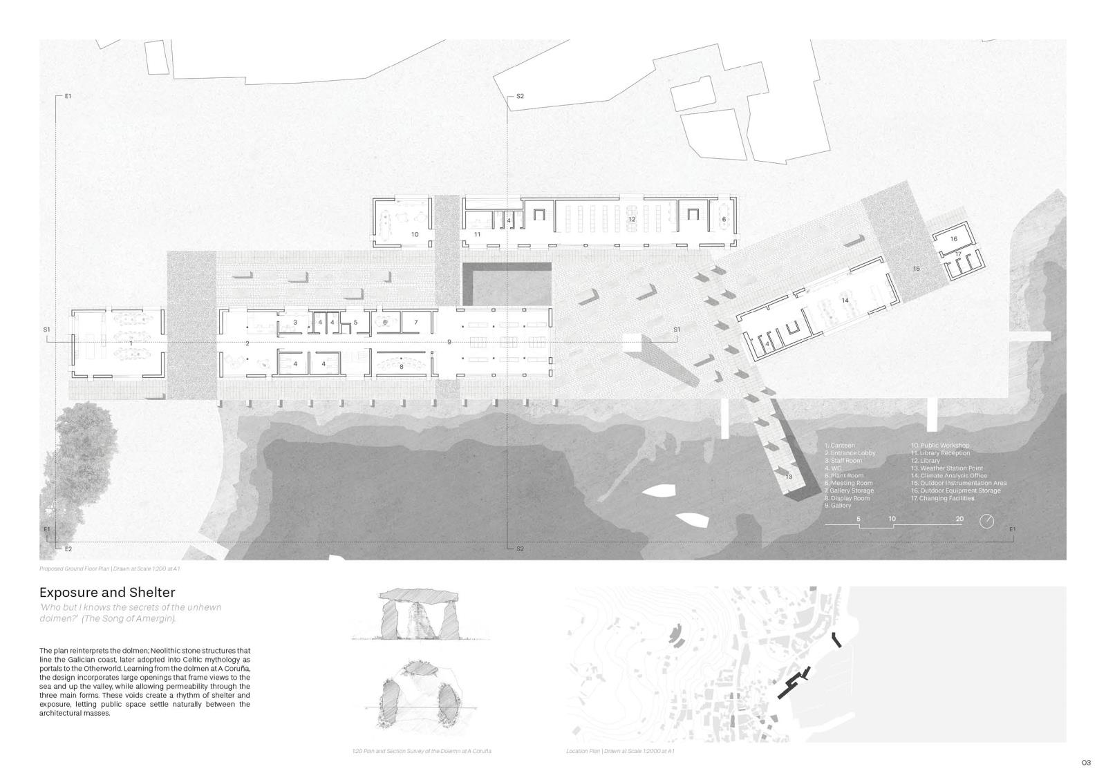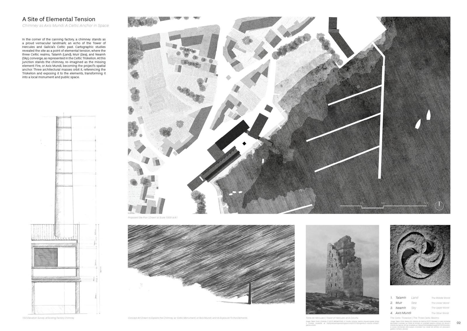 Located on the site of a former canning factory in the fishing village of Escarabote, Galicia (northern Spain), this project proposes "The Galician Institute of Celtic Studies", or a "Meteorological Research Station", as an exploration of Galician identity.