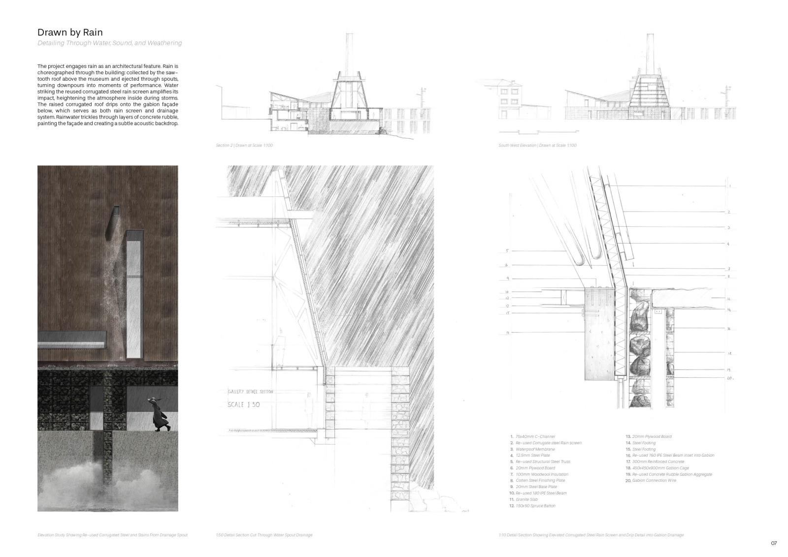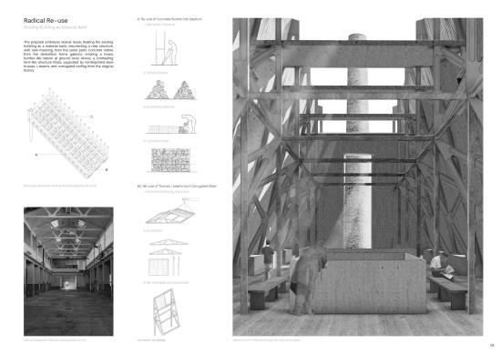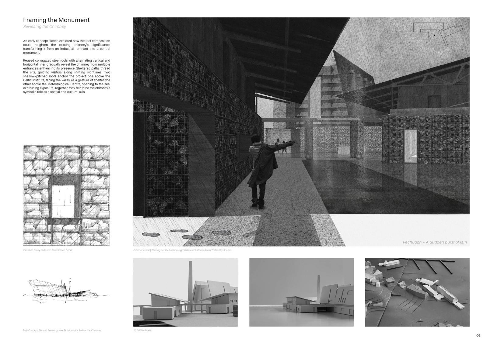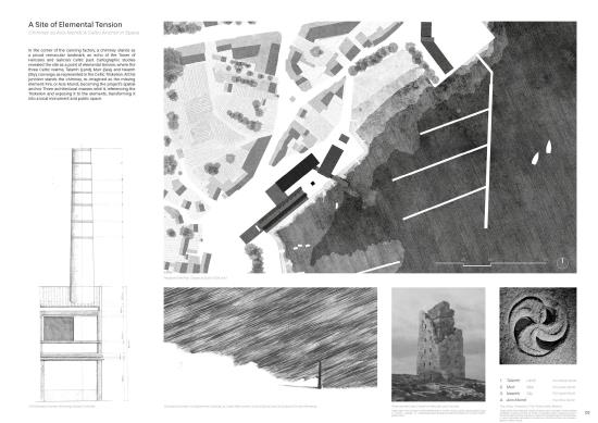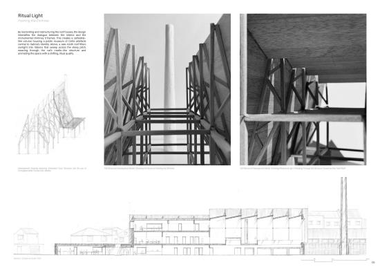 The proposal operates on two levels: a weather station addressing the global climate crisis, and an Institute of Celtic Studies serving regional cultural needs. It radically reuses the existing structure as a material bank, resurrecting a new form from the same parts.