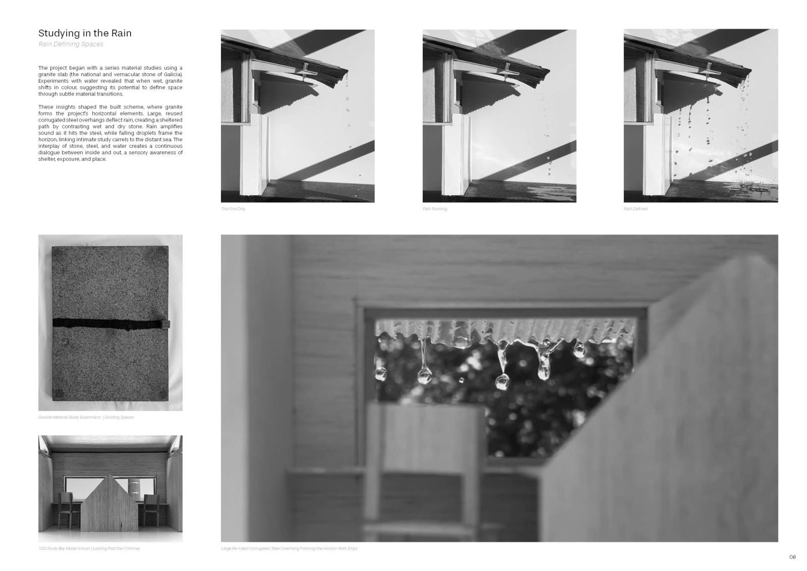 This project asks how learning spaces engage with natural elements, especially rain, immersing students, researchers, and locals in what it means *to be Galician*. The design draws on local myths and structures, rooting it in place, people, and history.