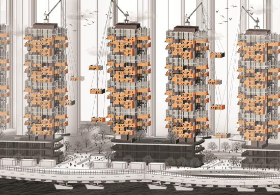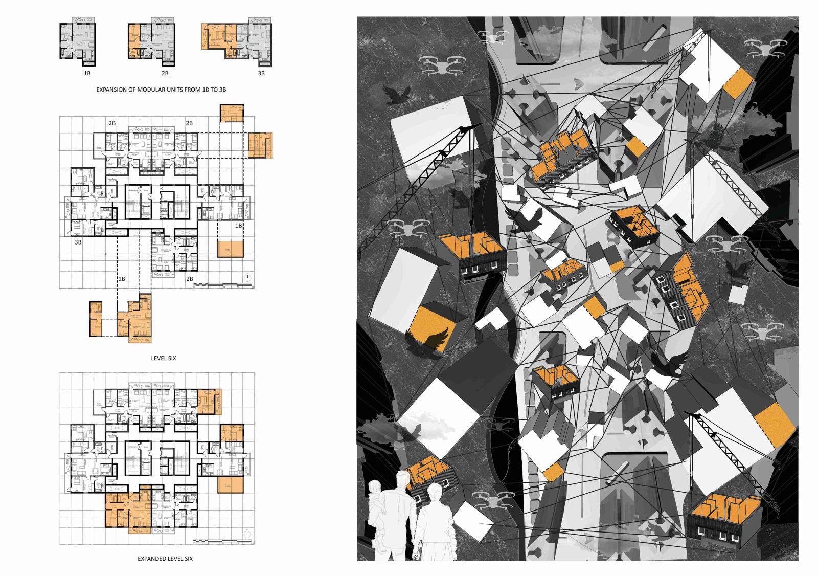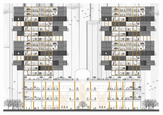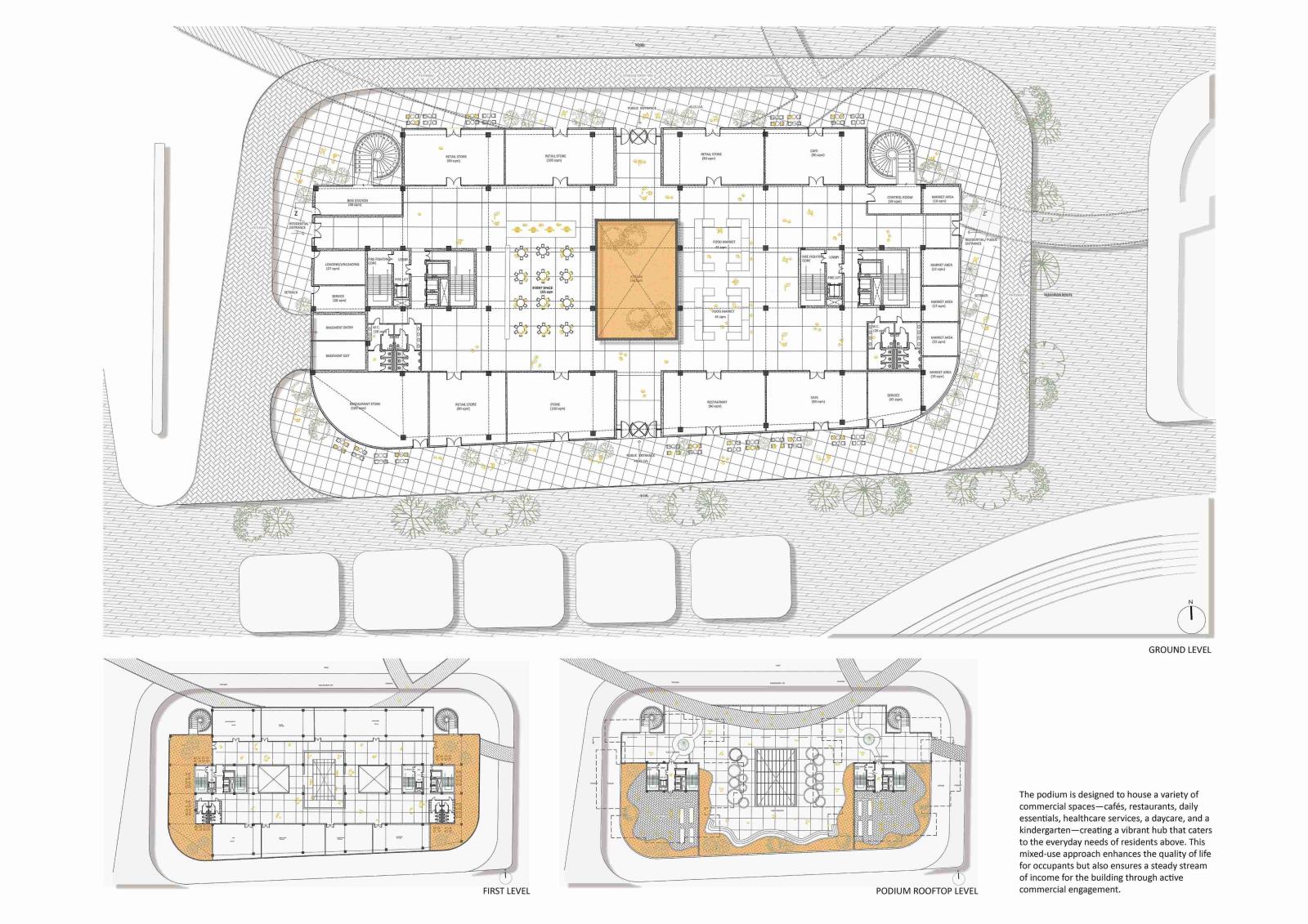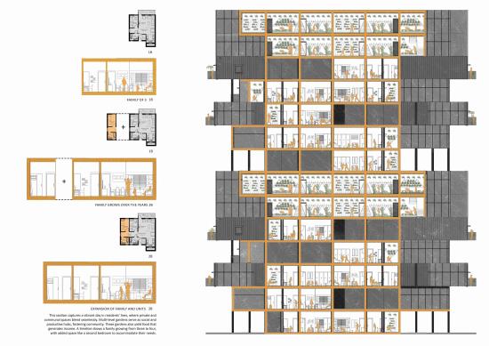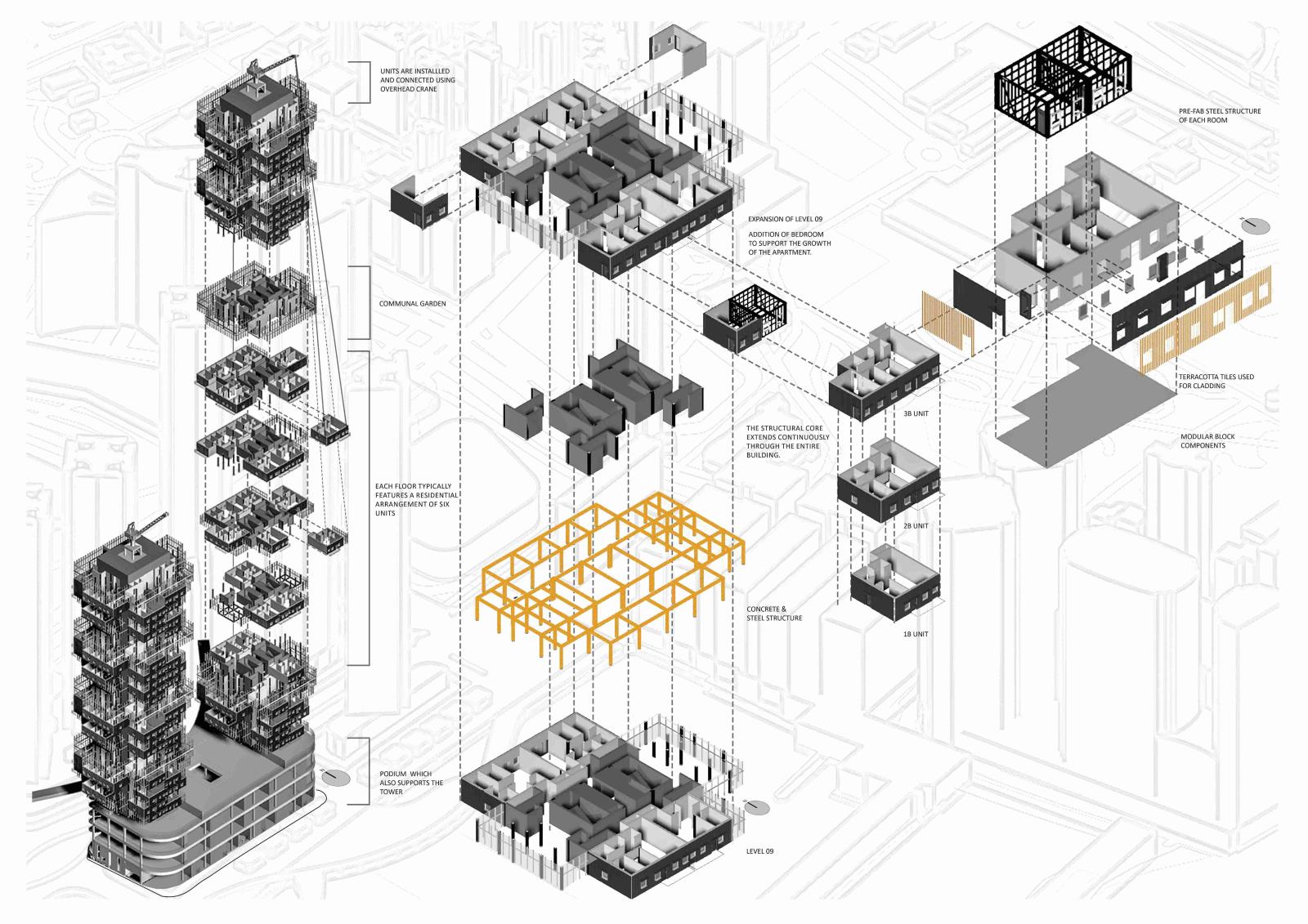 A key design aim is to create a system that grows over time adaptive rather than static through plug-in method. The Living Grid is both climate- and user-responsive, allowing spaces to evolve with changing needs. Communal gardens support food production and are monetised at the podium level, promoting shared economic and environmental value.