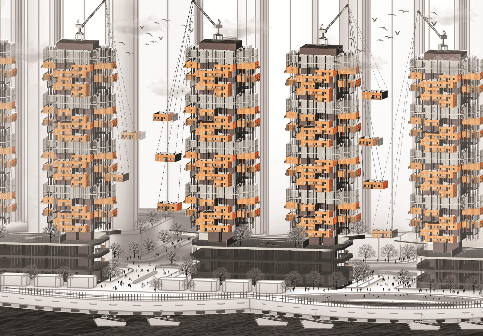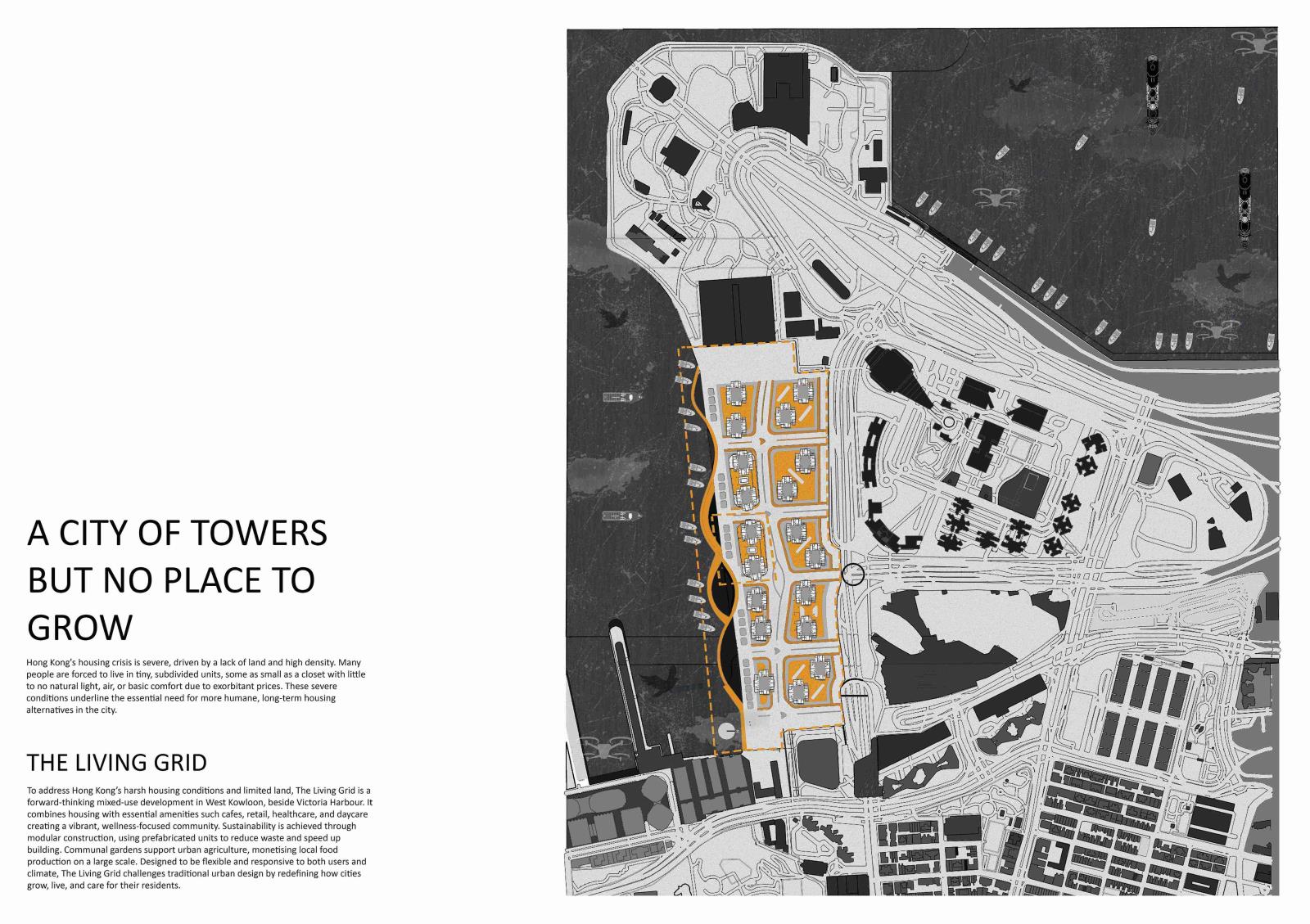 The Living Grid is a forward-thinking response to Hong Kong’s housing crisis, where extreme density and limited land have led to inadequate living conditions for many. Located on the edge of Victoria Harbour in West Kowloon, the project reimagines urban development as a dynamic, community-focused ecosystem.
