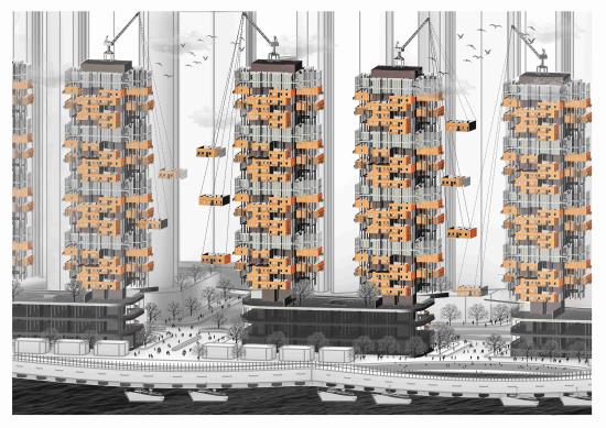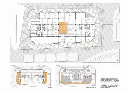 This mixed-use proposal integrates housing with essential daily services such as cafes, healthcare, childcare, and retail within a walkable, wellness-oriented environment. Sustainability is embedded through modular construction, using prefabricated units to minimise waste and accelerate delivery.