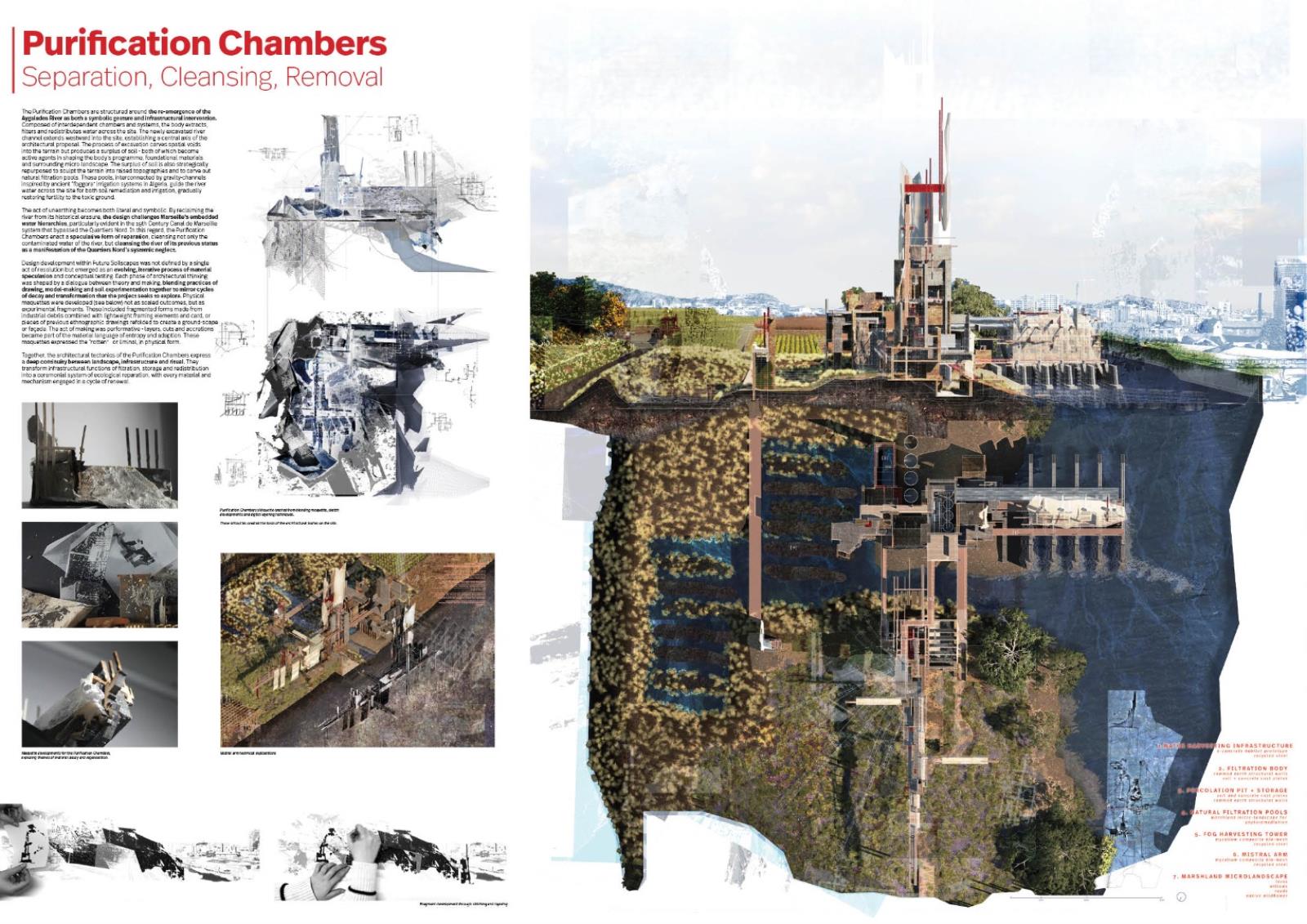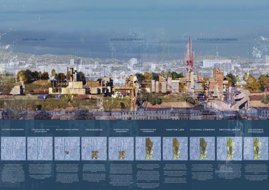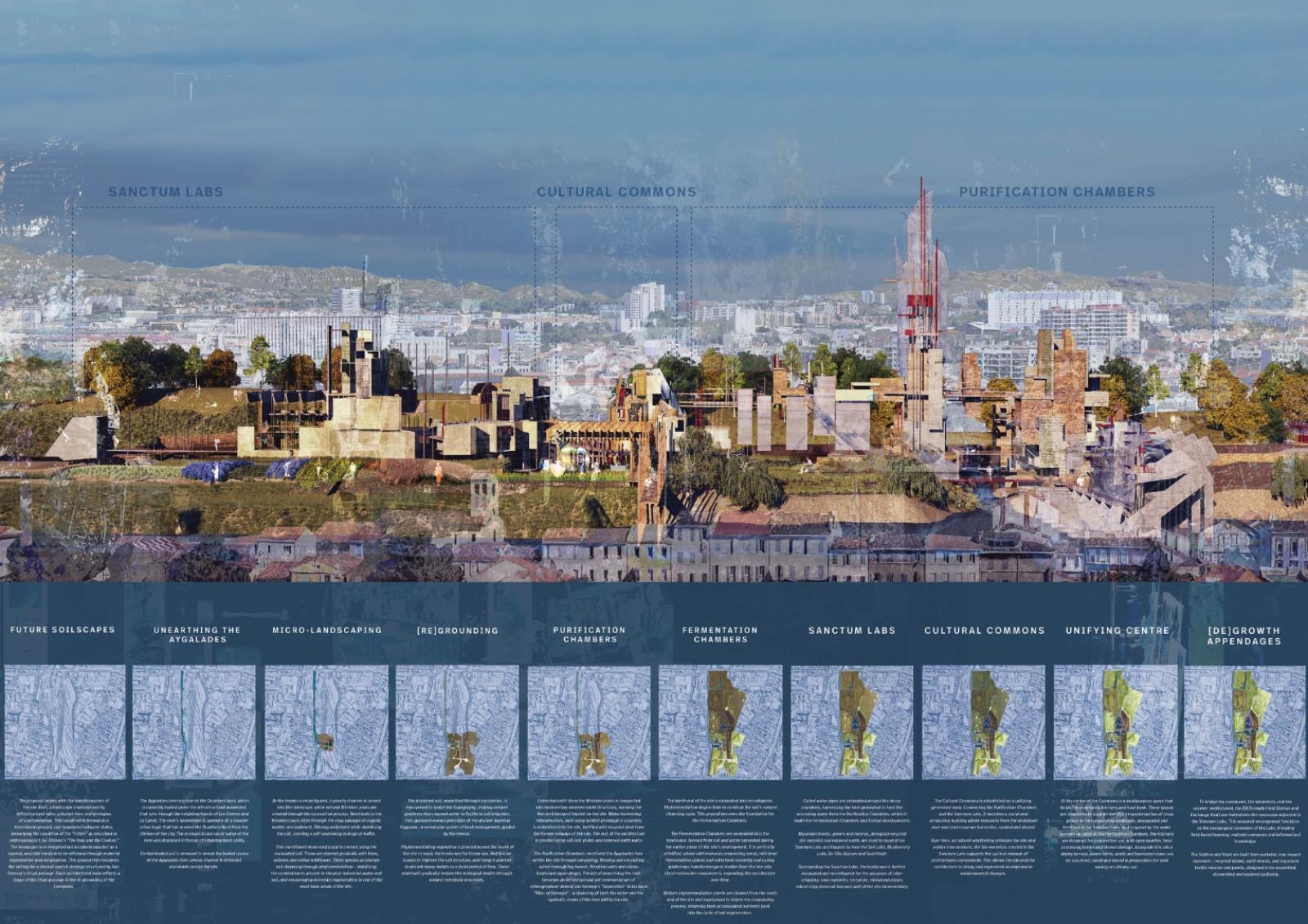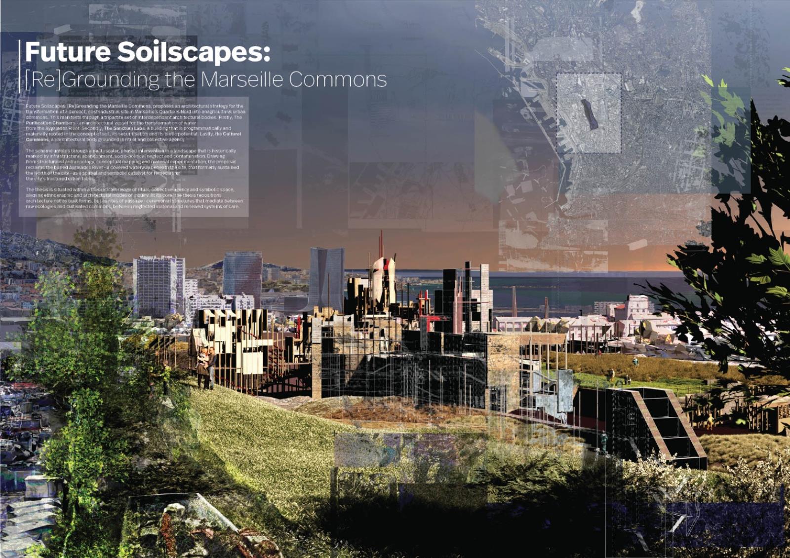 Future Soilscapes: [Re]Grounding the Marseille Commons proposes an architectural strategy to transform a derelict post-industrial site in Marseille’s Quartiers Nord into a renewed urban commons. The design unfolds through three interdependent architectural bodies: the Purification Chambers, the Sanctum Labs, and the Cultural Commons, set within a multi-scalar reconfiguration of the site’s landscape.