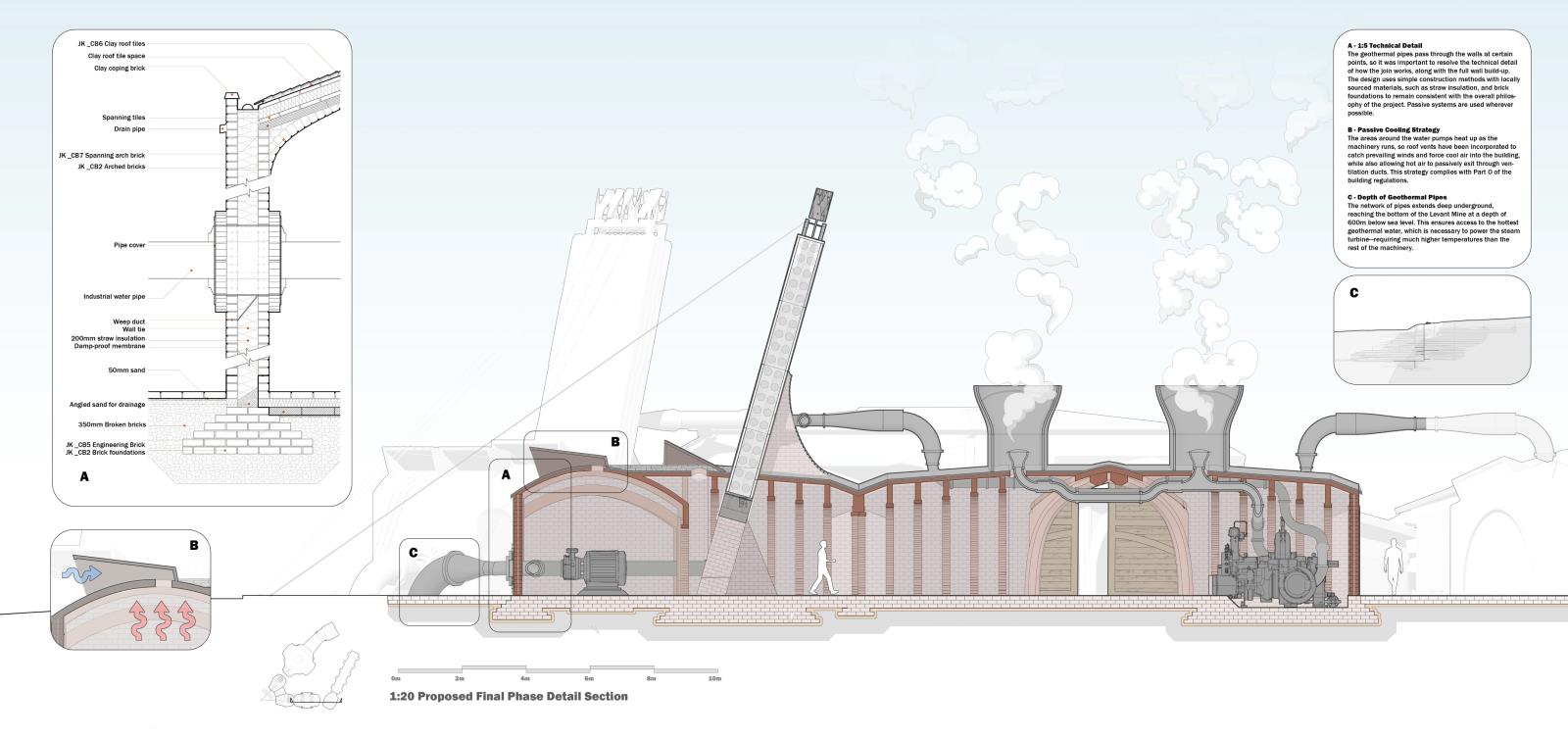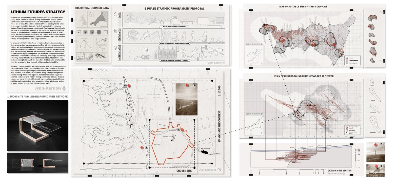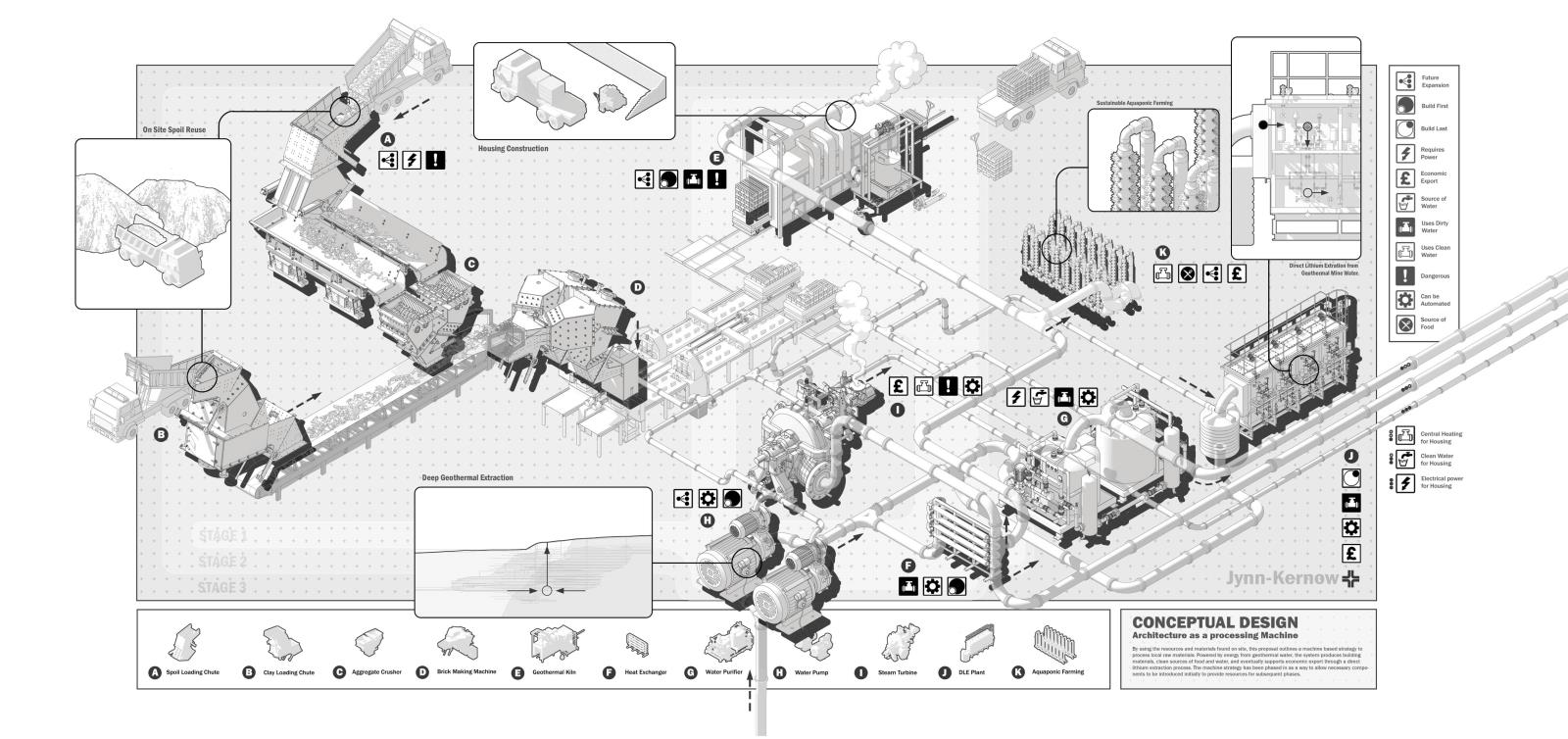 Jynn Kernow, which translates to The Cornish Machine in its native language, is a proposal grounded in Cornwall’s mining heritage and designed to support its future as lithium extraction returns to the region. Located at the historic Geevor Tin Mine, the project offers a phased approach to industrial development that prioritizes resilience, self-sufficiency and community stability.