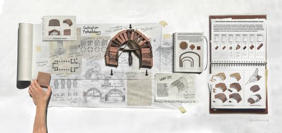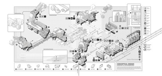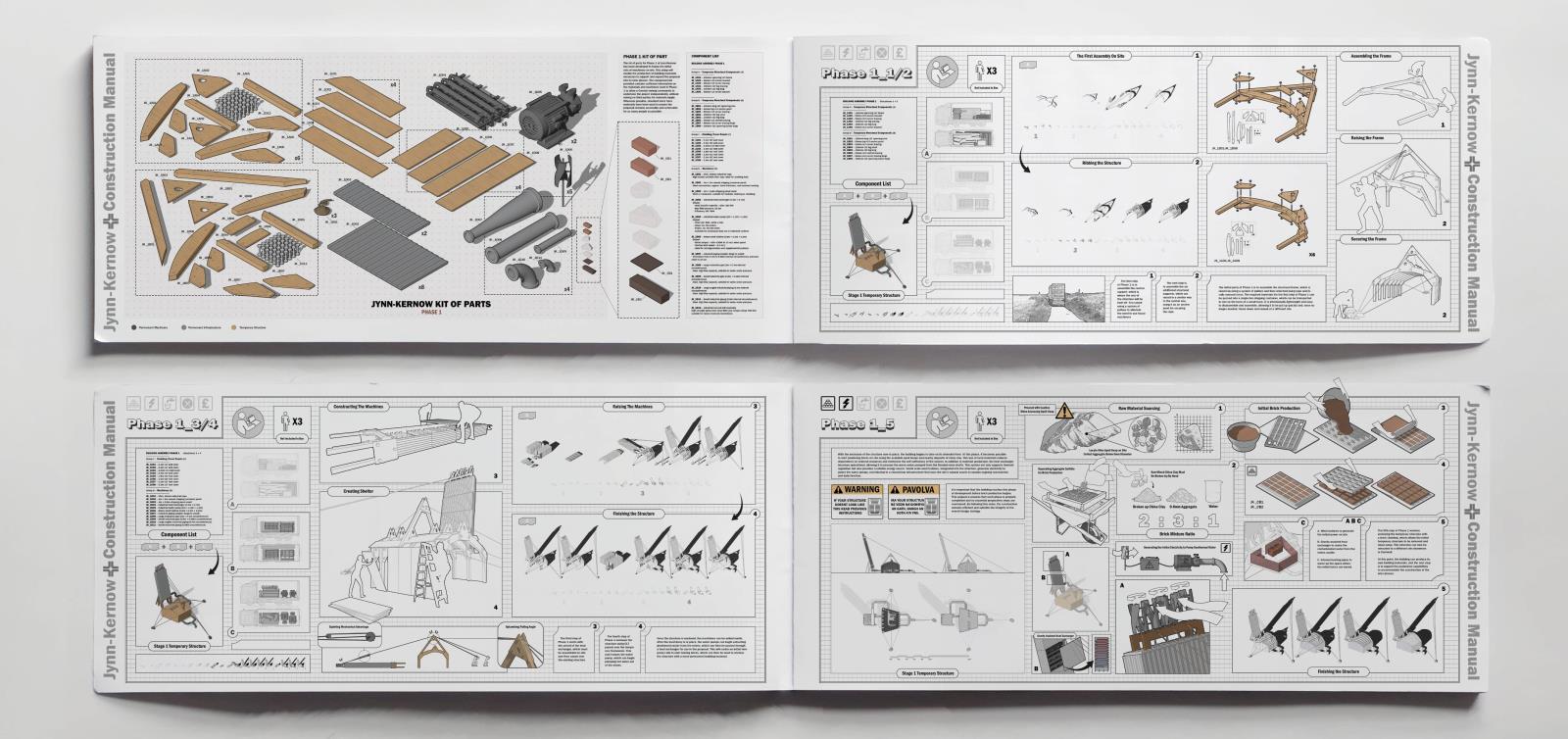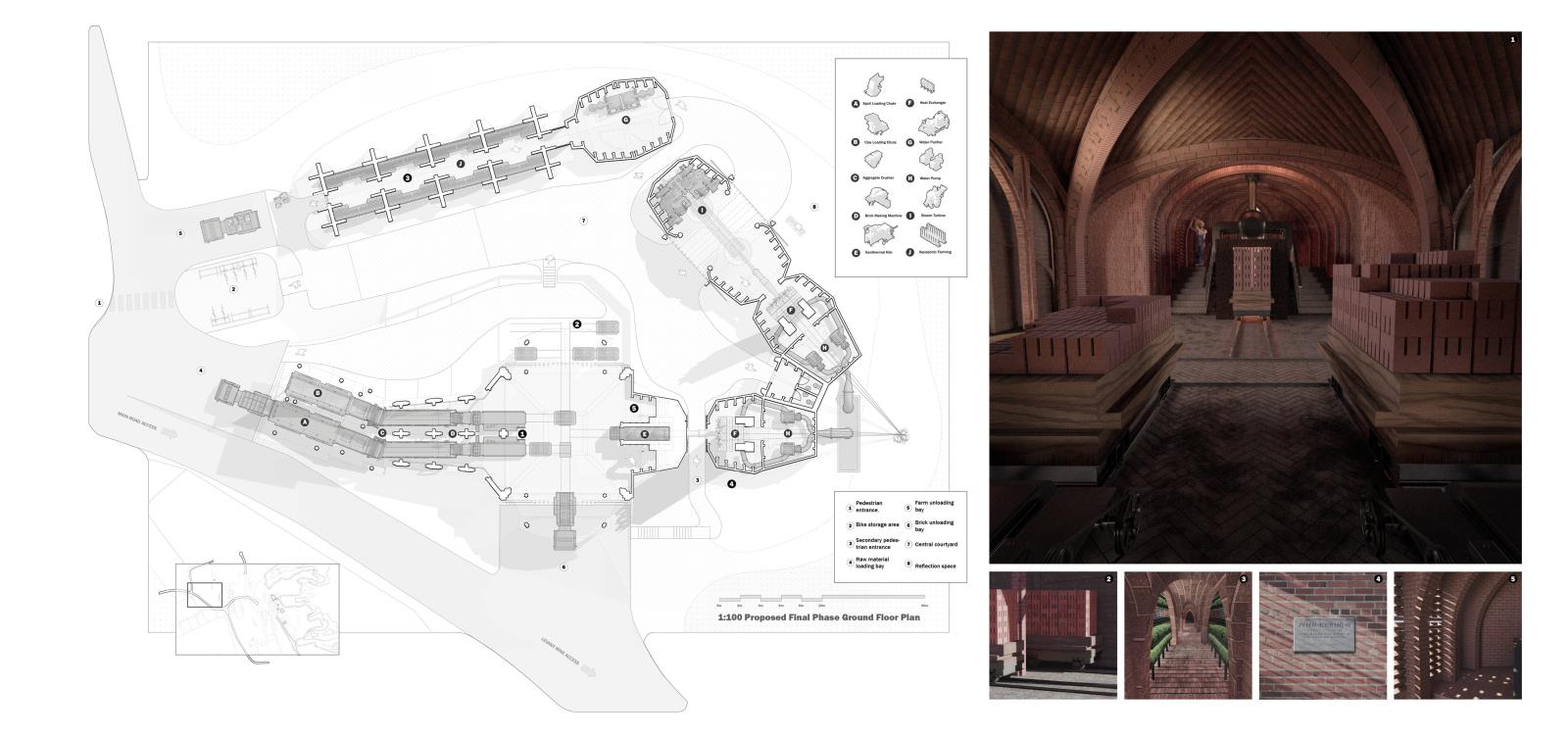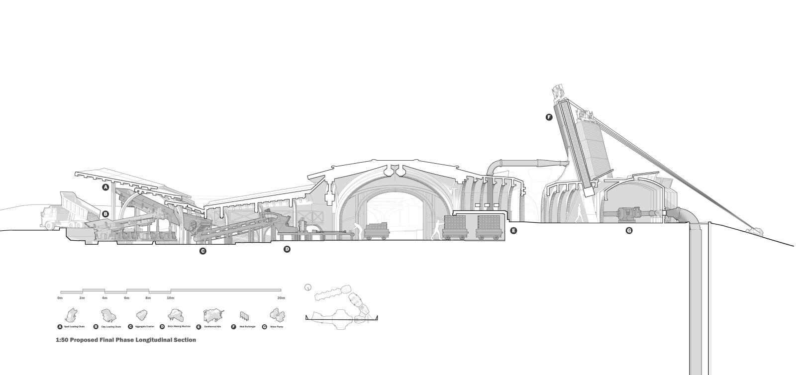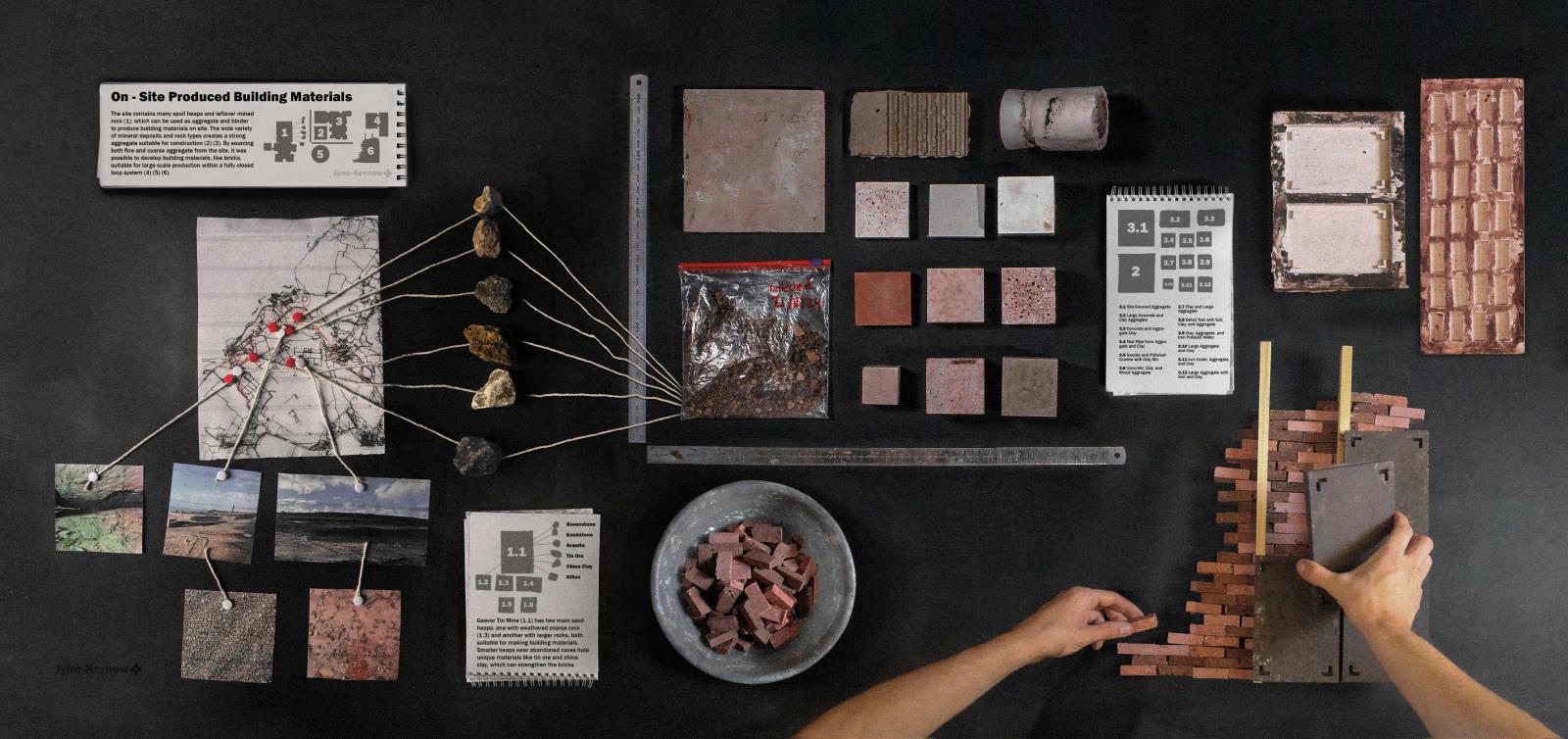 The proposal begins with resources already on site, including mineral spoil heaps and geothermal heat from flooded mine shafts. Phase 1 starts with the construction of a building, assembled without heavy machinery, using a lightweight kit that evolves into a permanent structure. This creates the foundation for a self-sustaining system.
