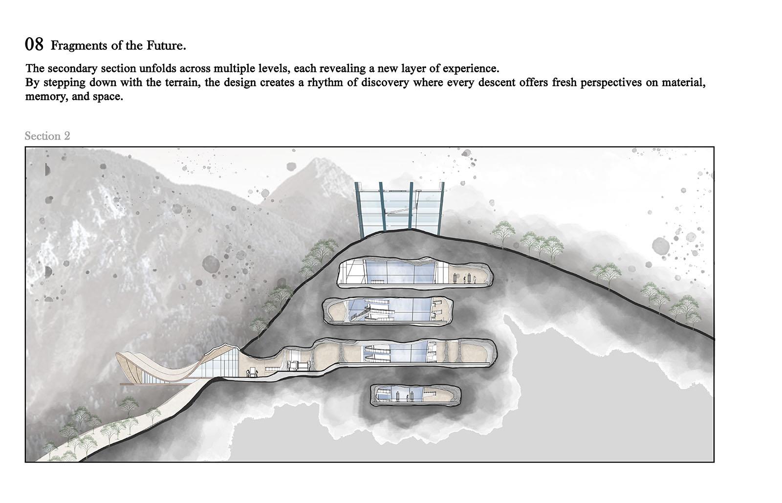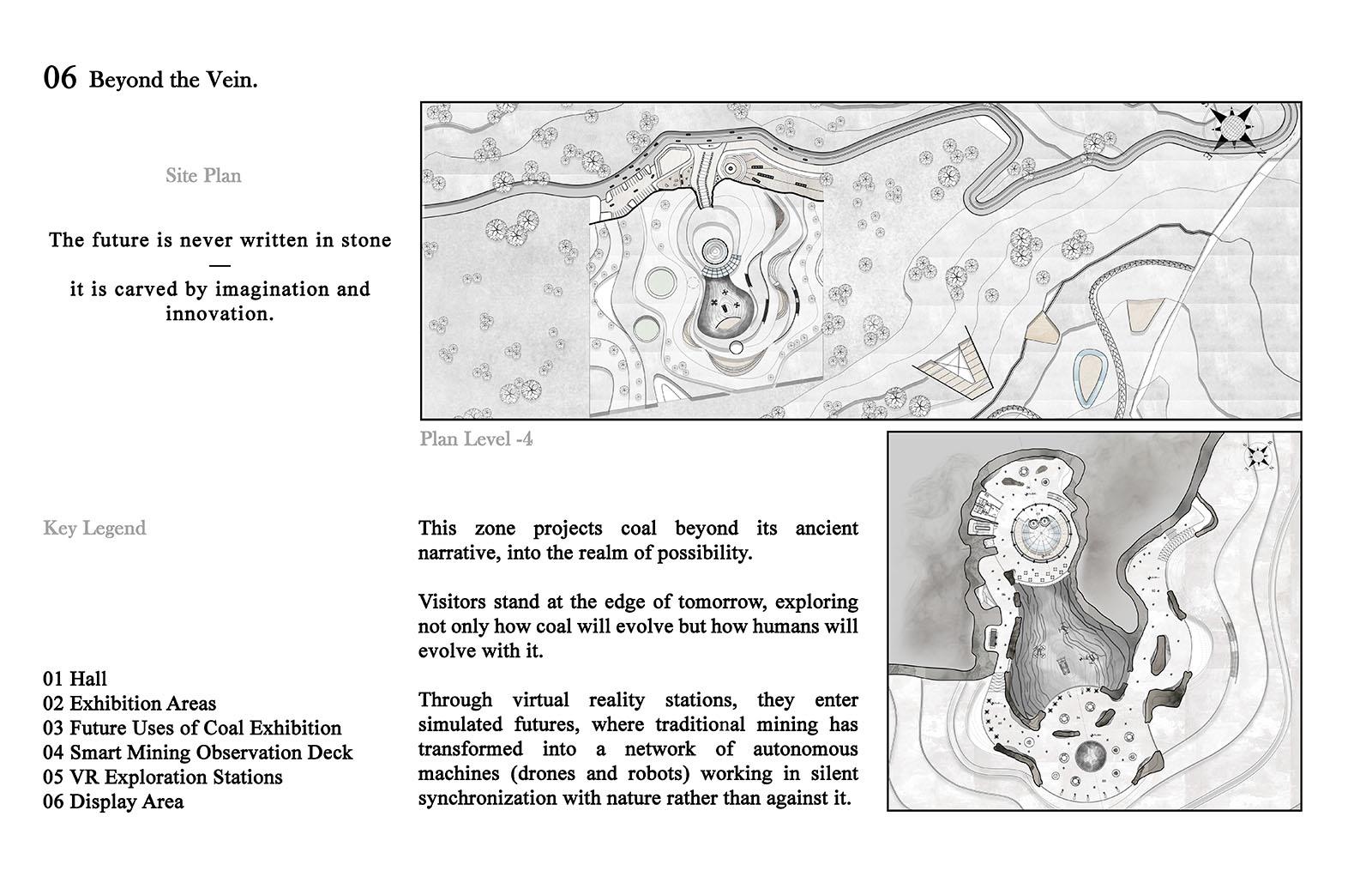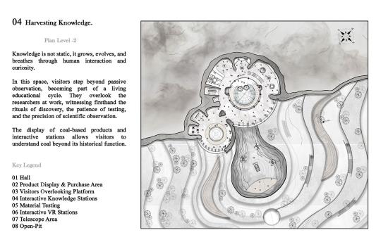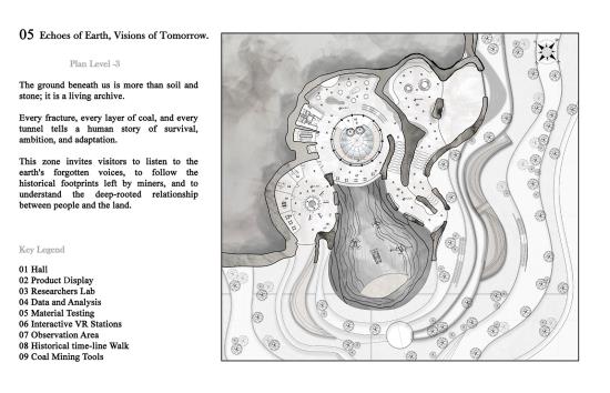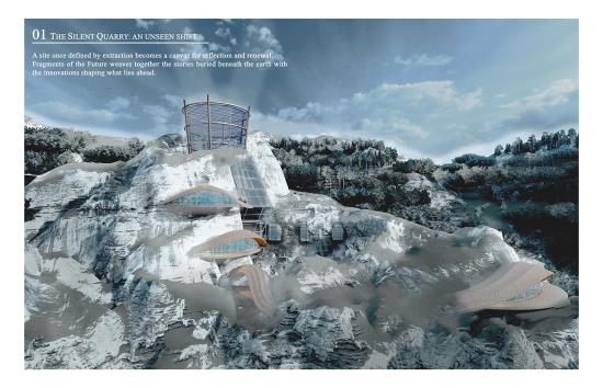The Silent Quarry: An unseen shift Part 2 Project 2025 Aya El Charif Beirut Arab University - Debbieh campus | Lebanon 'The Silent Quarry' represents forgotten industrial landscapes where extraction left no legacy. This project activates one such anonymous site to reveal coal’s untapped potential. An Unseen Shift embodies the transformative idea that this maligned resource can transcend its dirty past, becoming the foundation for medical innovations, advanced materials, and ecological repair.Architecture emerges from the land itself, using rammed earth and reconstituted coal to form spaces that mirror geological strata. Where miners once extracted fuel, researchers now develop coal-derived technologies: porous scaffolds for tissue regeneration, purified carbon for cosmetics, and smart filters for environmental remediation. Visitors move through immersive exhibits contrasting mining relics with biotech prototypes, tracing this material’s radical reinvention.Jean Nouvel’s mandate for situation-specific architecture manifests in structures that perform dual roles: they physically repurpose mining waste while symbolically filtering coal’s narrative. The design rejects nostalgia, instead creating a living laboratory where the quarry’s silence is broken by innovation. Laboratories embedded in the landscape support ongoing material research, proving that post-industrial sites can catalyze sustainable futures.This is not a memorial, but a proposition: that the most overlooked places and materials can yield the most unexpected solutions. The unseen shift has begun. Tutor(s) Samer Al Siyari Hisham El-Arnaouty Khaled Sadek