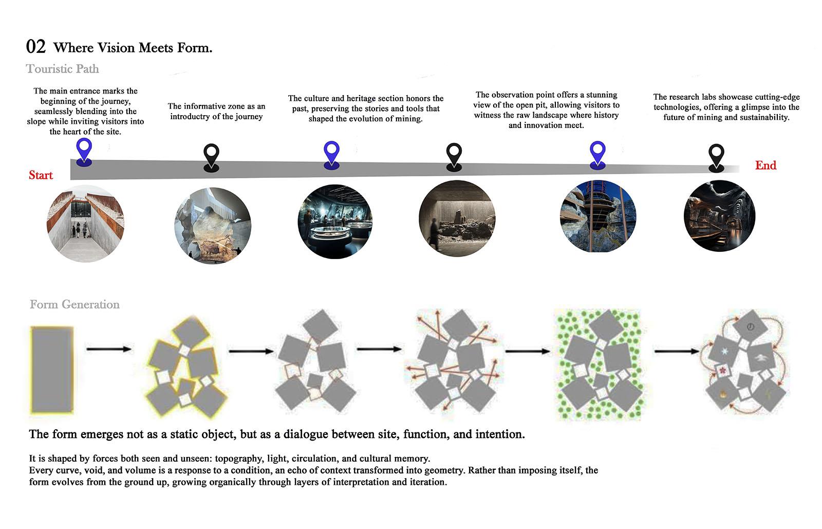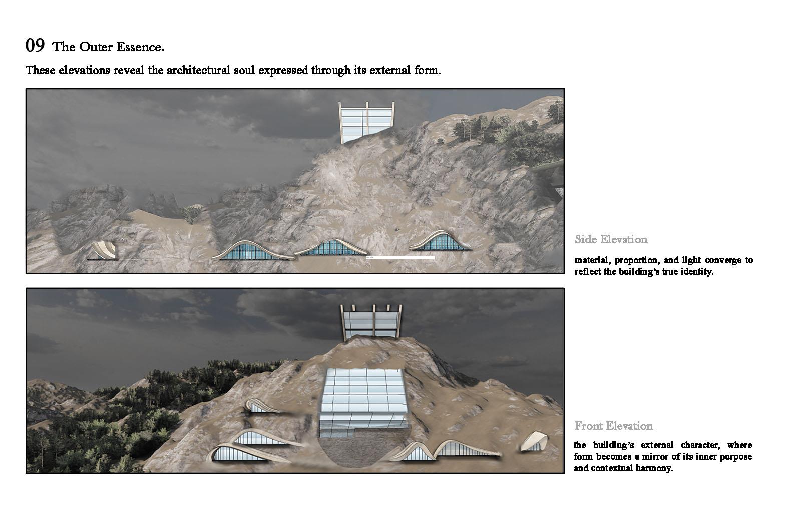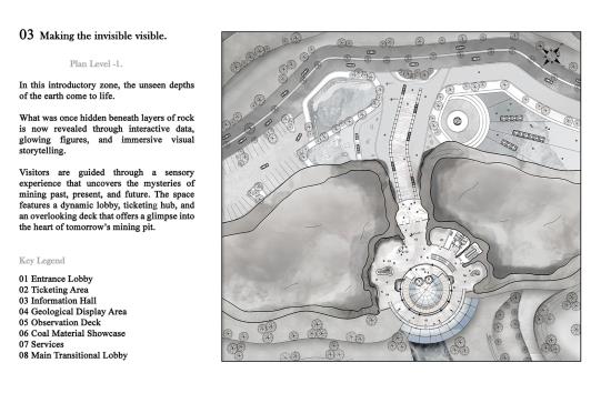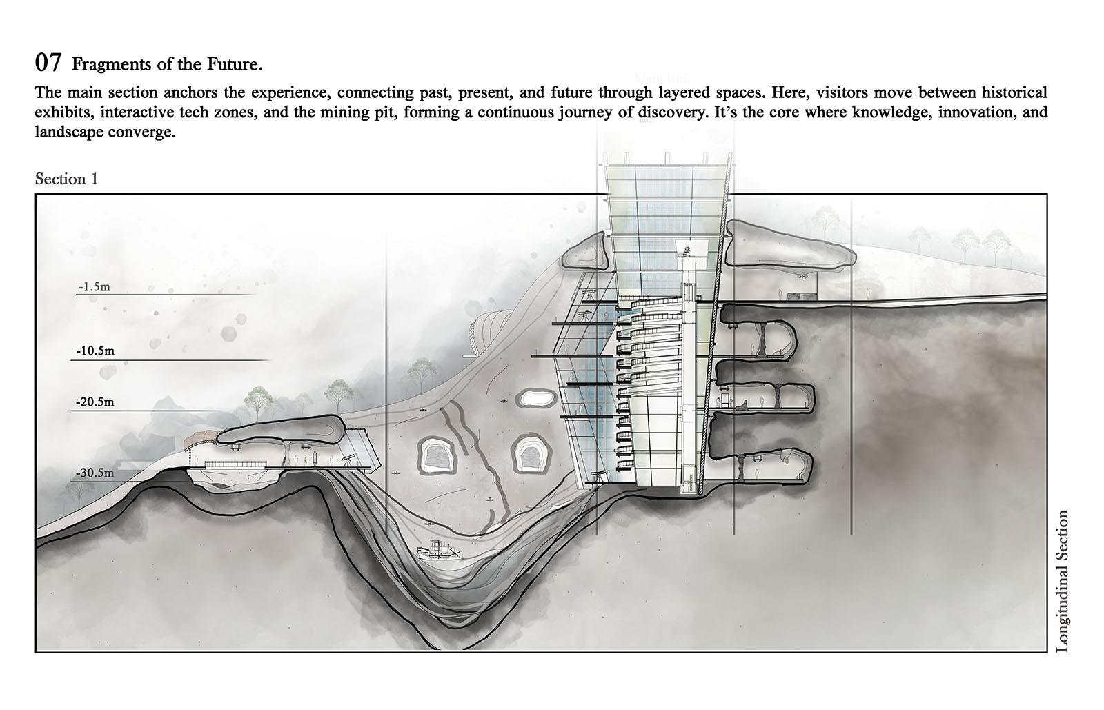 The Silent Quarry: An unseen shift Part 2 Project 2025 Aya El Charif Beirut Arab University - Debbieh campus | Lebanon 'The Silent Quarry' represents forgotten industrial landscapes where extraction left no legacy. This project activates one such anonymous site to reveal coal’s untapped potential. An Unseen Shift embodies the transformative idea that this maligned resource can transcend its dirty past, becoming the foundation for medical innovations, advanced materials, and ecological repair.Architecture emerges from the land itself, using rammed earth and reconstituted coal to form spaces that mirror geological strata. Where miners once extracted fuel, researchers now develop coal-derived technologies: porous scaffolds for tissue regeneration, purified carbon for cosmetics, and smart filters for environmental remediation. Visitors move through immersive exhibits contrasting mining relics with biotech prototypes, tracing this material’s radical reinvention.Jean Nouvel’s mandate for situation-specific architecture manifests in structures that perform dual roles: they physically repurpose mining waste while symbolically filtering coal’s narrative. The design rejects nostalgia, instead creating a living laboratory where the quarry’s silence is broken by innovation. Laboratories embedded in the landscape support ongoing material research, proving that post-industrial sites can catalyze sustainable futures.This is not a memorial, but a proposition: that the most overlooked places and materials can yield the most unexpected solutions. The unseen shift has begun. Tutor(s) Samer Al Siyari Hisham El-Arnaouty Khaled Sadek