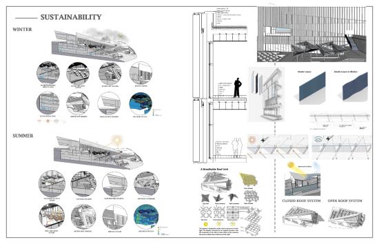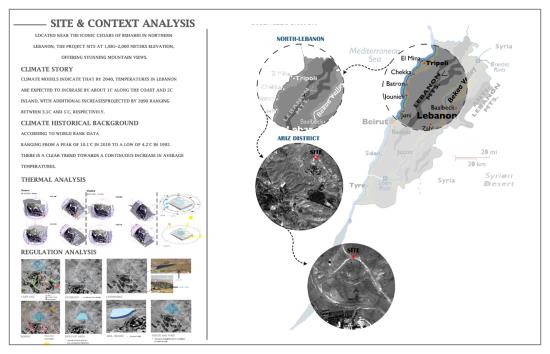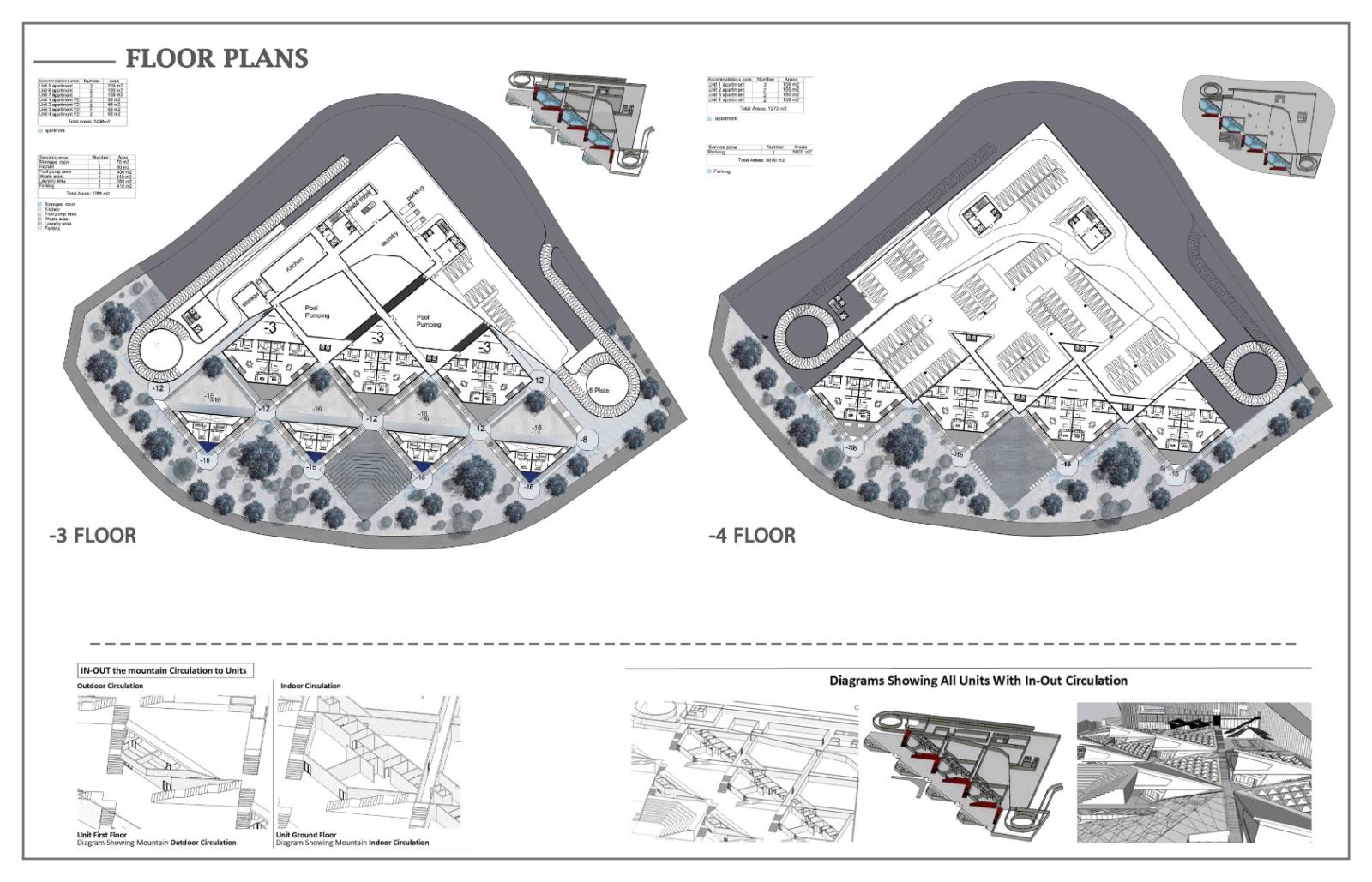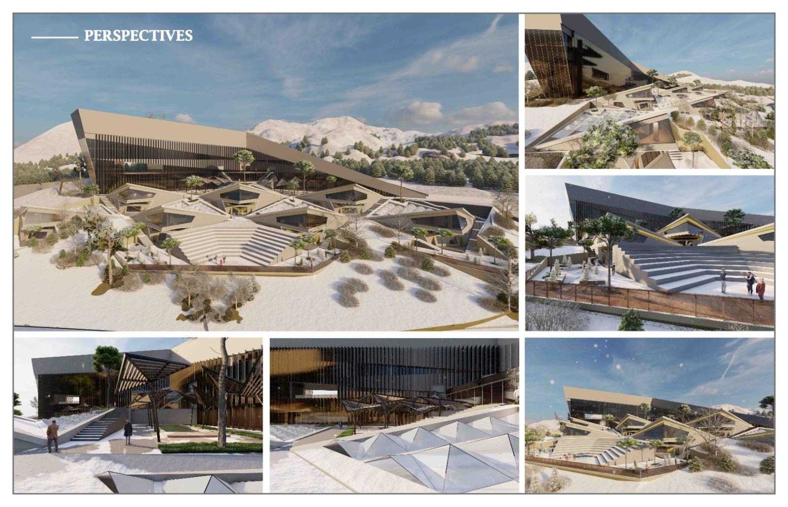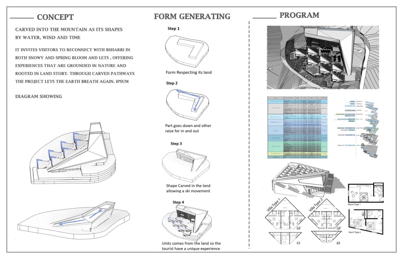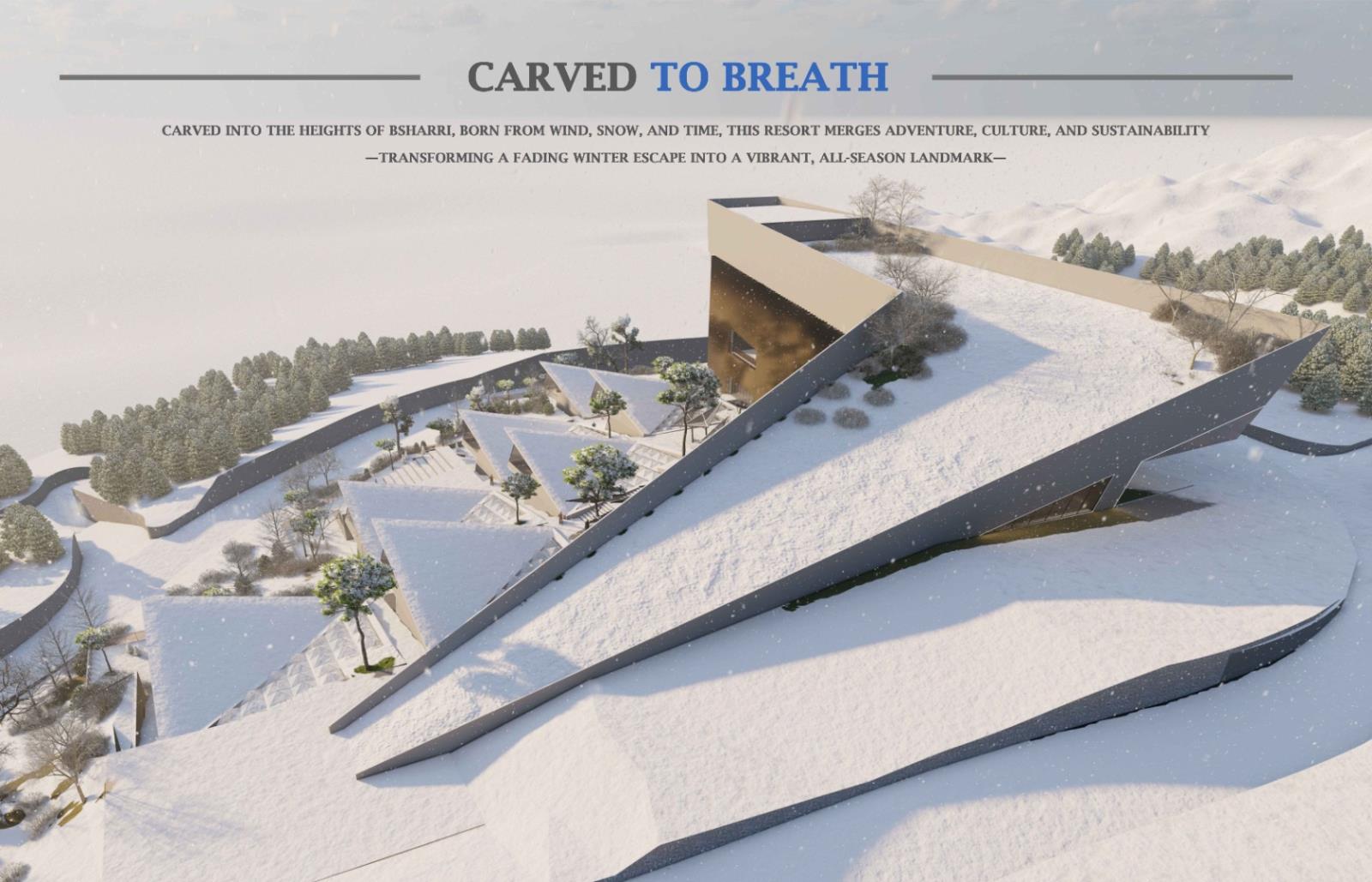 Set at 2000 meters in the Cedars of Bsharri, this project reimagines the future of mountain tourism in Lebanon by transforming a traditional ski resort into a sustainable, year-round destination. In response to climate instability and declining winter visitors, the design embraces the theme of breathing architecture through digging into the mountain. The resort is carved into the natural terrain to minimize its visual and environmental impact, while enhancing thermal performance and energy efficiency.
