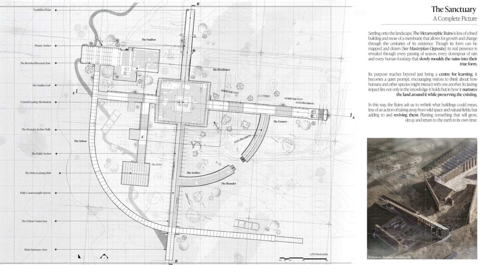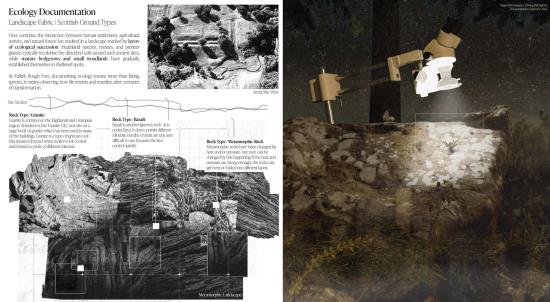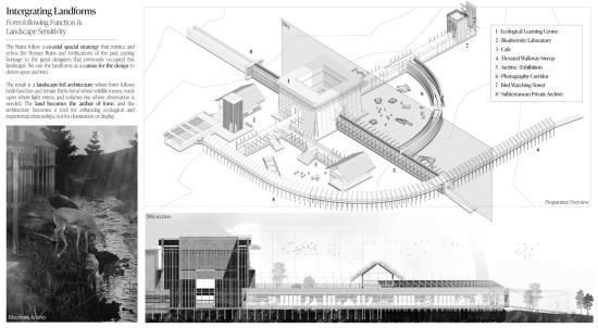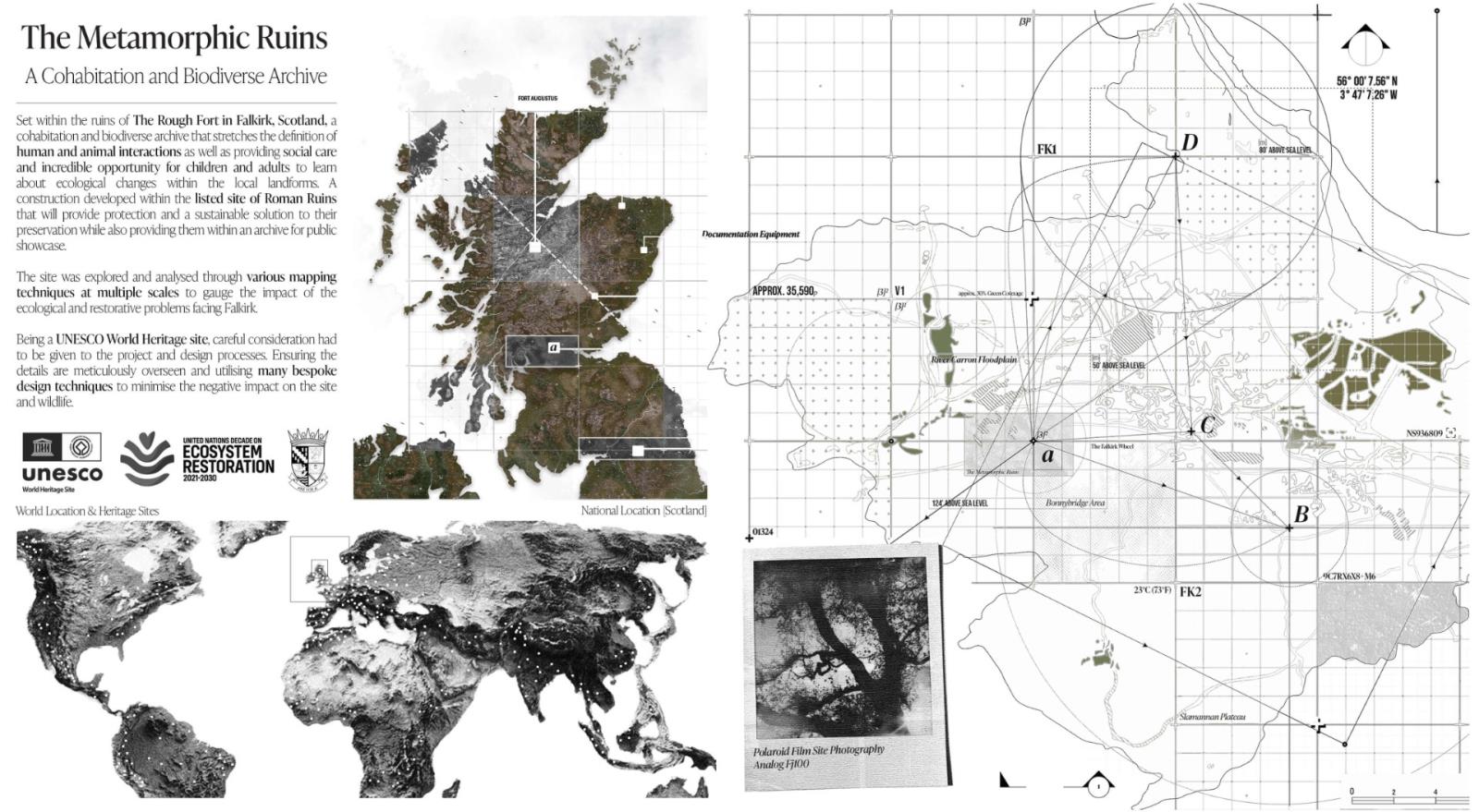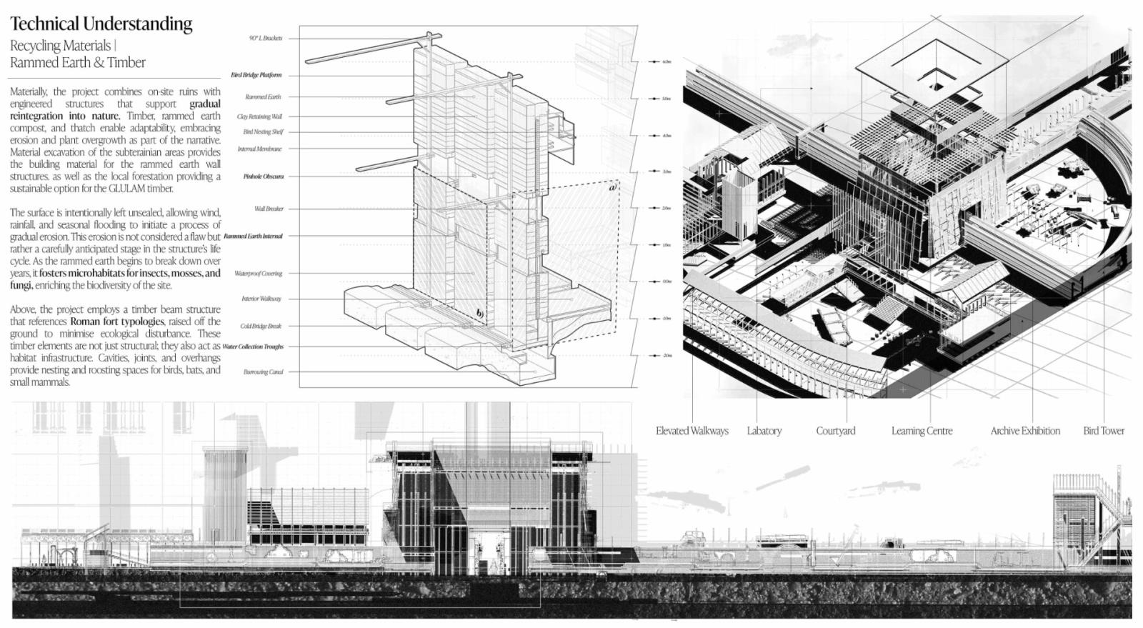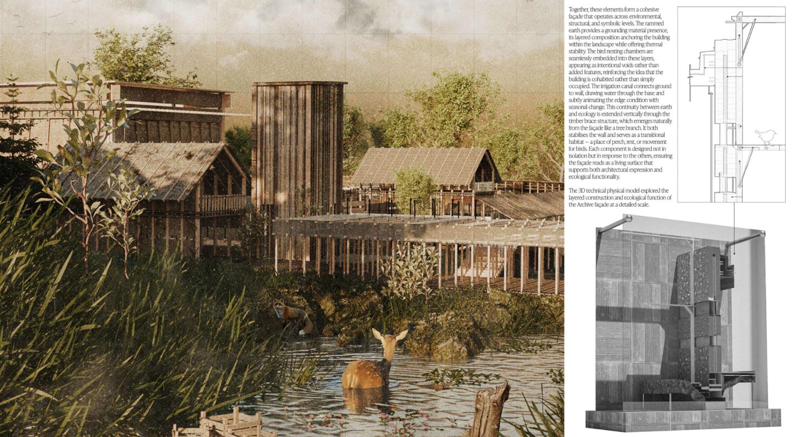 The Metamorphic Ruins stems from the idea of metamorphosis, or more commonly, the process of changing over time, and is a landscape intervention that has been carefully designed in response to the ongoing Falkirk Climate Crisis. A sanctuary and archival storage landscape where humans, animals and ecology co-exist and thrive together. Situated along the Antonine Wall in Scotland, it integrates the remnants of past structures with contemporary ecological and archival strategies. Overall, ‘The Metamorphic Ruins’ spans a gross floor area of 2,000 sqm with a site span of around 7,000 sqm. It was designed specially to spread the ruins and follow a co-axial strategy that will run parallel to the Antonine Wall ruins. There will be three multi-storey spaces, with two being surveillance and bird-watching towers, and the other being the central learning centre where the workshops take place. The site will also incorporate sensory wayfinding to assist visitors with visual and cognitive impairments. This includes contrasting textures, handrails, and tactile markers along key pathways. Additionally, auditory guidance, such as subtle sound cues from water features and wind chimes, will support navigation while enhancing the immersive experience.