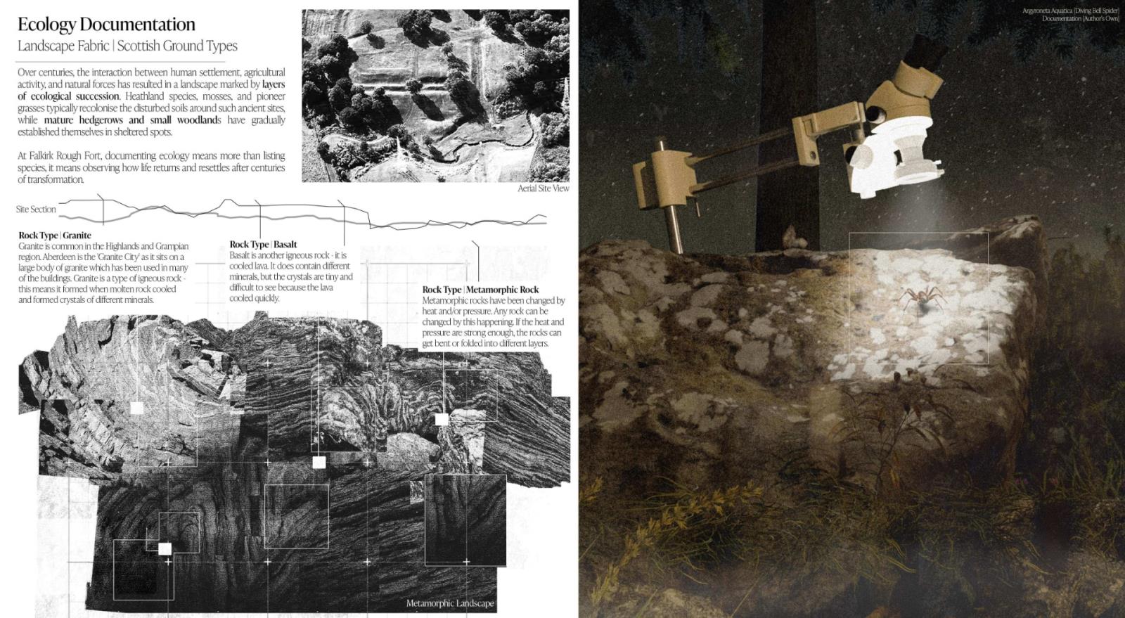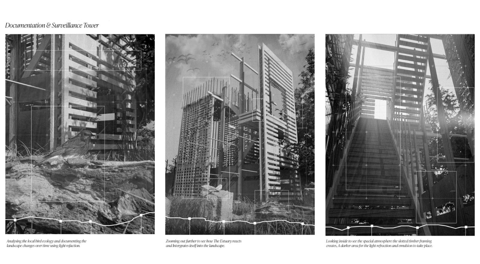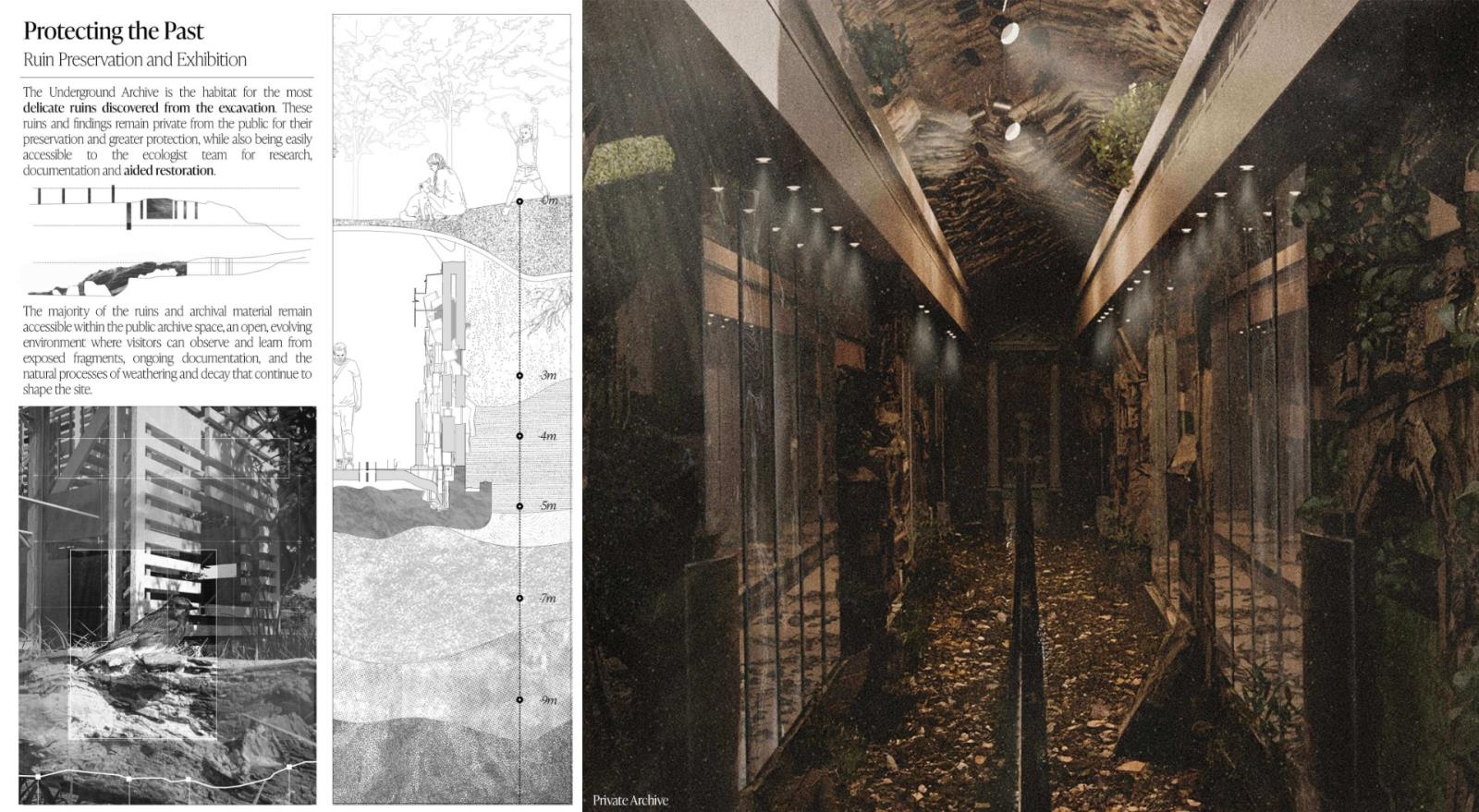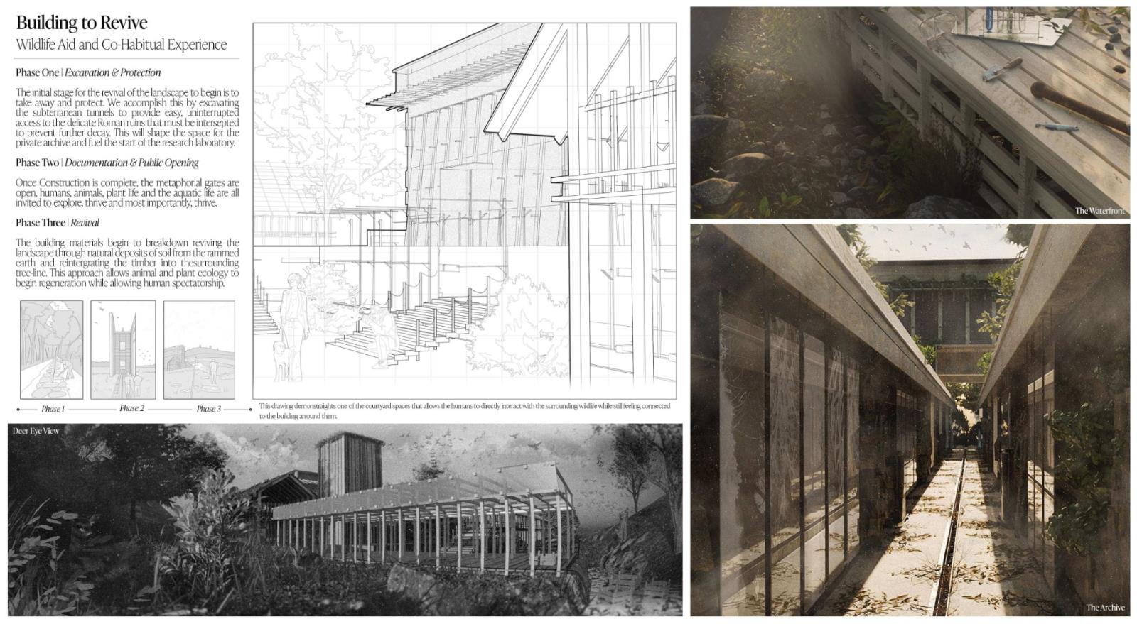The Metamorphic Ruins stems from the idea of metamorphosis, or more commonly, the process of changing over time, and is a landscape intervention that has been carefully designed in response to the ongoing Falkirk Climate Crisis. A sanctuary and archival storage landscape where humans, animals and ecology co-exist and thrive together. Situated along the Antonine Wall in Scotland, it integrates the remnants of past structures with contemporary ecological and archival strategies. Overall, ‘The Metamorphic Ruins’ spans a gross floor area of 2,000 sqm with a site span of around 7,000 sqm. It was designed specially to spread the ruins and follow a co-axial strategy that will run parallel to the Antonine Wall ruins. There will be three multi-storey spaces, with two being surveillance and bird-watching towers, and the other being the central learning centre where the workshops take place. The site will also incorporate sensory wayfinding to assist visitors with visual and cognitive impairments. This includes contrasting textures, handrails, and tactile markers along key pathways. Additionally, auditory guidance, such as subtle sound cues from water features and wind chimes, will support navigation while enhancing the immersive experience.