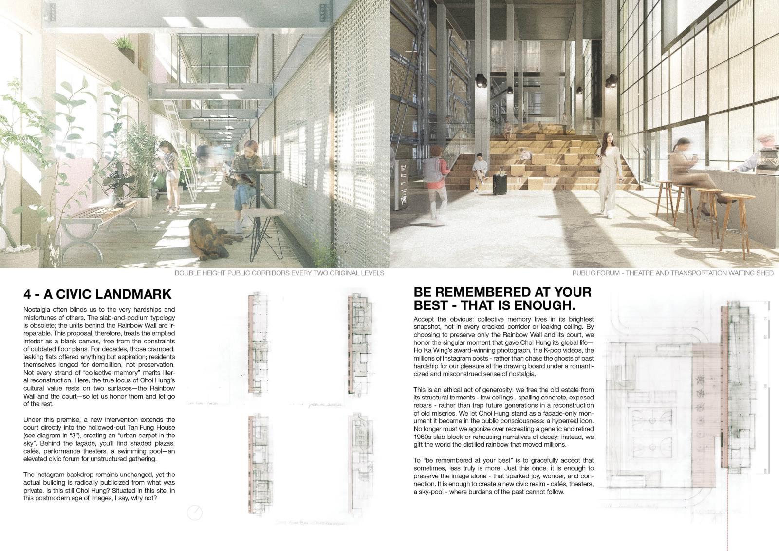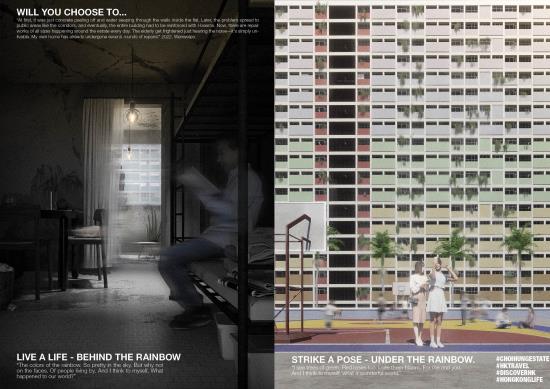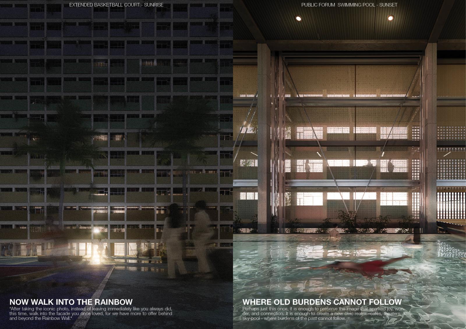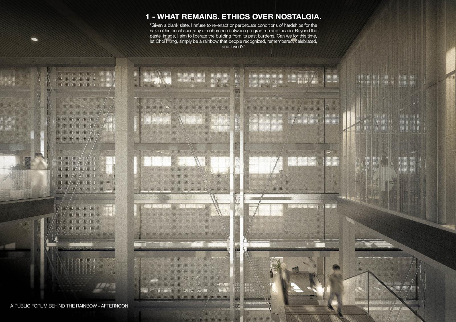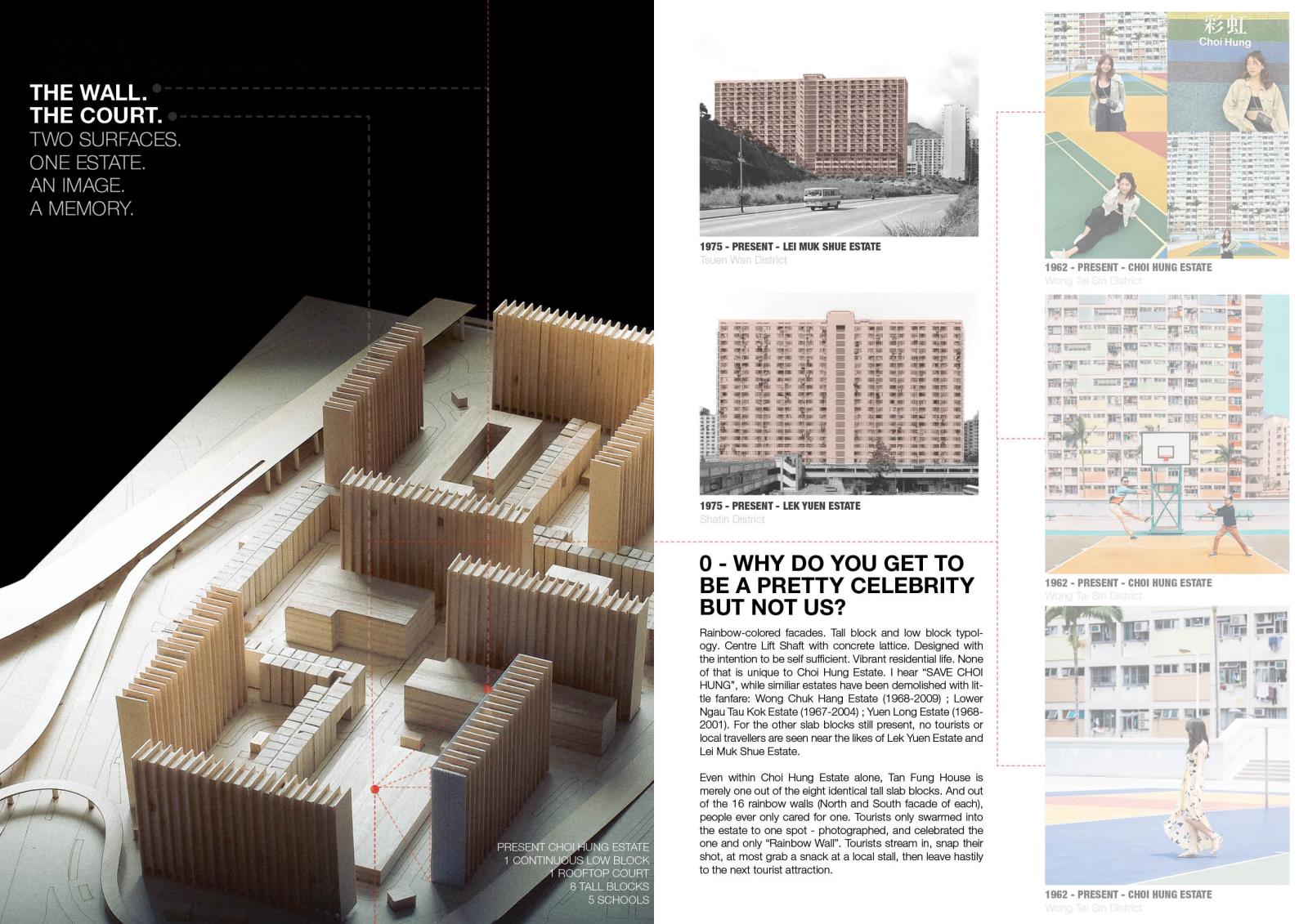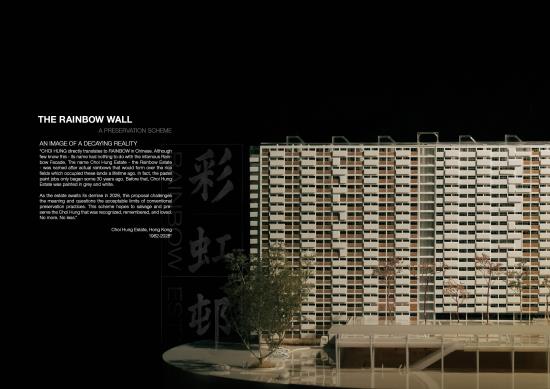 Slated for demolition in 2028, this proposal questions what deserves to be saved and why. Rather than reanimate spaces stained by hardships, the project aims to preserve only the Choi Hung that was known and loved: The Rainbow Wall and The Court. These two surfaces are detached from decay and propped up as the distilled artefacts of the estate. Behind the old façade, a transparent civic forum fills up the void - a new life that neither denies nor replicates the past. Let the rainbow be remembered at its best. No more. No less.
