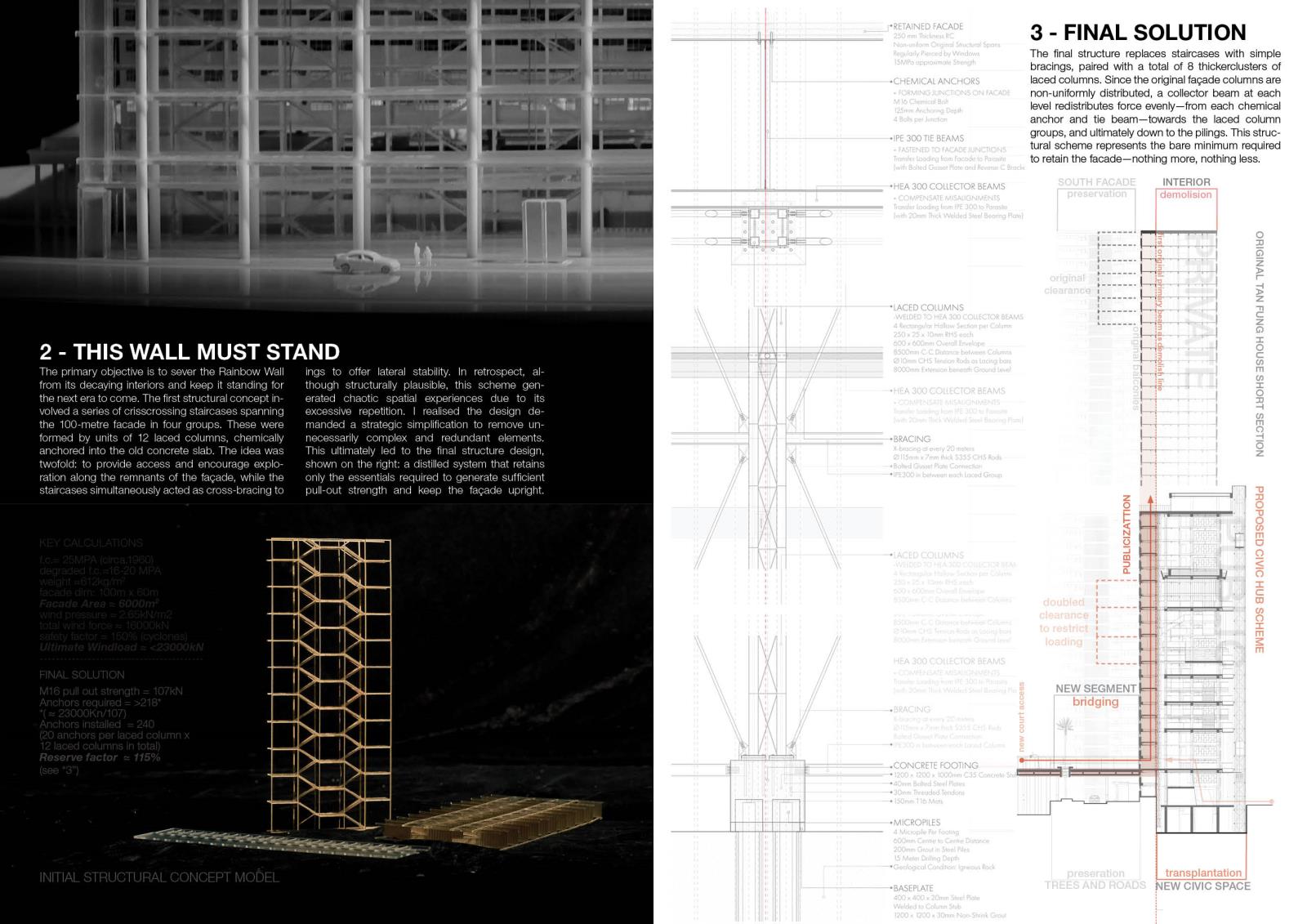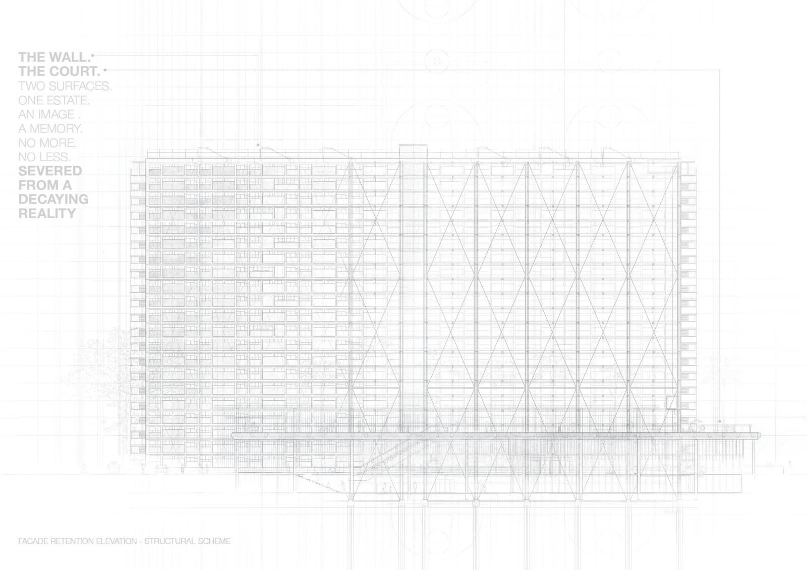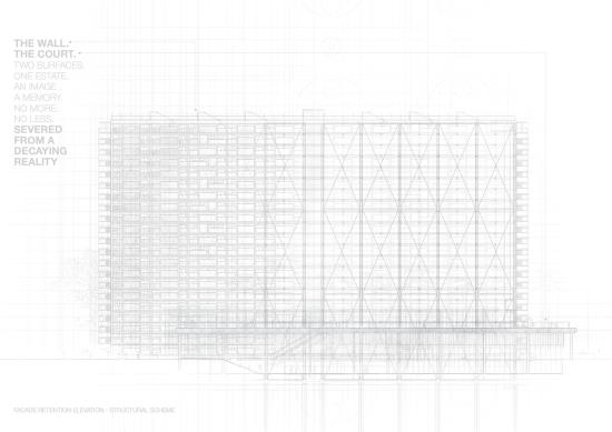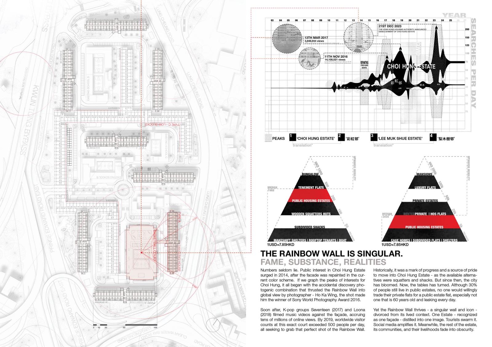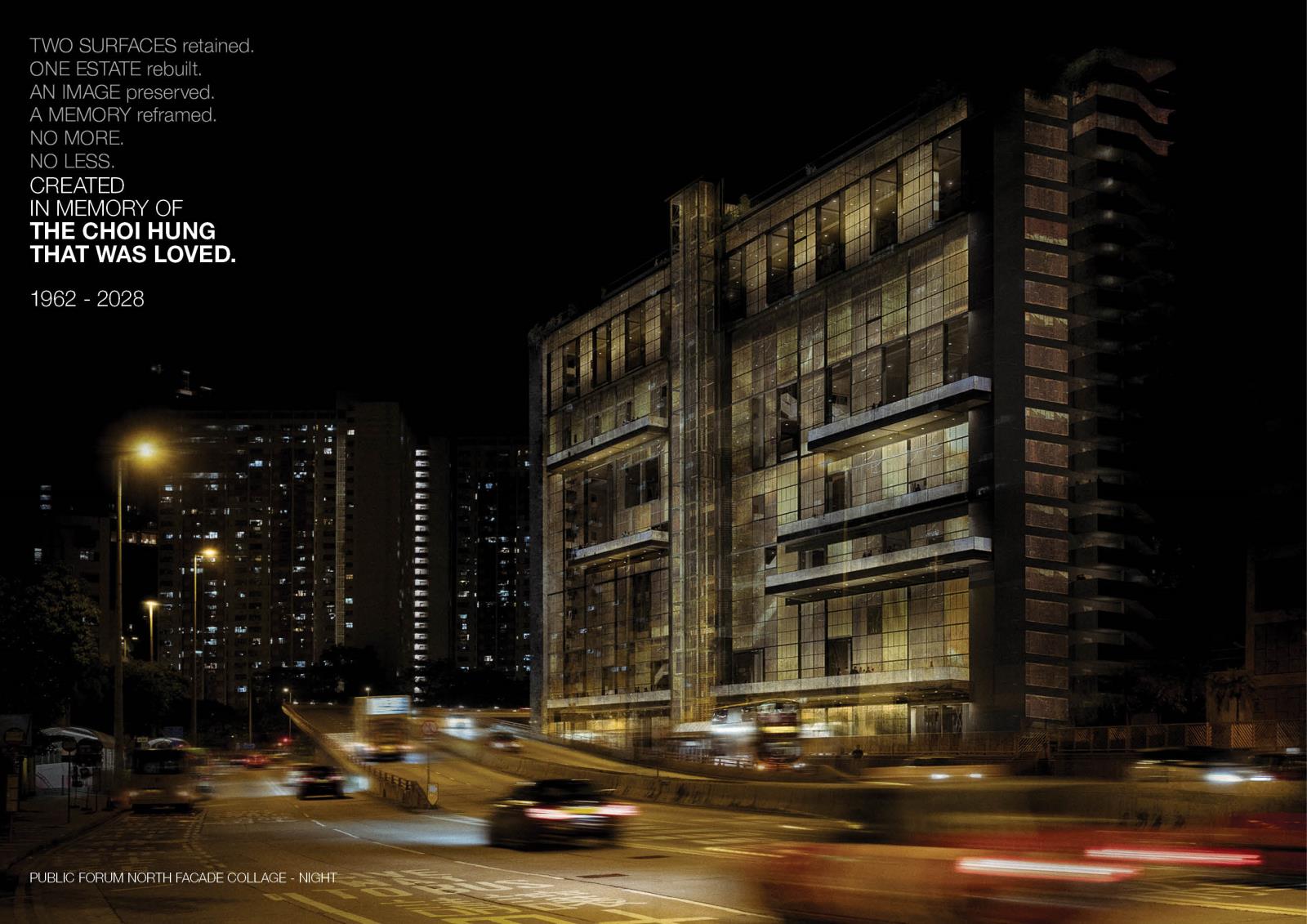 Slated for demolition in 2028, this proposal questions what deserves to be saved and why. Rather than reanimate spaces stained by hardships, the project aims to preserve only the Choi Hung that was known and loved: The Rainbow Wall and The Court. These two surfaces are detached from decay and propped up as the distilled artefacts of the estate. Behind the old façade, a transparent civic forum fills up the void - a new life that neither denies nor replicates the past. Let the rainbow be remembered at its best. No more. No less.