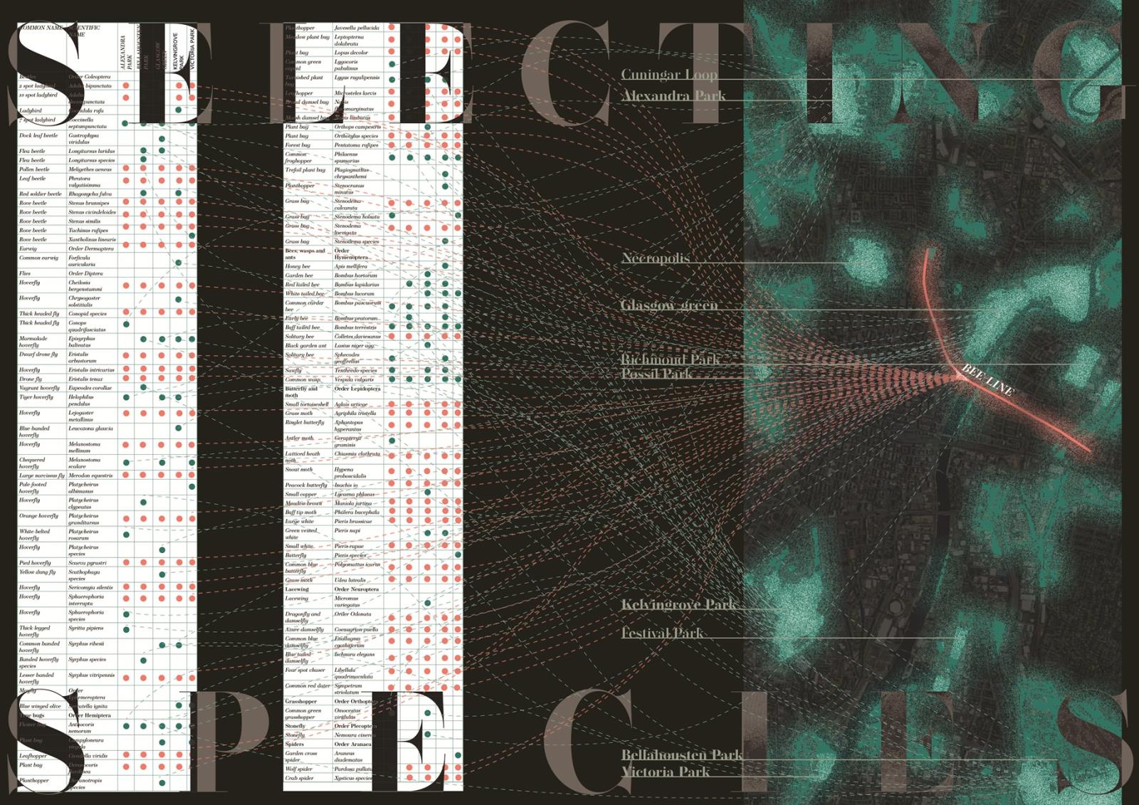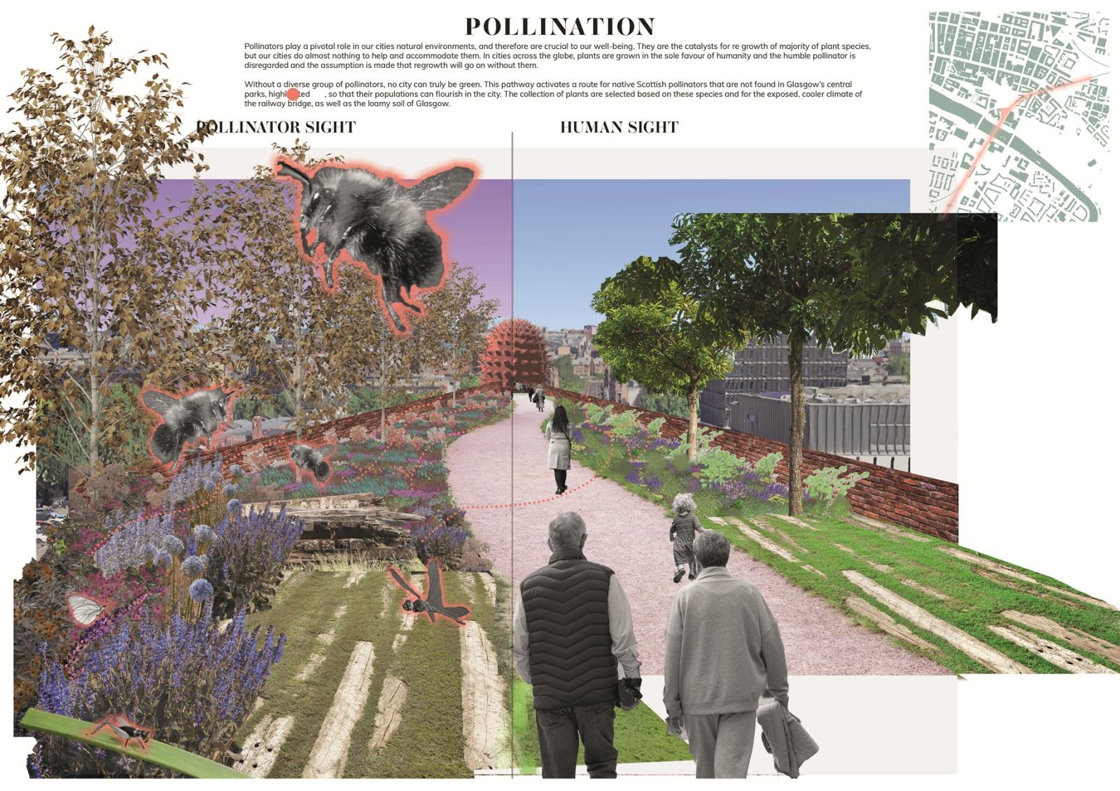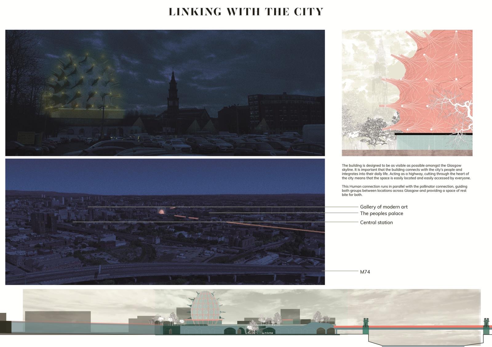 The access to the space comes from the ‘pollination pathway’ an overpass that weaves within the centre of Glasgow. Lined with plants selected to strengthen pollinator populations, the pathway not only becomes circulation for pedestrians through Glasgow, but also a route for pollinators to move between the city centres parks.
