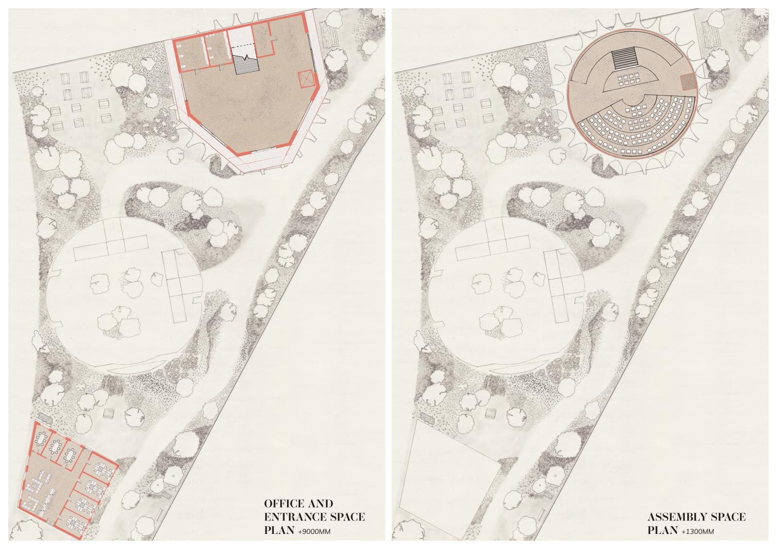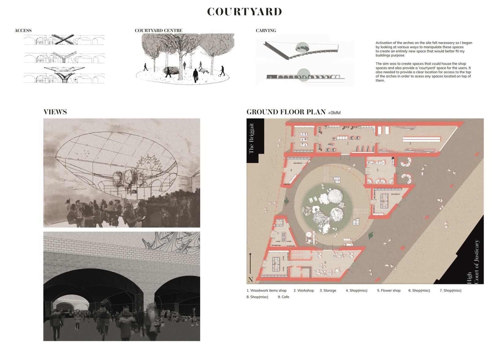 The physicality of the space focusses around openness and locate-ability. The large assembly structure aims to promote visibility of government discussions and invite the public into said discussions. The permeable ground floor uses the inviting arches to draw the public into the central courtyard, a space centred around community and ease of movement. Finally, the government offices sit peacefully within the main re-generated space, the building is simplistic and open to promote understanding and permeability of the government’s decisions and discussions.