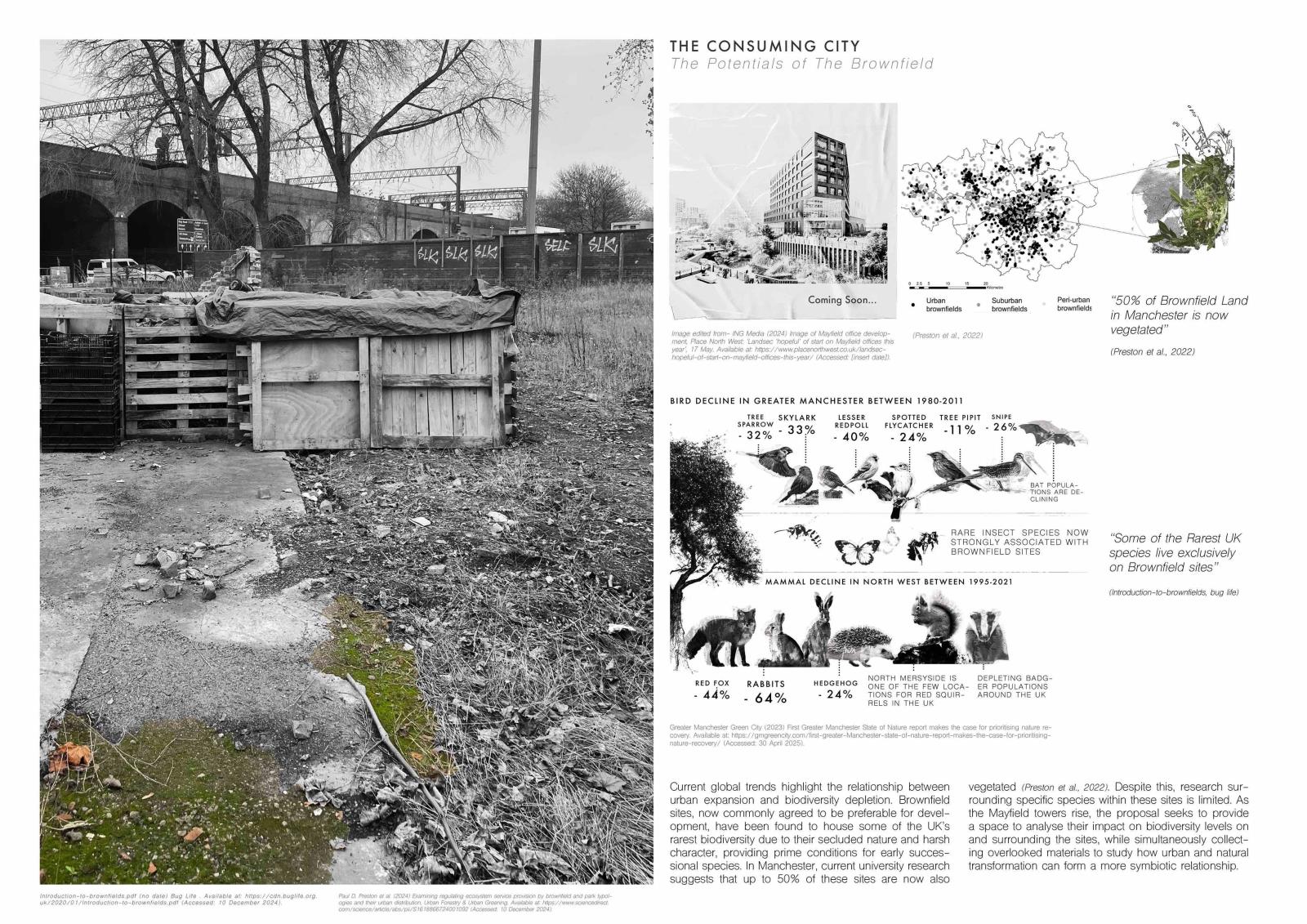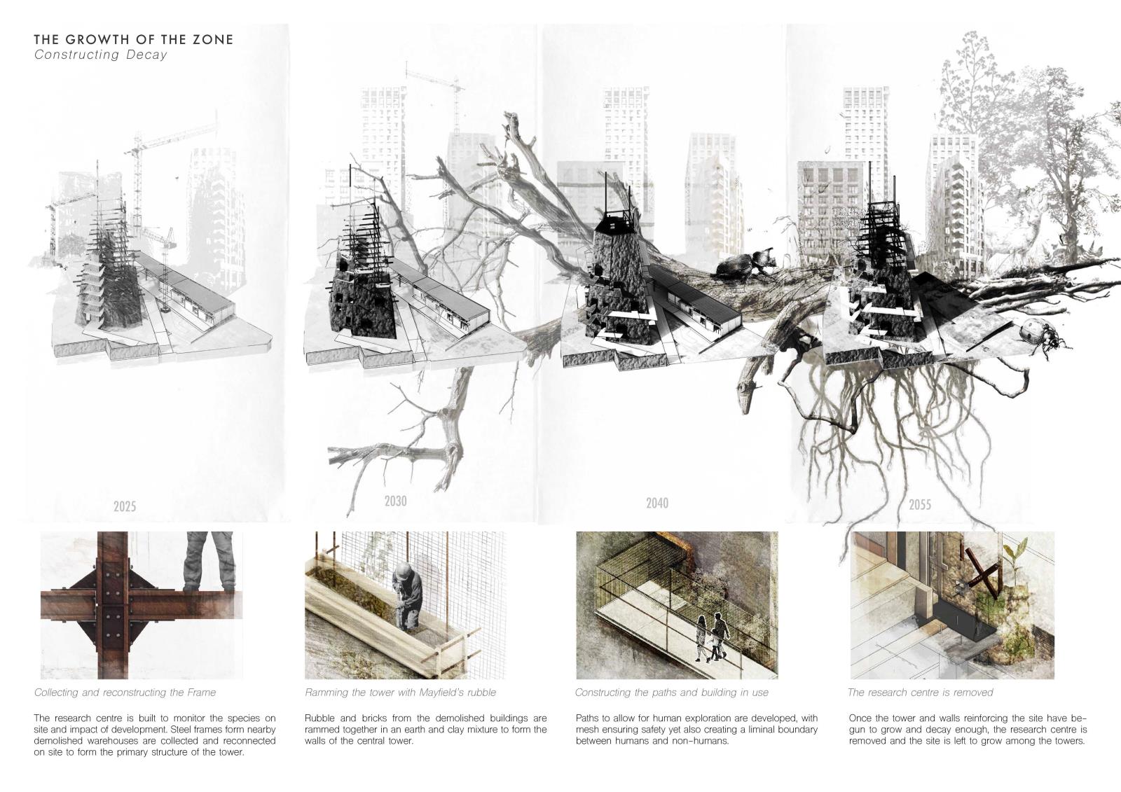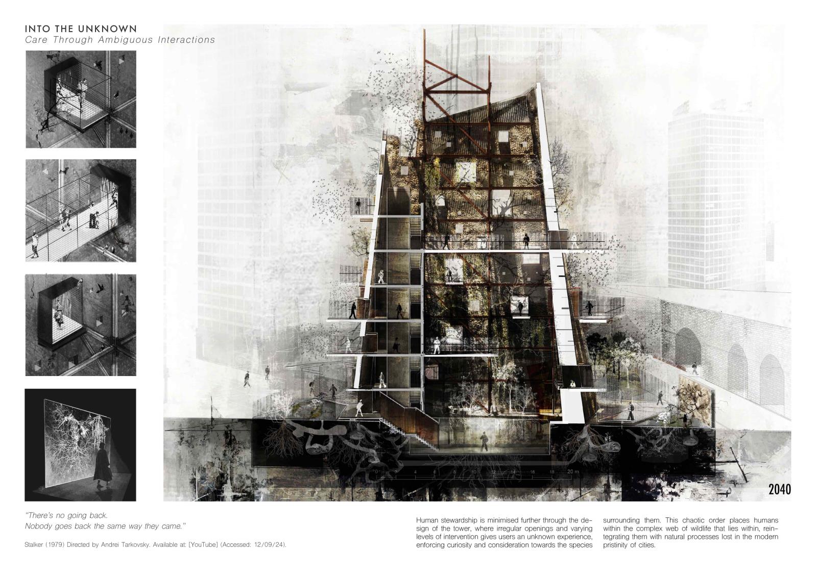 We Are but Visitors Here... Part 1 Project 2025 Madeleine Arnell Manchester School of Architecture | UK Current models of urban development often erase existing characteristics to erect slick, commodified architecture. This cleansing approach has contributed to a widespread loss in biodiversity, and a detachment between humans and the natural world, posing increasing dangers amidst the climate crisis. In Mayfield, Manchester, a guarded brownfield site sits among those selected for regeneration. Following the strange slow processes already unfolding across Mayfield’s postindustrial landscape, this project responds not in opposition, but in parallel to the regeneration. The proposed architecture is not imposed on the site but emerges from what exists. Salvaged materials from demolished warehouses form a decaying tower, acting as a monument to Mayfield's industrial past and a sanctuary for non-human species. Openings appear without hierarchy, creating an architectural ecosystem with no species in control. Irregular pathways spiral around and within the structure, guiding visitors to preserve coexistence. Along the site's edge, a removable research center tracks ecological change, its lifespan shaped by human interaction, reminding users of our role as visitors. Rooted in temporality and coexistence, instead of erasing Mayfield’s past, the project seeks transformation through slower rhythms, inviting the city to remember, to wait, and to imagine regeneration not as replacement, but as continuation. Tutor(s) Lindsay Bush Dan Dubowitz Vilius Petraitis Hazem Ziada