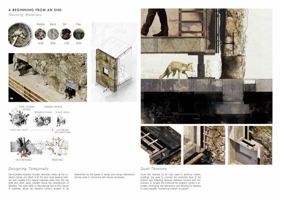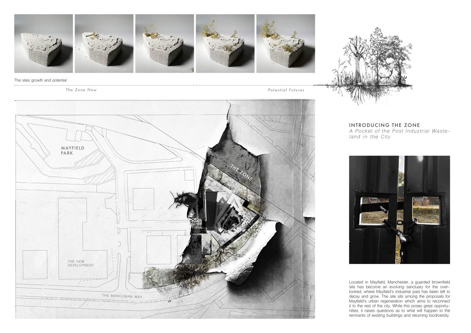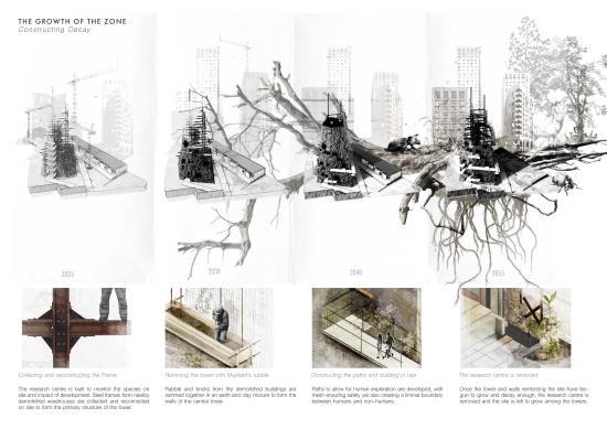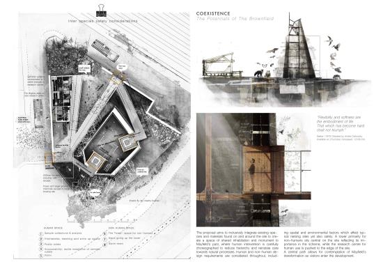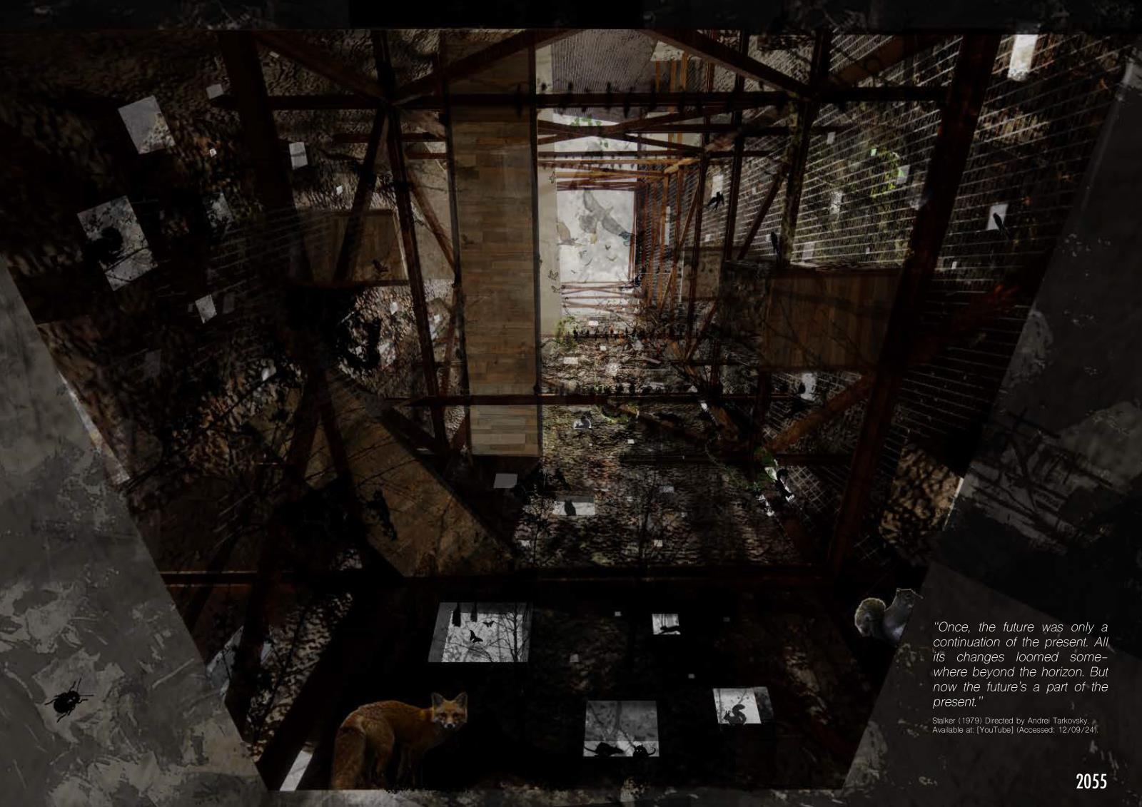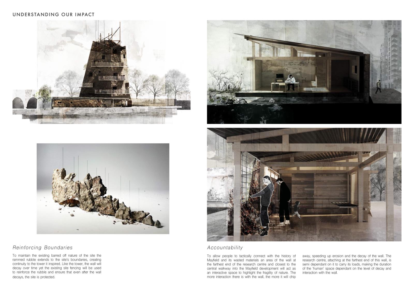 We Are but Visitors Here... Part 1 Project 2025 Madeleine Arnell Manchester School of Architecture | UK Current models of urban development often erase existing characteristics to erect slick, commodified architecture. This cleansing approach has contributed to a widespread loss in biodiversity, and a detachment between humans and the natural world, posing increasing dangers amidst the climate crisis. In Mayfield, Manchester, a guarded brownfield site sits among those selected for regeneration. Following the strange slow processes already unfolding across Mayfield’s postindustrial landscape, this project responds not in opposition, but in parallel to the regeneration. The proposed architecture is not imposed on the site but emerges from what exists. Salvaged materials from demolished warehouses form a decaying tower, acting as a monument to Mayfield's industrial past and a sanctuary for non-human species. Openings appear without hierarchy, creating an architectural ecosystem with no species in control. Irregular pathways spiral around and within the structure, guiding visitors to preserve coexistence. Along the site's edge, a removable research center tracks ecological change, its lifespan shaped by human interaction, reminding users of our role as visitors. Rooted in temporality and coexistence, instead of erasing Mayfield’s past, the project seeks transformation through slower rhythms, inviting the city to remember, to wait, and to imagine regeneration not as replacement, but as continuation. Tutor(s) Lindsay Bush Dan Dubowitz Vilius Petraitis Hazem Ziada