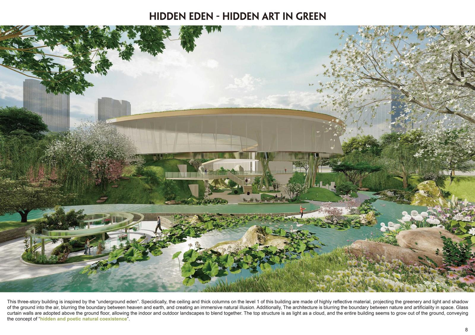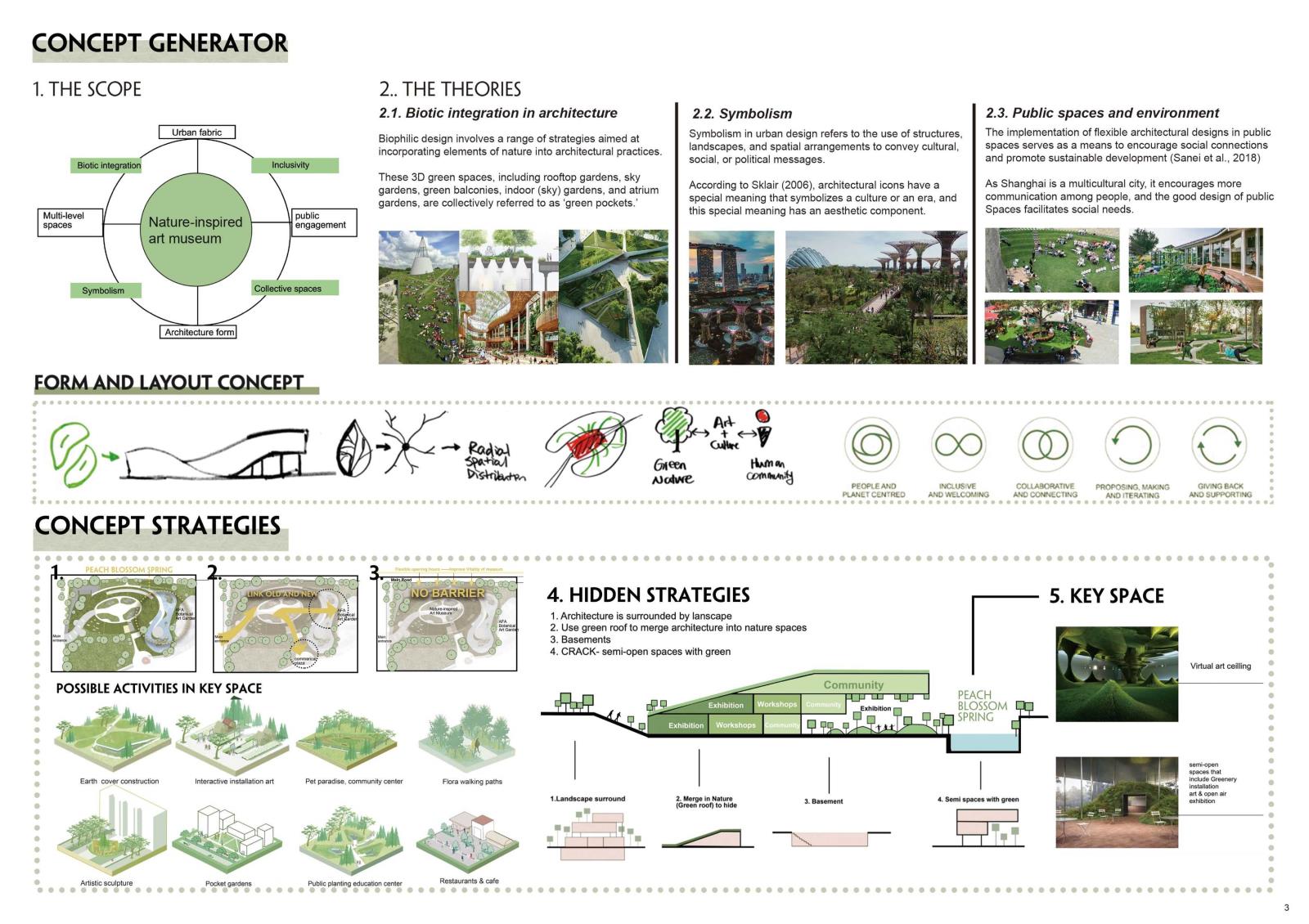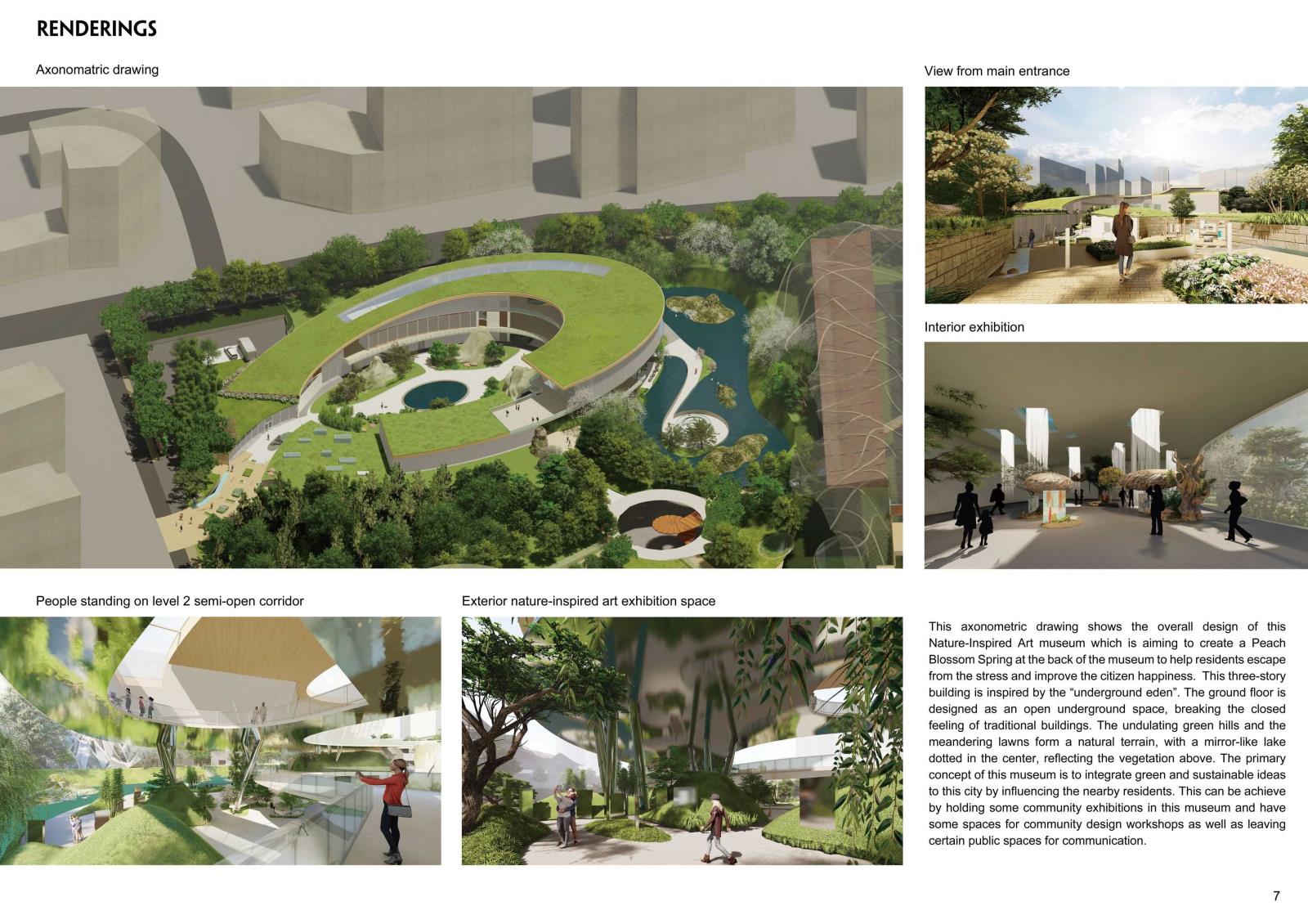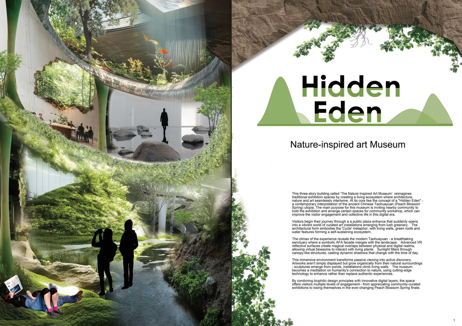 As a global metropolis, Shanghai embodies a hybrid culture shaped by the interplay of localization and globalisation. To enhance the provision of innovative public spaces that could revitalise urban communities, this project proposes the Nature-Inspired Art Museum, a three-story “Hidden Eden” designed as part of the Hidden Art in Green masterplan. It merges nature, art, and public space, offering accessible greenery while fostering cultural engagement. Aimed at blending local identity with global artistic and cultural influences, this hybrid design aspires to become a new cultural landmark that could redefine public spaces in Shanghai. The key idea is to create a sustainable urban “Peach Blossom Spring” for Shanghai residents. The museum integrates formal and informal spaces, biotic design, and environmental symbolism to establish an urban living ecosystem where architecture and nature coexist. The museum spaces encourage community interaction by hosting local art displays, workshops, and educational programs to strengthen social engagement through informal and outdoor learning environments.