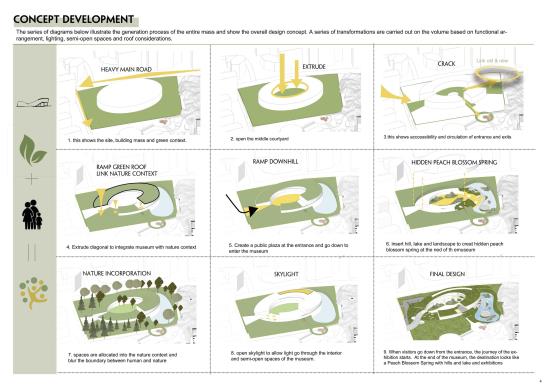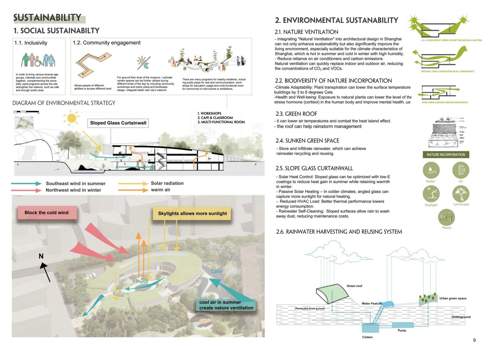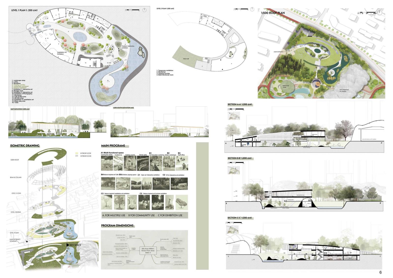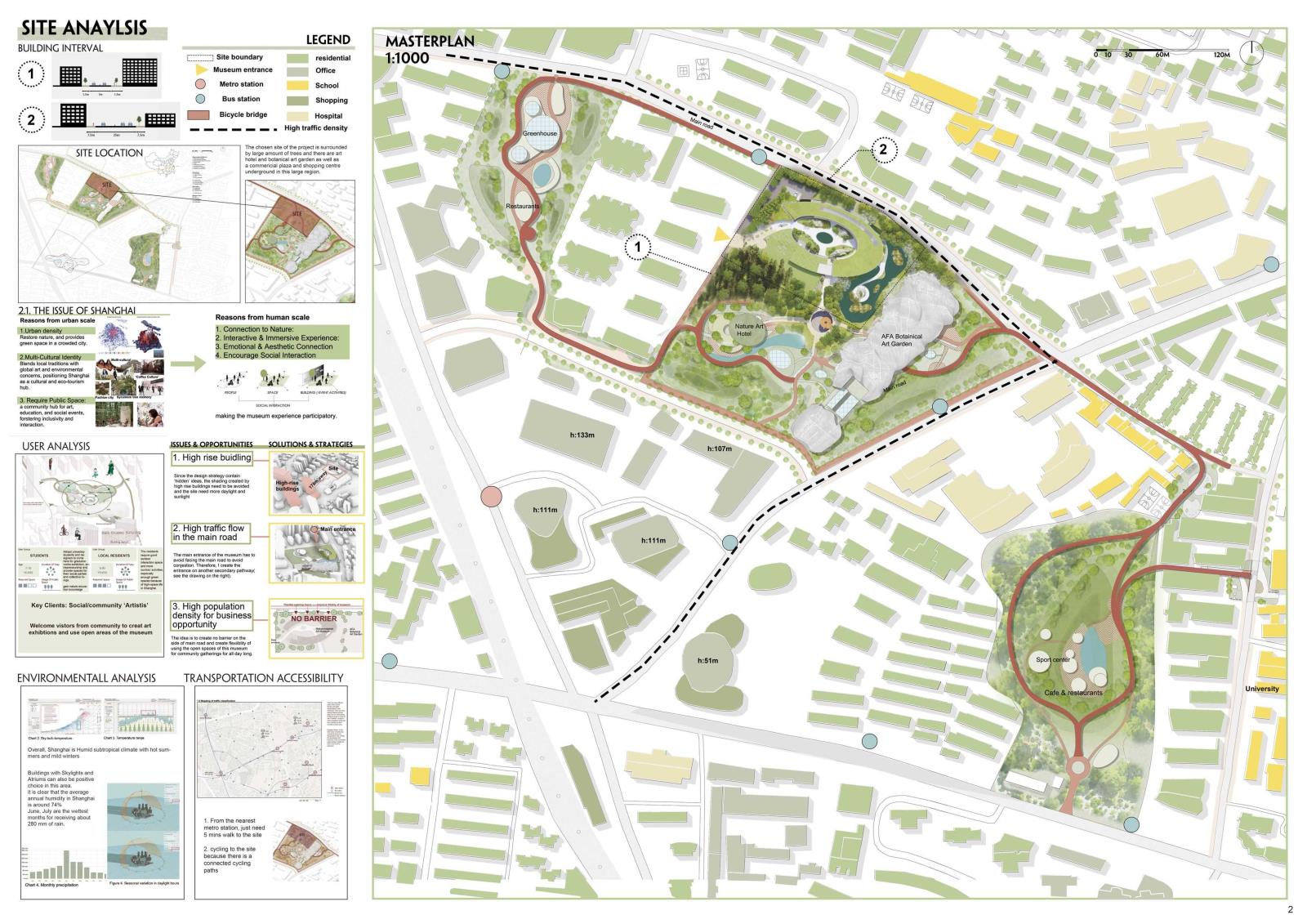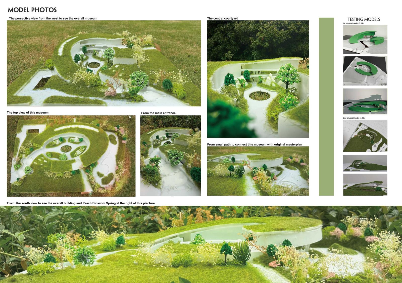 As a global metropolis, Shanghai embodies a hybrid culture shaped by the interplay of localization and globalisation. To enhance the provision of innovative public spaces that could revitalise urban communities, this project proposes the Nature-Inspired Art Museum, a three-story “Hidden Eden” designed as part of the Hidden Art in Green masterplan. It merges nature, art, and public space, offering accessible greenery while fostering cultural engagement. Aimed at blending local identity with global artistic and cultural influences, this hybrid design aspires to become a new cultural landmark that could redefine public spaces in Shanghai. The key idea is to create a sustainable urban “Peach Blossom Spring” for Shanghai residents. The museum integrates formal and informal spaces, biotic design, and environmental symbolism to establish an urban living ecosystem where architecture and nature coexist. The museum spaces encourage community interaction by hosting local art displays, workshops, and educational programs to strengthen social engagement through informal and outdoor learning environments.