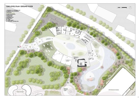 The ground floor features an open semi- underground space with undulating green hills, a reflective lake, and meandering lawns, softening the rigidity of traditional structures and allowing visitors to explore freely. The architectural form embodies the metaphor of the "Cycle," intersecting with landscaped spaces.