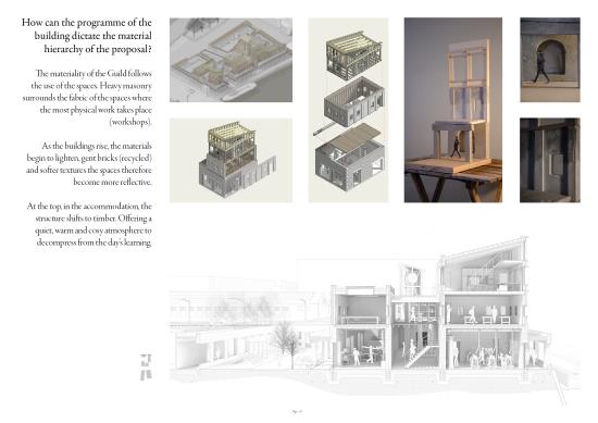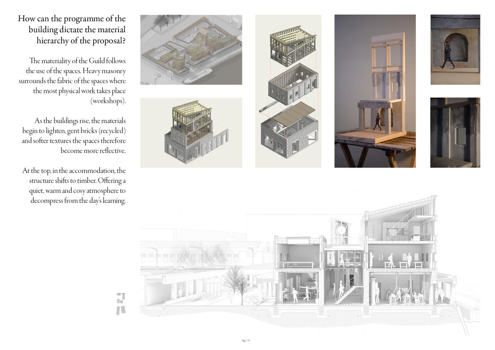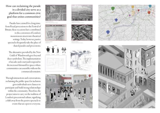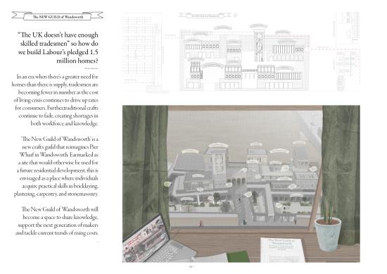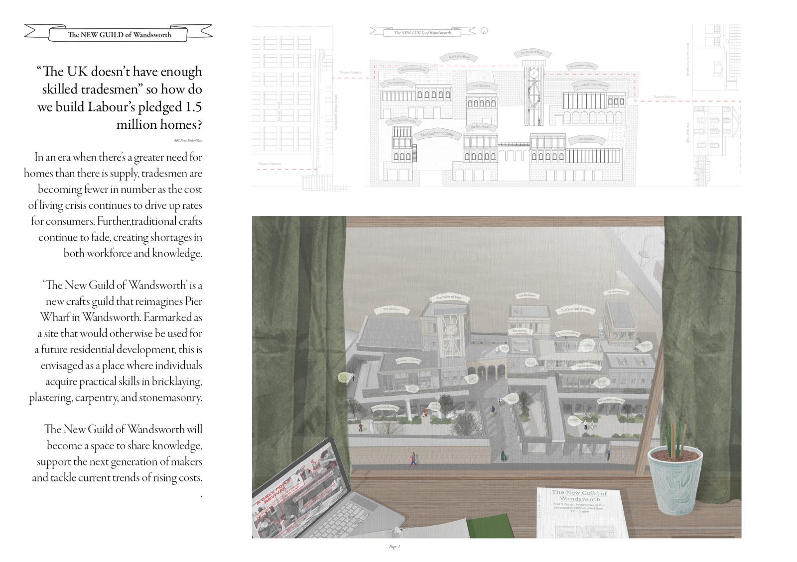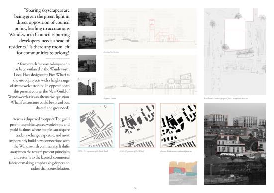 The New Guild of Wandsworth reimagines Pier Wharf in Wandsworth as a new craft guild. Following William Morris' guiding principles, the design draws inspiration from the historic urban fabric through form, materials and ornamentation. A series of craft buildings sit within a framework of courtyards where each cohort's work is displayed and preserved, transforming the guild into a repository of public engagement and sharing of skills. Arcades serve as a threshold and a public route, leading processions and daily life, set under a clock tower bringing a sense of the ‘civic’ to this area of Wandsworth.
