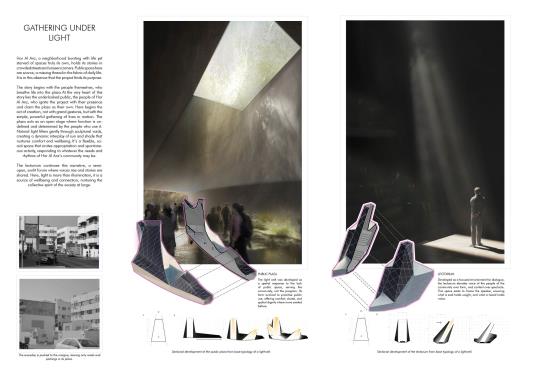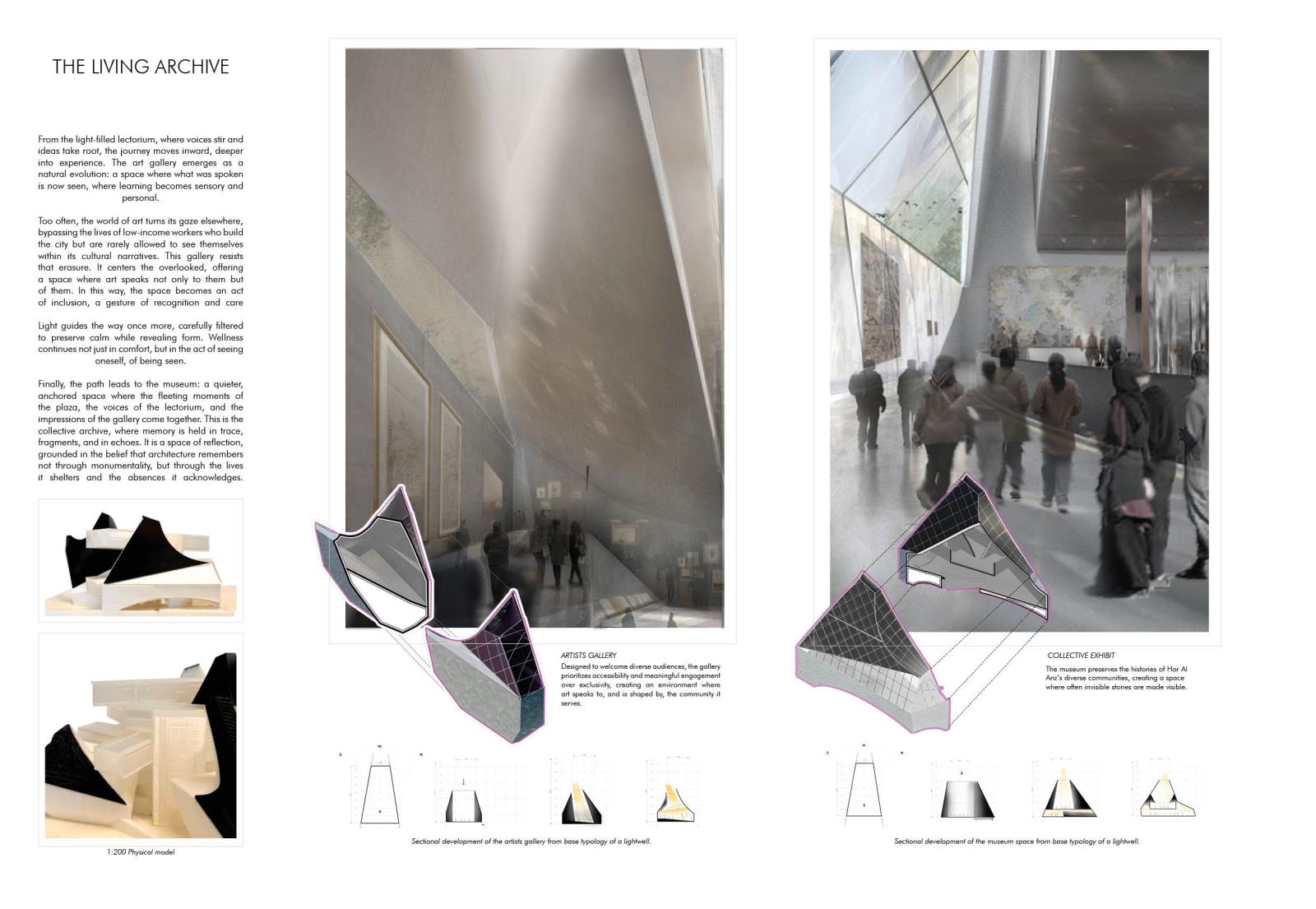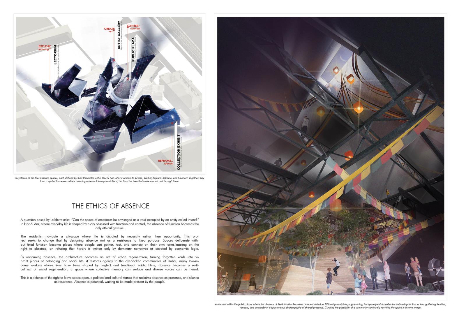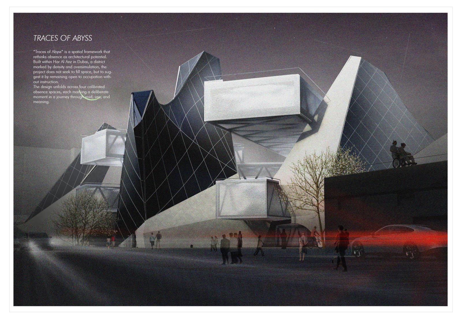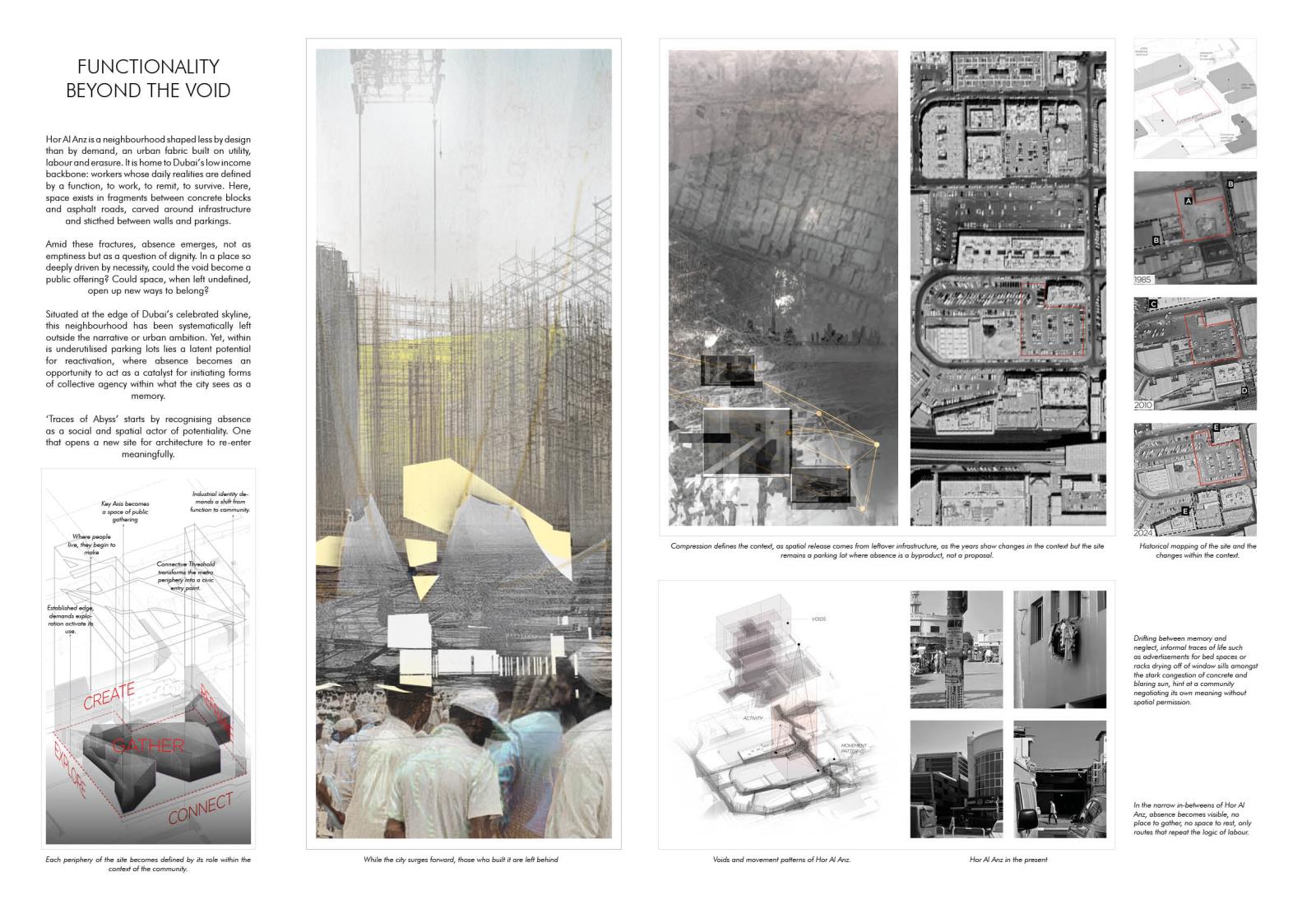 Traces of Abyss Part 1 Project 2025 Amir Shahnoor Heriot Watt University - Dubai Campus | UAE Set in Hor Al Anz, within the old district of Deira Dubai, a densely populated neighbourhood often bypassed by the city’s grand visions, ‘Traces of Abyss’ reclaims absence as a spatial and social necessity. Rooted in the elemental quality of Space, it resists the pressure to define, dictate, or perform.In a place where lives are shaped by the relentless logics of commute, transaction, and labour, the proposal introduces a cultural complex that refuses to dictate use. It offers space for pause, where the absence of imposed function becomes the only ethical gesture, a quiet resistance to hyper-functional urbanism that leaves no room for reflection or care.These absences are not voids, but spaces of potential. Occupied without instruction, they become active forms of care, reclaiming the right to gather, connect, redefine and create.For a community long overlooked, the project offers a soft landmark: quiet, present, and open. It doesn’t declare itself - it listens. And in doing so, reframes architecture as a container of communal identity.Traces of Abyss is a defence of leaving space open - where absence of function creates conditions for presence, encounter, and for care. Tutor(s) Vineeth T Kannoth Shameel Muhammed