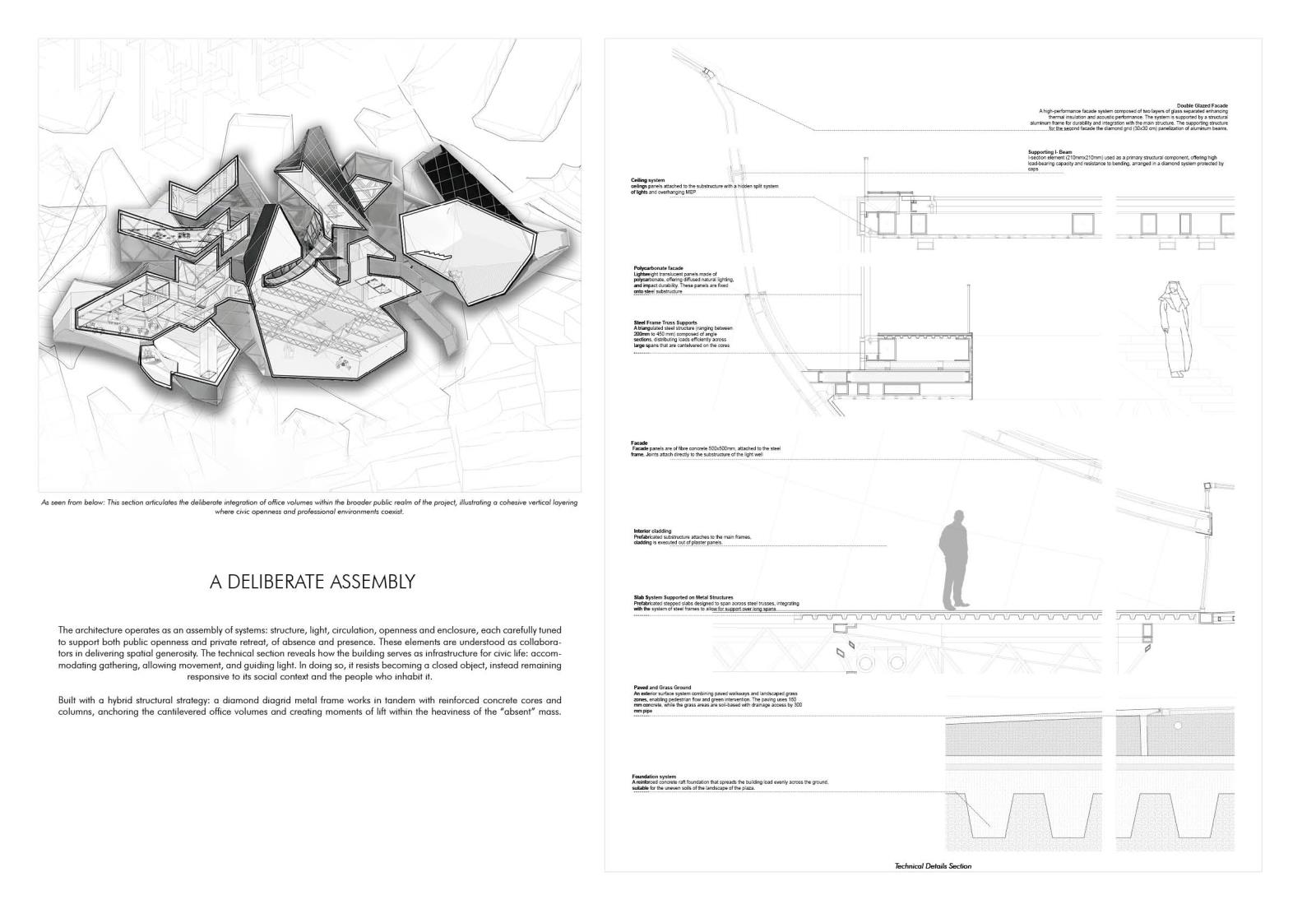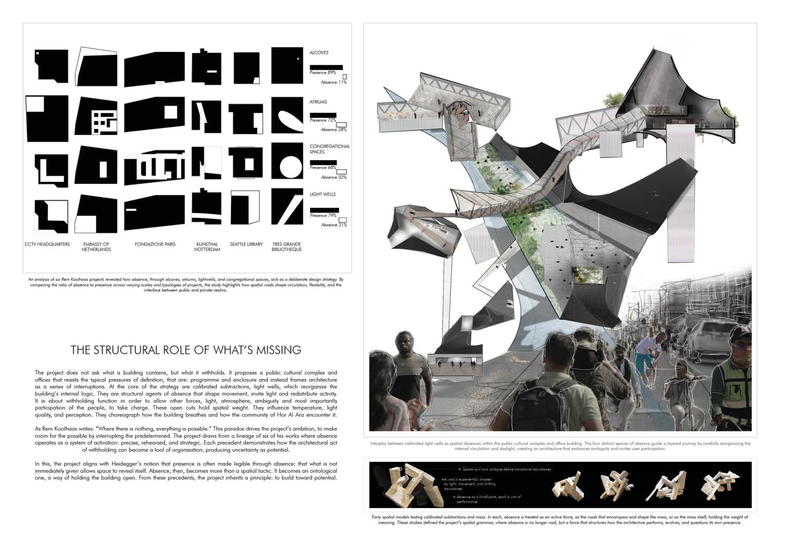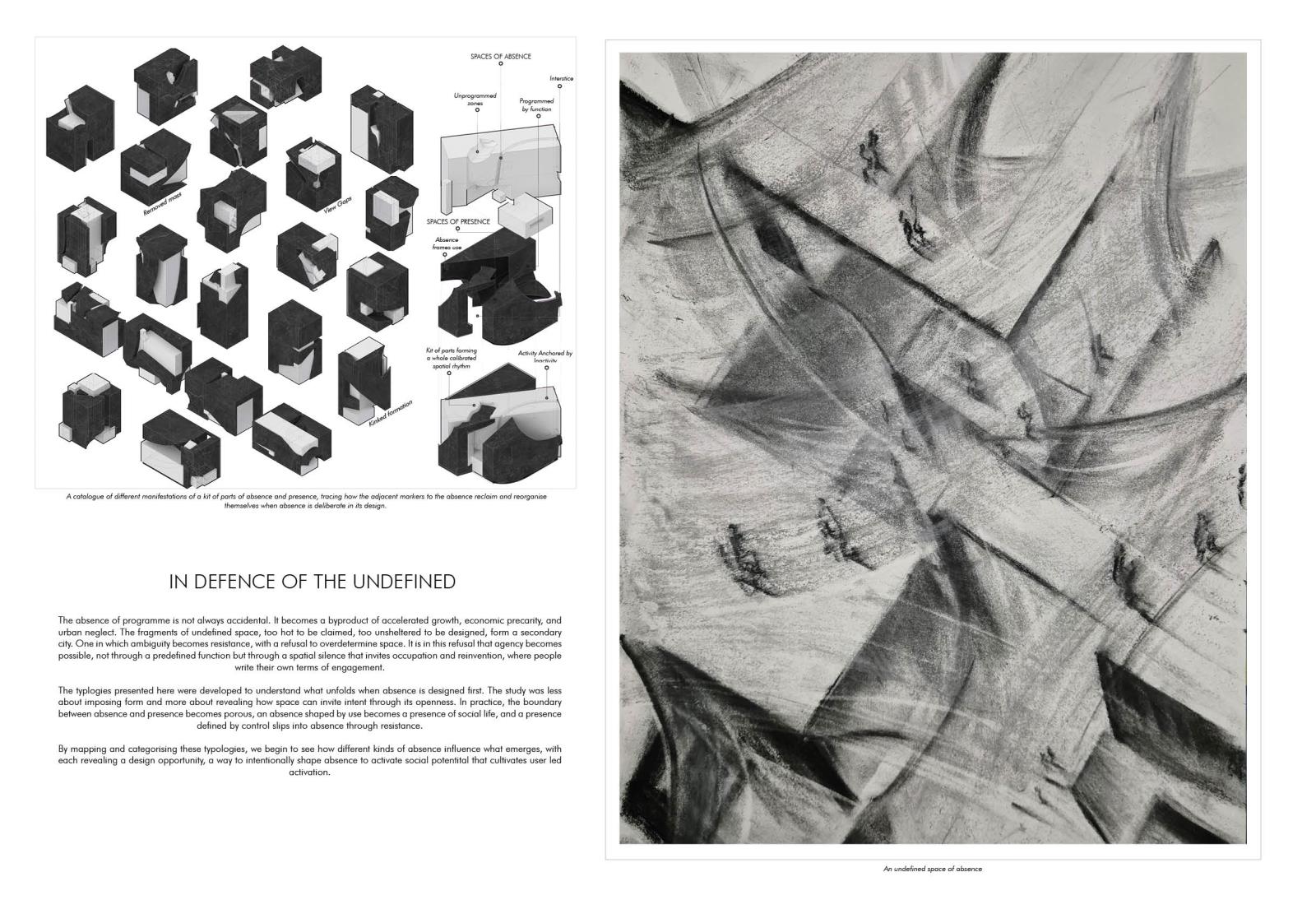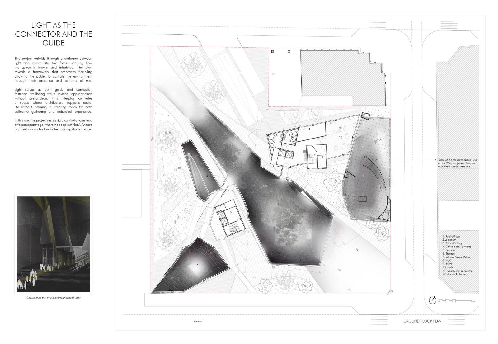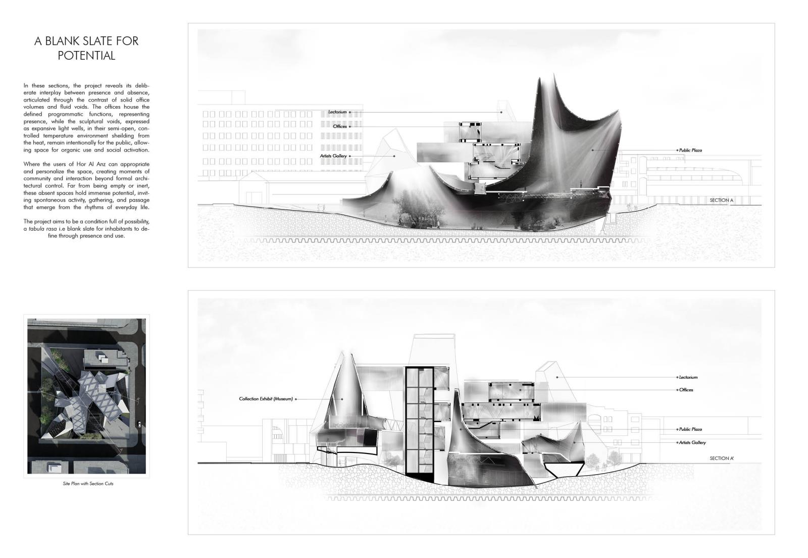 Traces of Abyss Part 1 Project 2025 Amir Shahnoor Heriot Watt University - Dubai Campus | UAE Set in Hor Al Anz, within the old district of Deira Dubai, a densely populated neighbourhood often bypassed by the city’s grand visions, ‘Traces of Abyss’ reclaims absence as a spatial and social necessity. Rooted in the elemental quality of Space, it resists the pressure to define, dictate, or perform.In a place where lives are shaped by the relentless logics of commute, transaction, and labour, the proposal introduces a cultural complex that refuses to dictate use. It offers space for pause, where the absence of imposed function becomes the only ethical gesture, a quiet resistance to hyper-functional urbanism that leaves no room for reflection or care.These absences are not voids, but spaces of potential. Occupied without instruction, they become active forms of care, reclaiming the right to gather, connect, redefine and create.For a community long overlooked, the project offers a soft landmark: quiet, present, and open. It doesn’t declare itself - it listens. And in doing so, reframes architecture as a container of communal identity.Traces of Abyss is a defence of leaving space open - where absence of function creates conditions for presence, encounter, and for care. Tutor(s) Vineeth T Kannoth Shameel Muhammed