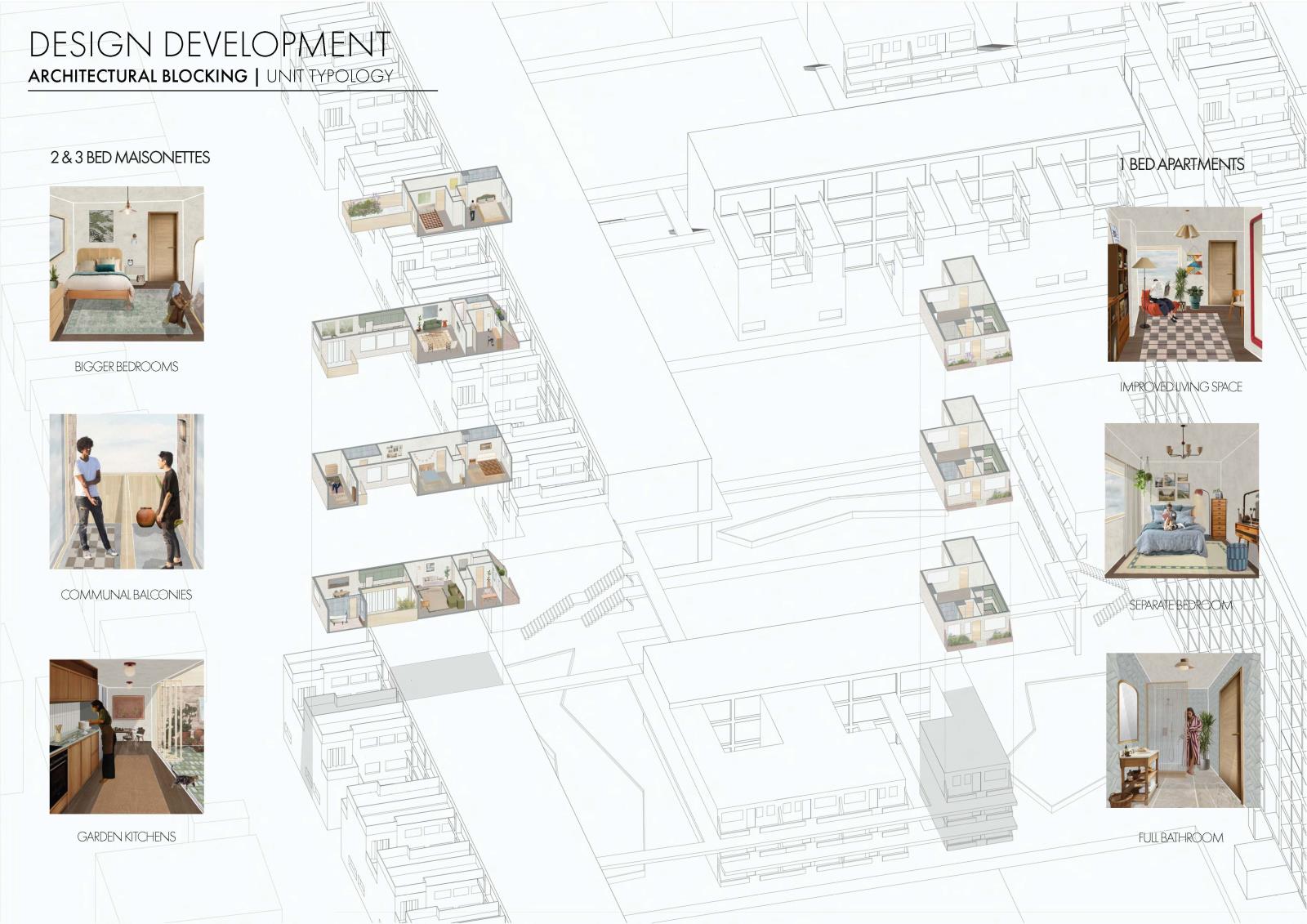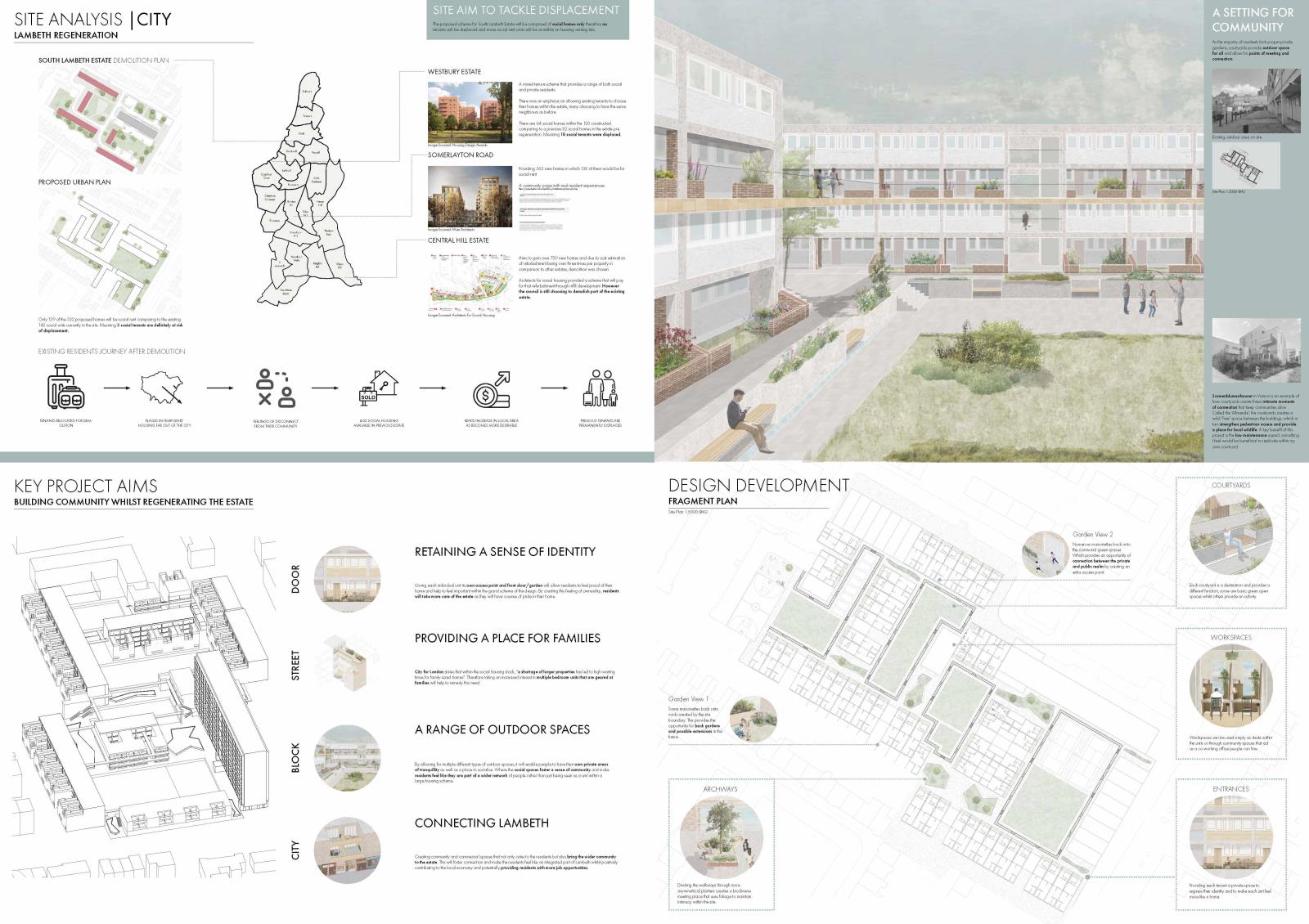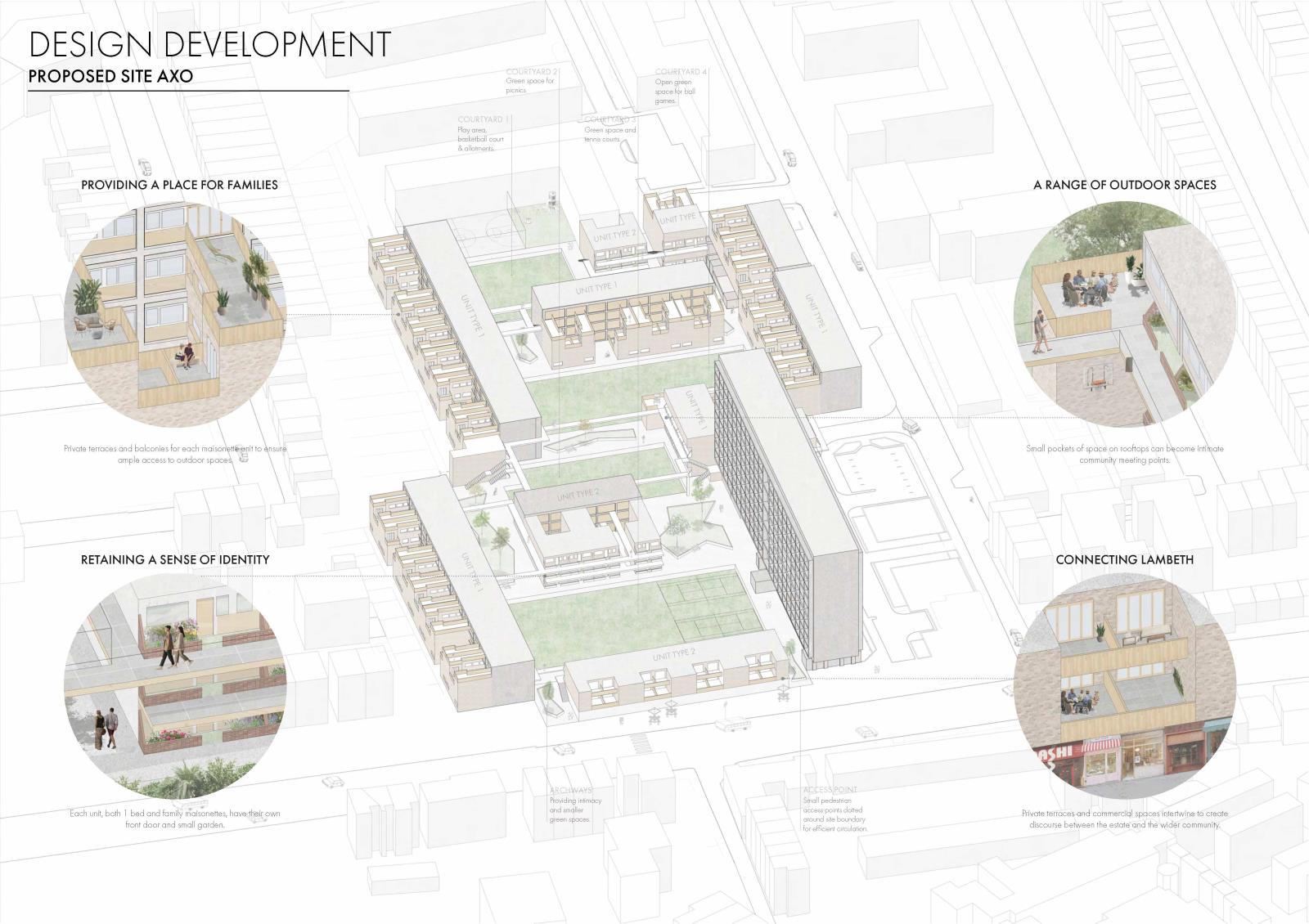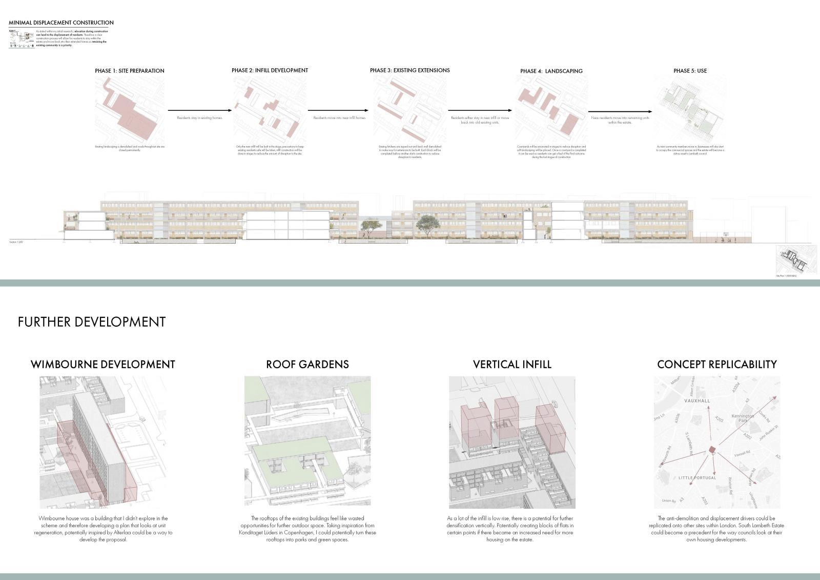 An anti-demolition social housing scheme with a focus on tackling tenant displacement. This project provides an alternative solution to the redevelopment of South Lambeth Estate, highlighting how urban spaces can be improved with minimal intervention to the existing fabric of the site. The proposal is a pedestrianised estate that provides 178 council owned social housing with two different unit typologies. These typologies are formed of both extensions on the original structures which transform the small studio units into more generous one-bedroom flats, and two-bedroom units in the infill development. This provides varied options for those on the housing waiting lists.