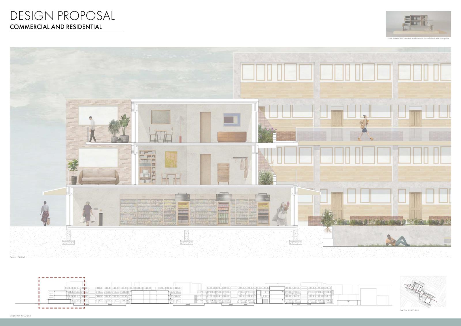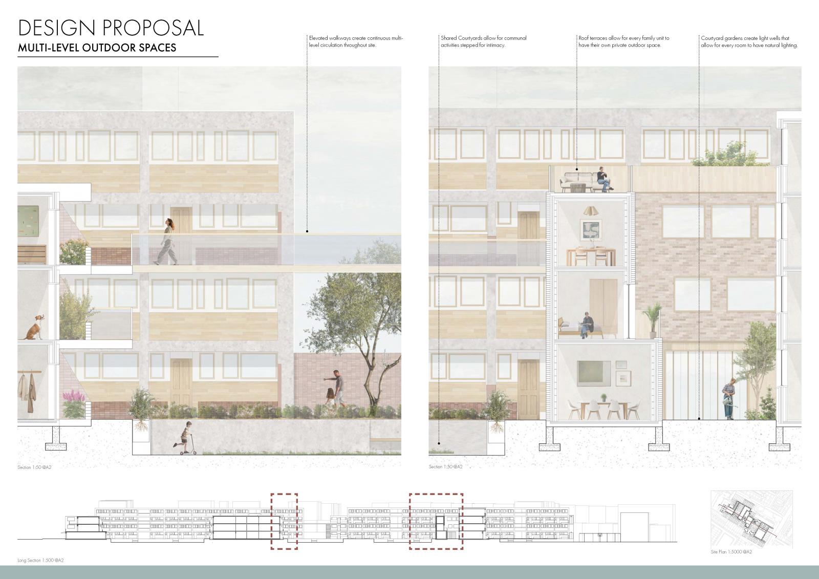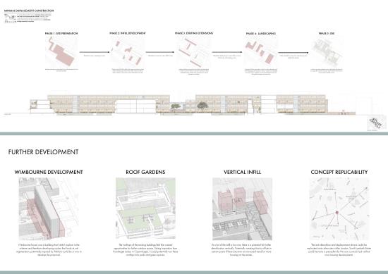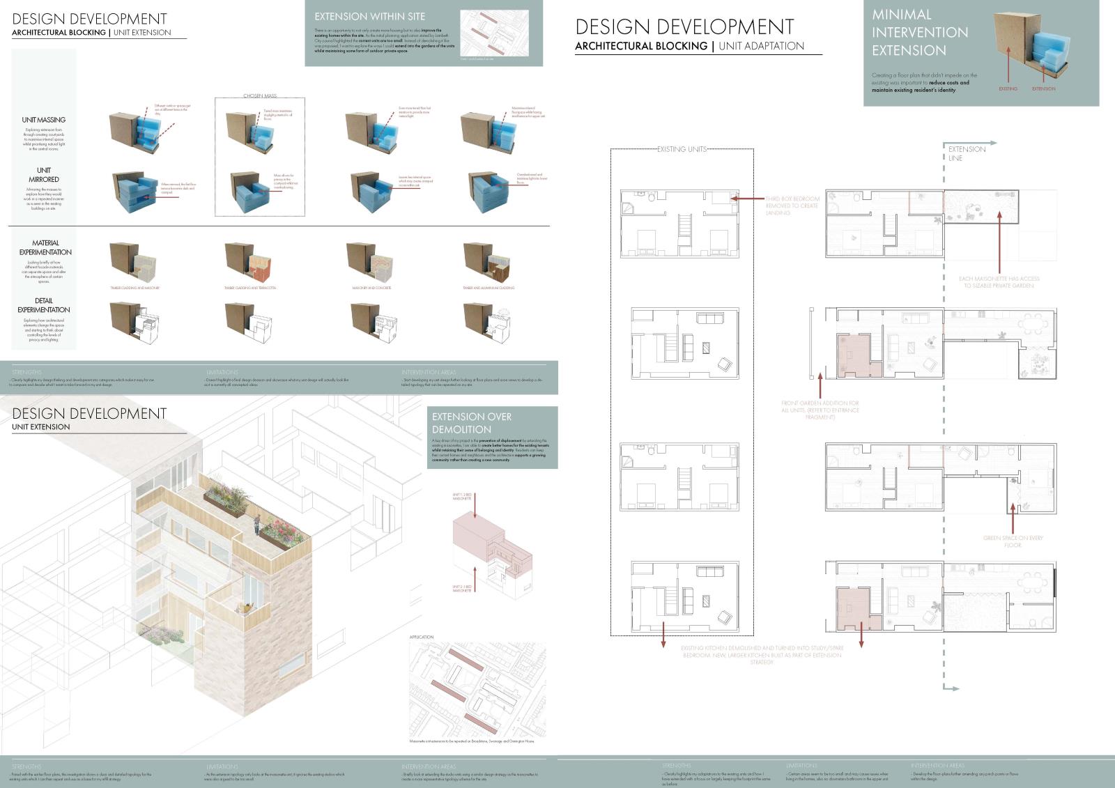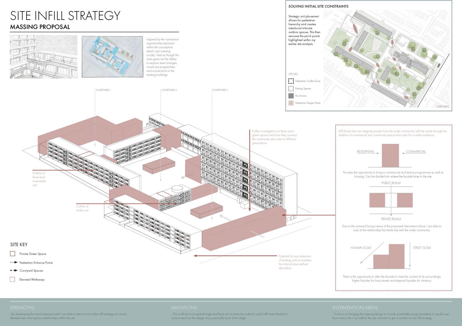 An anti-demolition social housing scheme with a focus on tackling tenant displacement. This project provides an alternative solution to the redevelopment of South Lambeth Estate, highlighting how urban spaces can be improved with minimal intervention to the existing fabric of the site. The proposal is a pedestrianised estate that provides 178 council owned social housing with two different unit typologies. These typologies are formed of both extensions on the original structures which transform the small studio units into more generous one-bedroom flats, and two-bedroom units in the infill development. This provides varied options for those on the housing waiting lists.