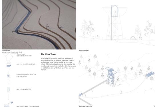 The design is largely self-sufficient. It includes a small river turbine, a rainwater collection system, and a water tower placed beside an old water wheel. A bridge leads across the river, guiding visitors through a gate that marks the shift from private to public land and symbolises openness and connection.