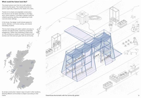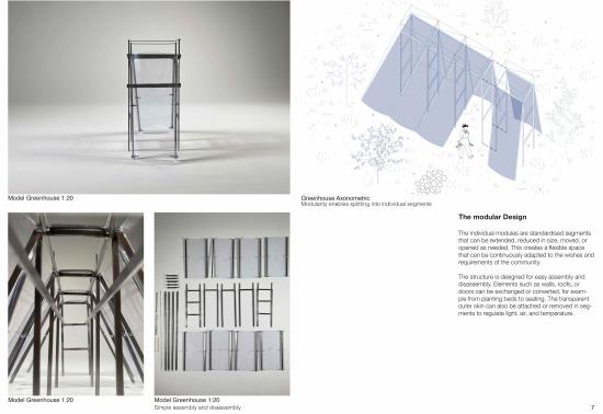 At the heart of the project is a modular, lightweight steel structure. Inspired by shelving systems, it allows for easy expansion, storage, and reconfiguration. This flexibility supports changing needs over time and encourages users to adapt the space themselves. The greenhouse becomes both a productive and social place—a setting for growing plants, sharing skills, and exchanging ideas.