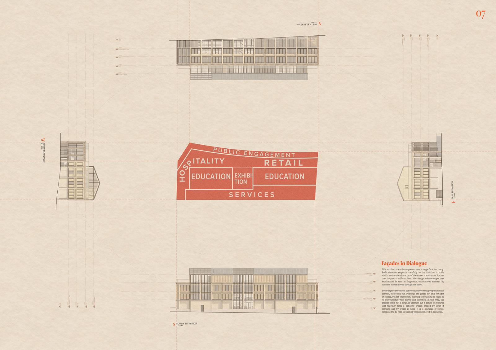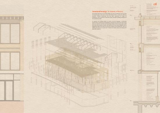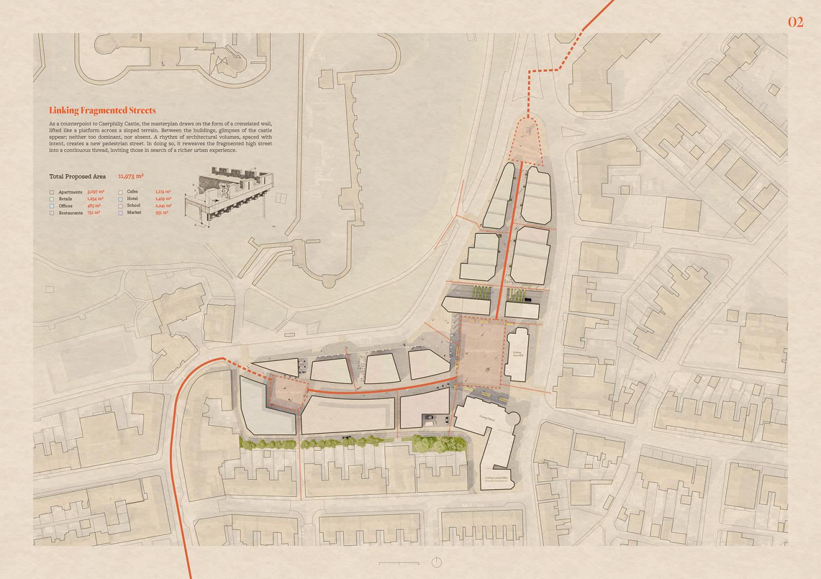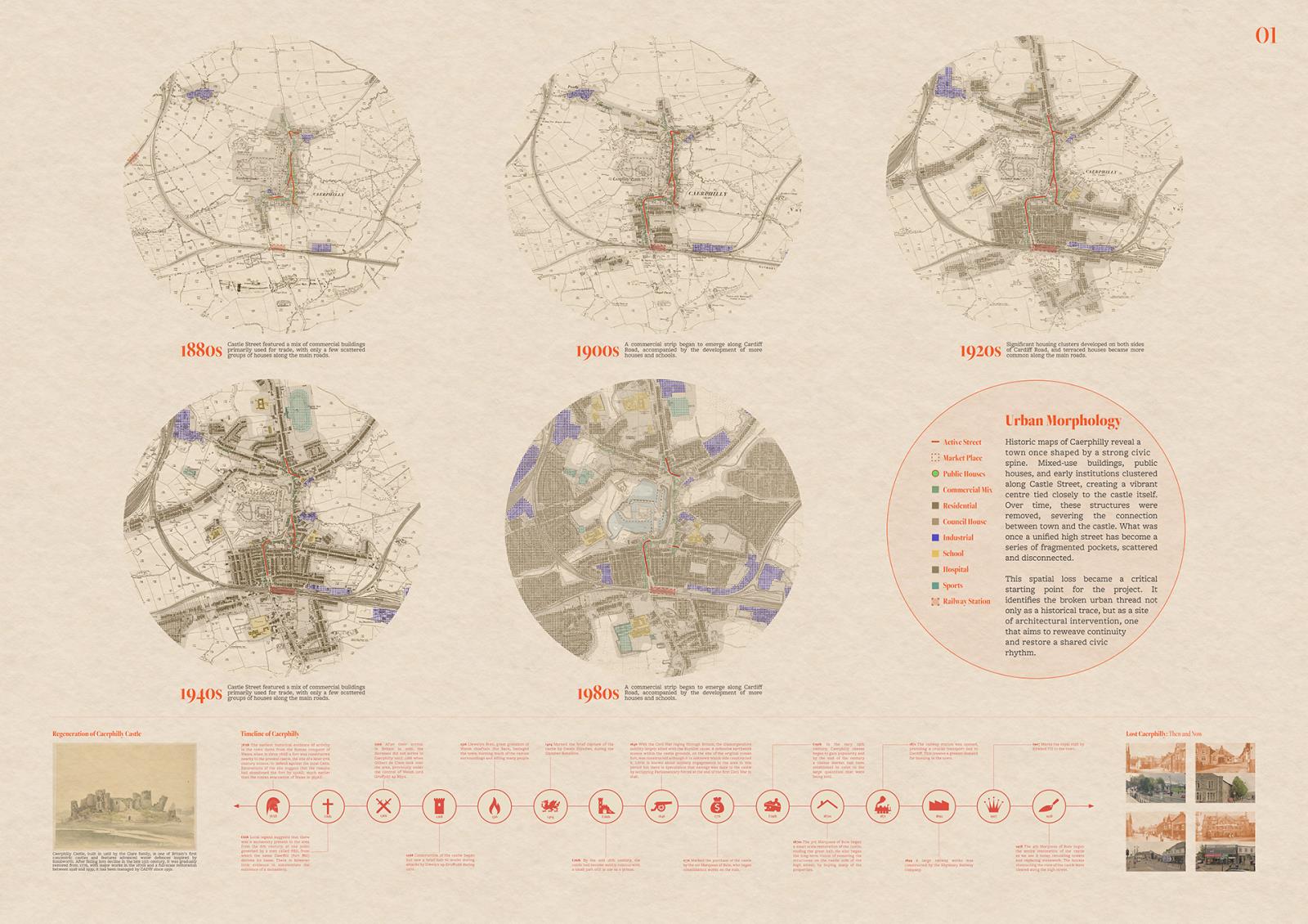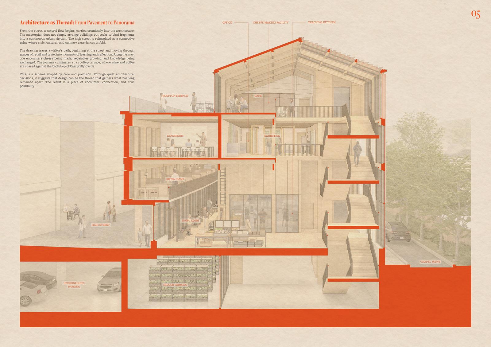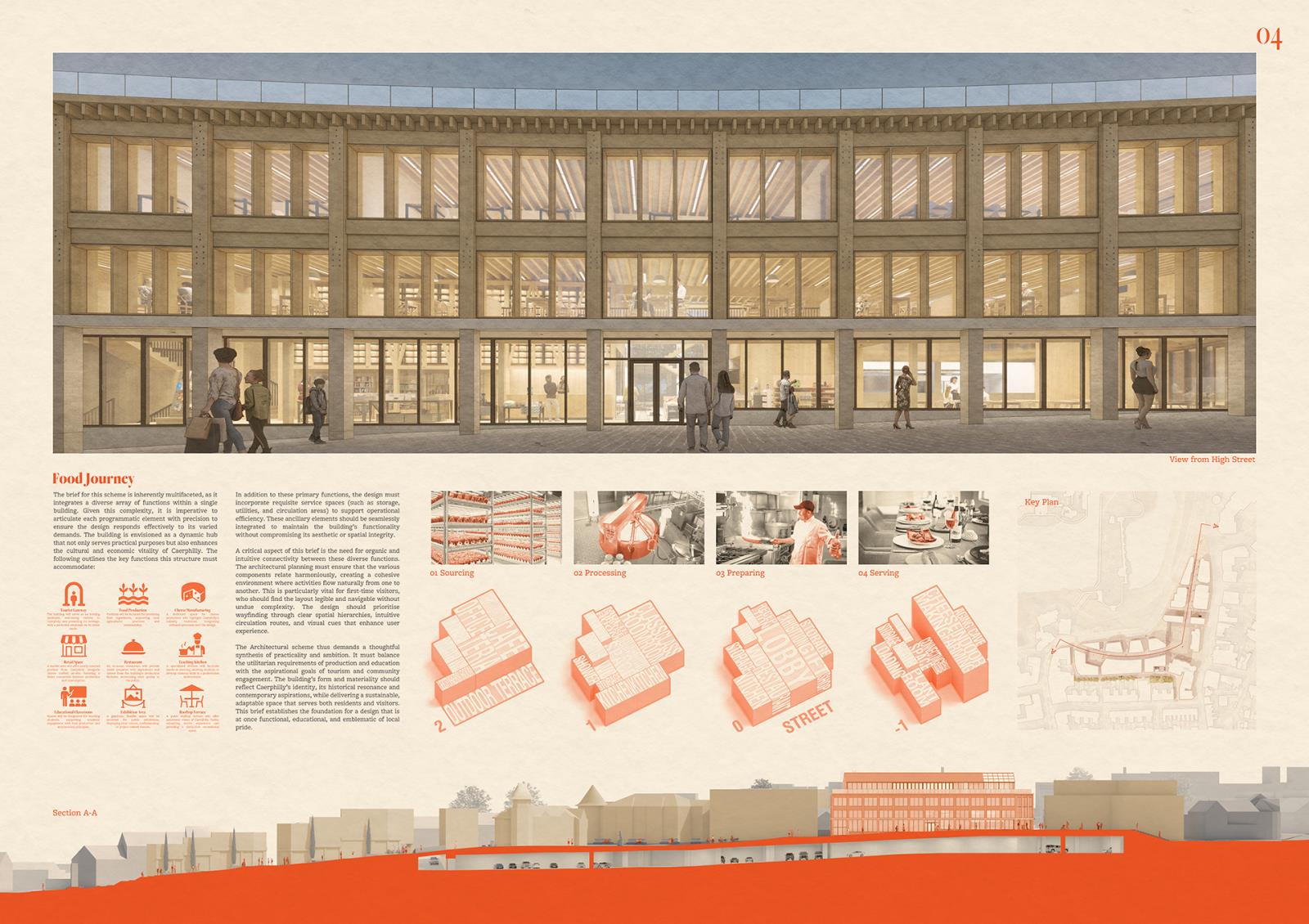 Caerphilly is a town shaped by absence. Its industrial legacy lingers, yet little remains to connect its past with a viable civic future. While the castle offers an undeniable visual and historical anchor, the surrounding townscape lacks coherence and cultural assets lie scattered and unlinked. This scheme responds to that condition, proposing an architectural intervention that rethinks both structure and programme through the lens of food.