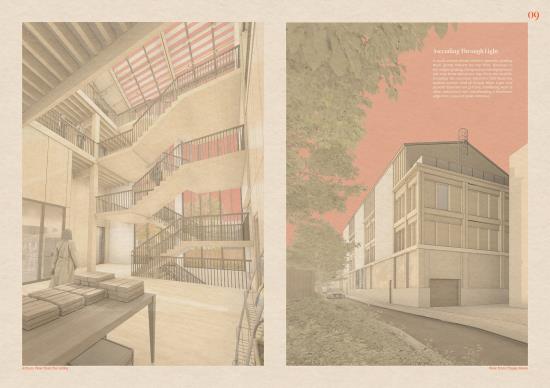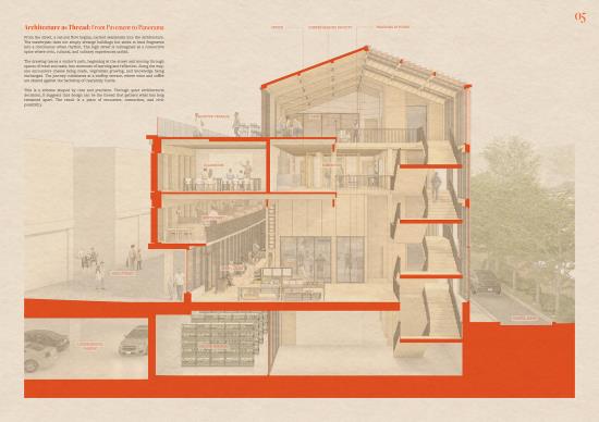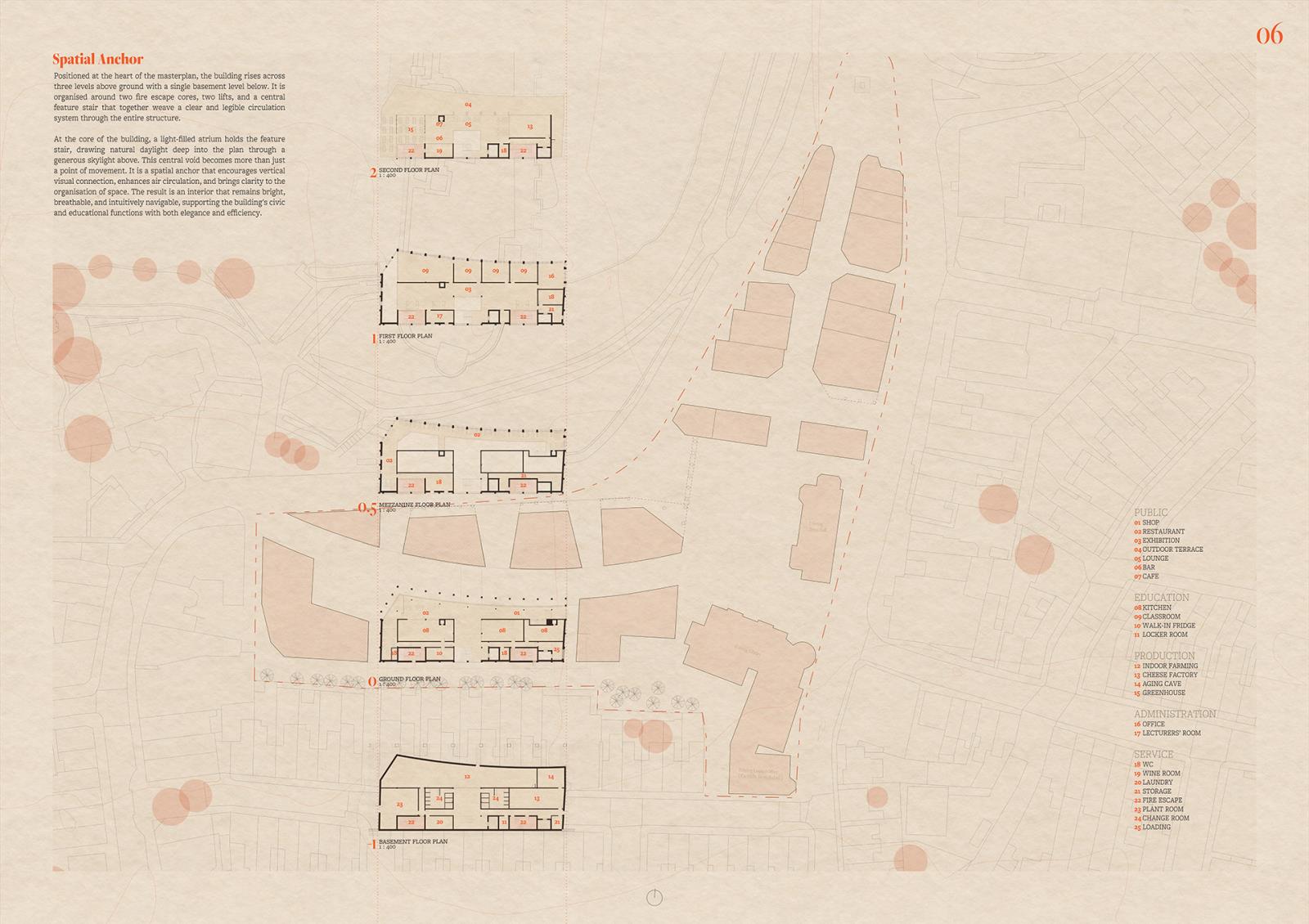 A new pedestrian route weaves through the town, linking fragmented streets and communities. At its centre sits a multifunctional hub that brings together agriculture, education, and hospitality. Local production such as cheese, crops, and meals becomes both performance and pedagogy. Visitors engage not just as spectators but as participants. The architecture is legible and open, constructed from timber and assembled with honesty, inviting understanding of its making.