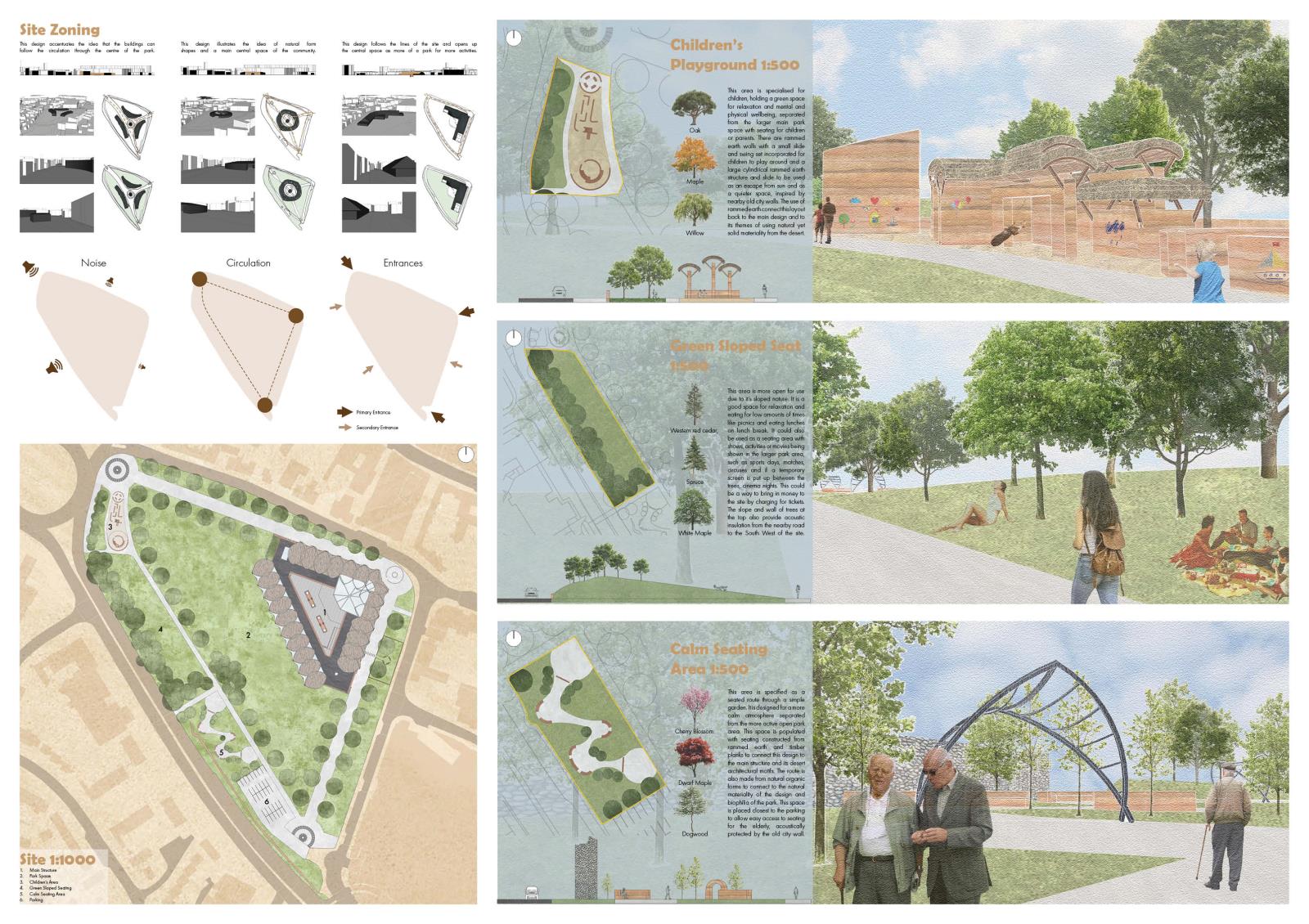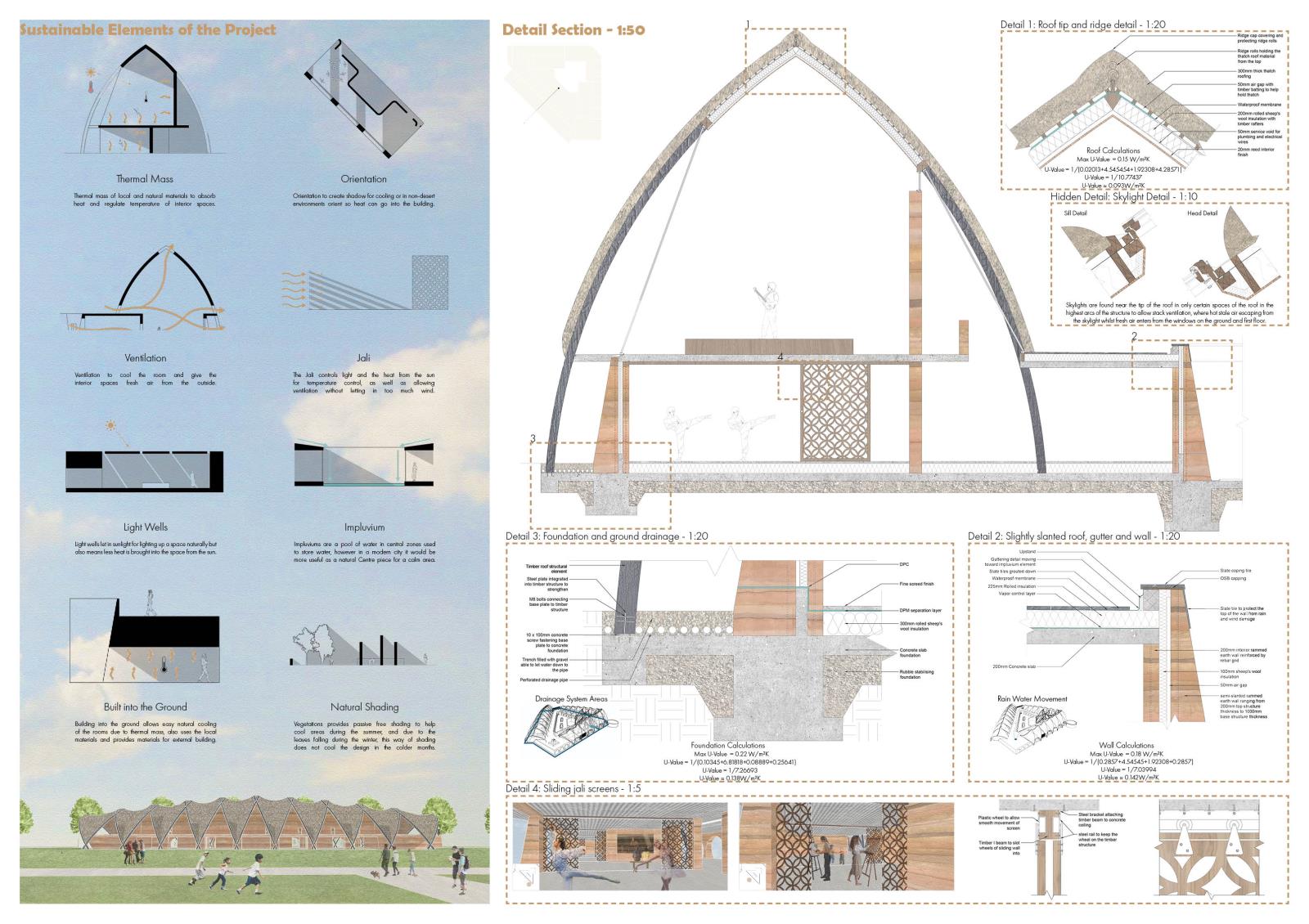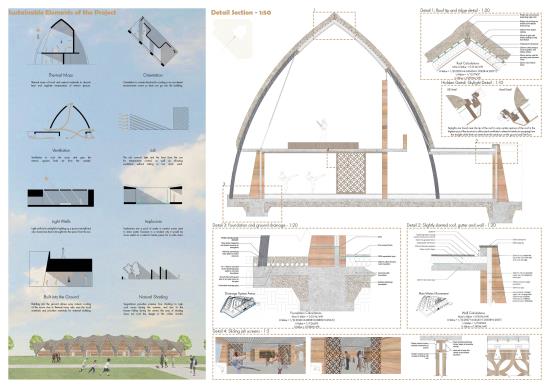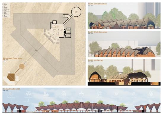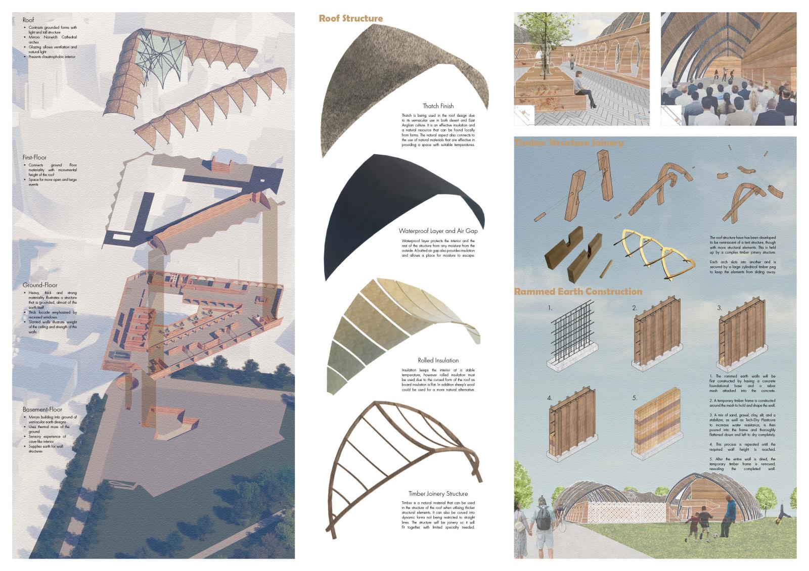 The design draws inspiration from earthen and desert architectural practices connecting to sustainability, artistry and structure. With these architectural styles, the design seeks to educate nearby residents about less known and accepted design strategies that could be implemented into the UK urban culture to develop dynamic visuals whilst assisting in creating habitable interior spaces in a world growing hotter due to global warming.