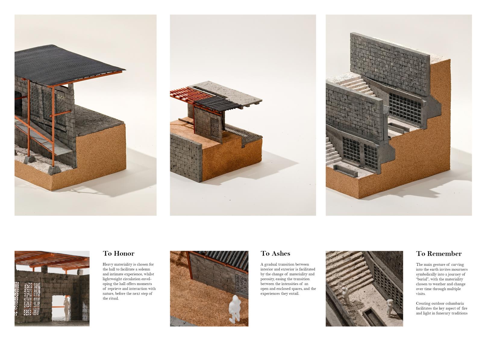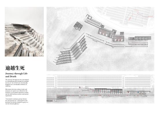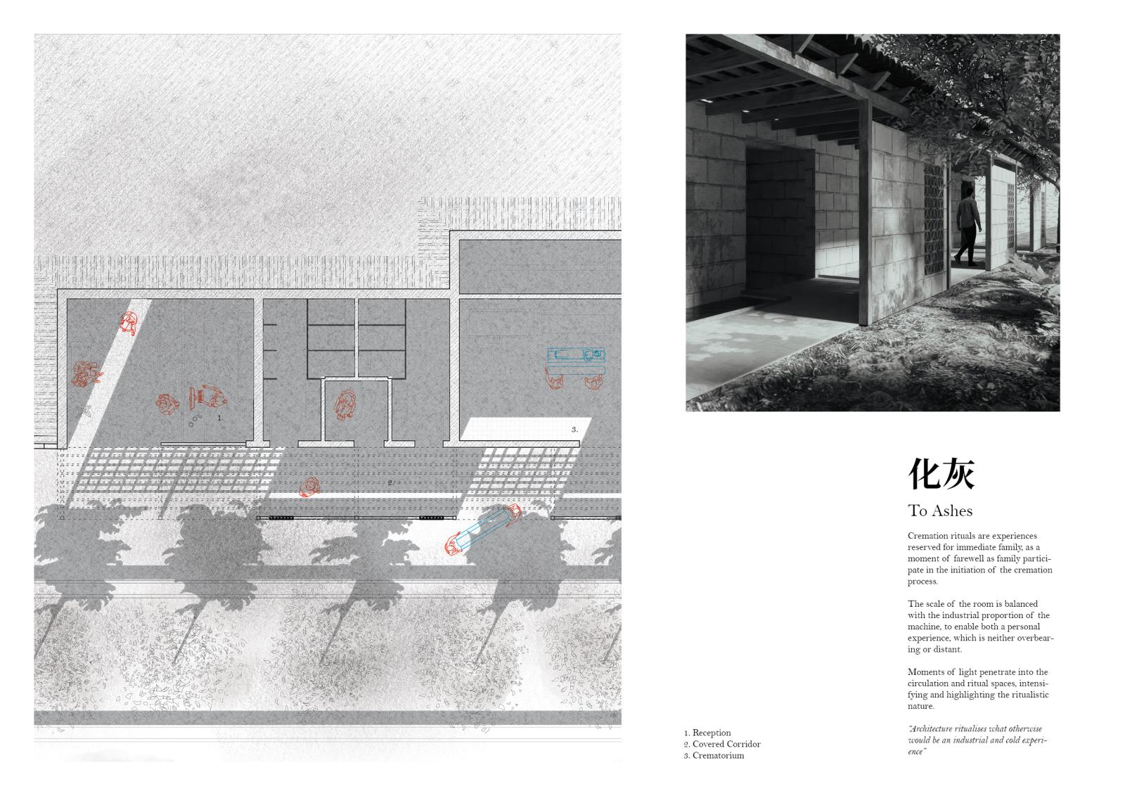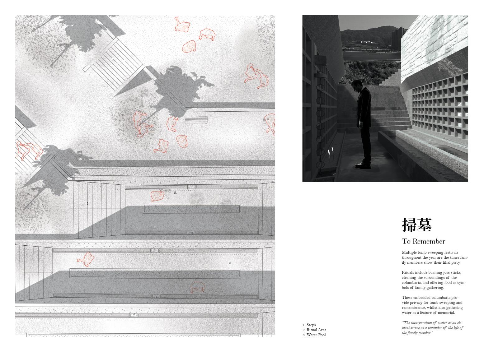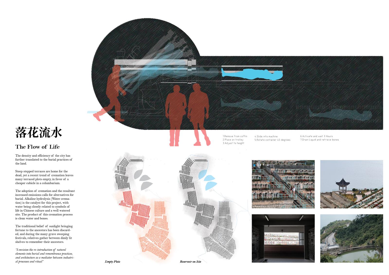 The project identifies the lack of ritualistic funerary spaces in the efficient context of Hong Kong, and aims to enable both the elaborate funeral rituals, and moments of reprieve for the mourners, aiming to create a complete experience from memorial, cremation to burial, to imagine a complete burial package for this alternative process. The process of water cremation provides a catalyst for water to be a motif throughout the site and as a cultural symbol of life, accompanying the mourners through various stages of the process.