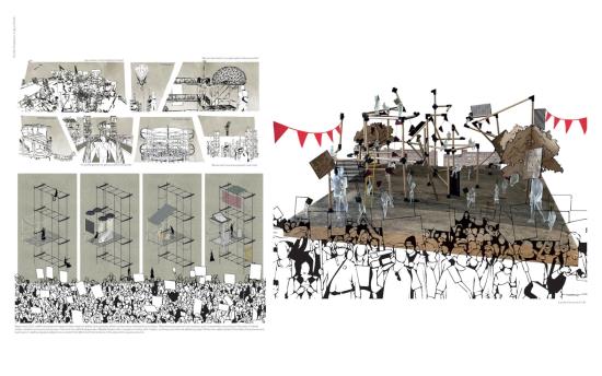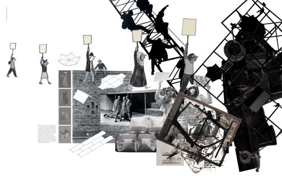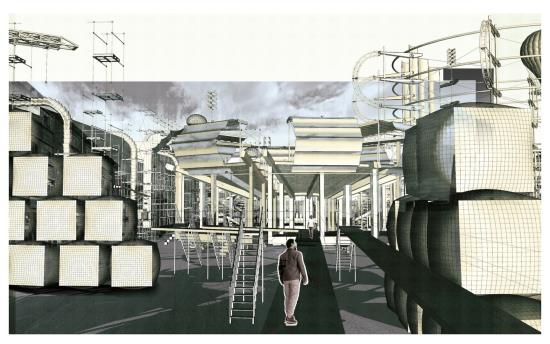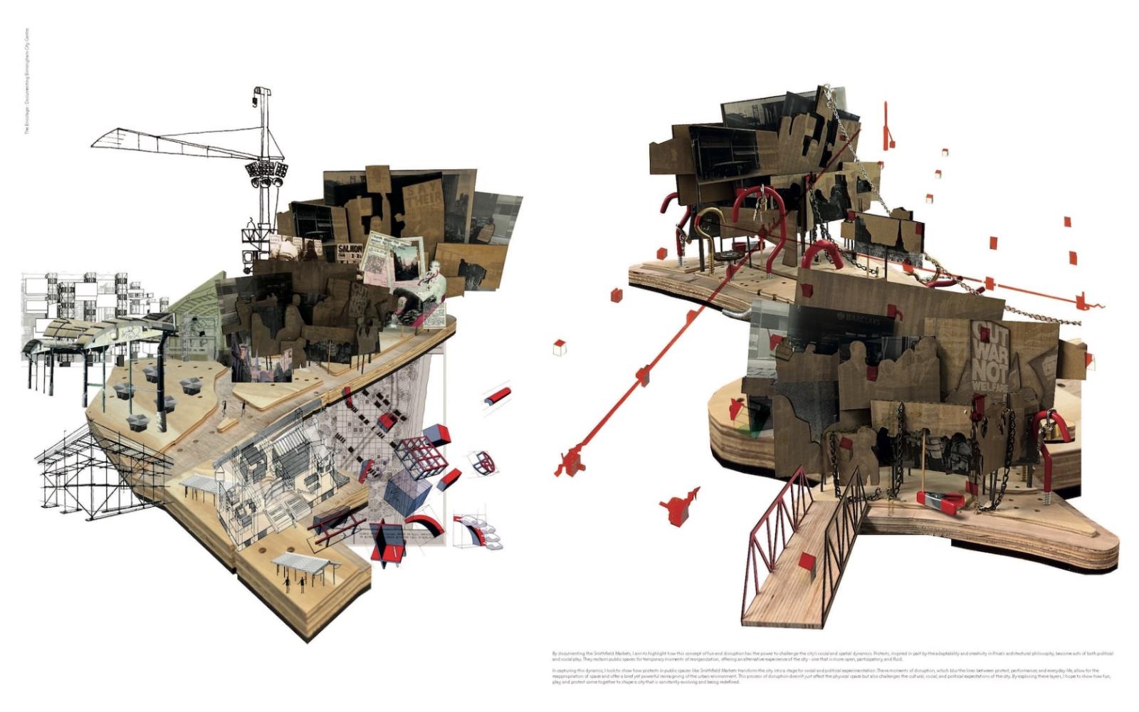 Currently awaiting redevelopment, Smithfield’s cleared land offers an opportunity for experimental intervention from 2025–2035. I propose temporary structures attached to existing buildings, using found materials and inspired by protest design and détournement to question who controls space. These structures are not fixed; they act as stages for performance, and improvisation, whereby spaces are continually reshaped by their users.