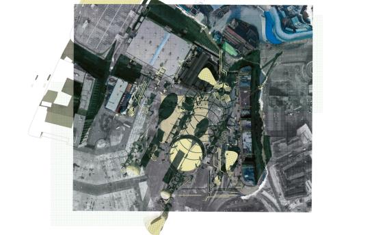 Bernard Tschumi’s Parc de la Villette also informs the project. Like his follies, the design resists singular meaning, encouraging multiple interpretations. Rather than build upwards, this proposal spreads horizontally, preserving open, public ground.