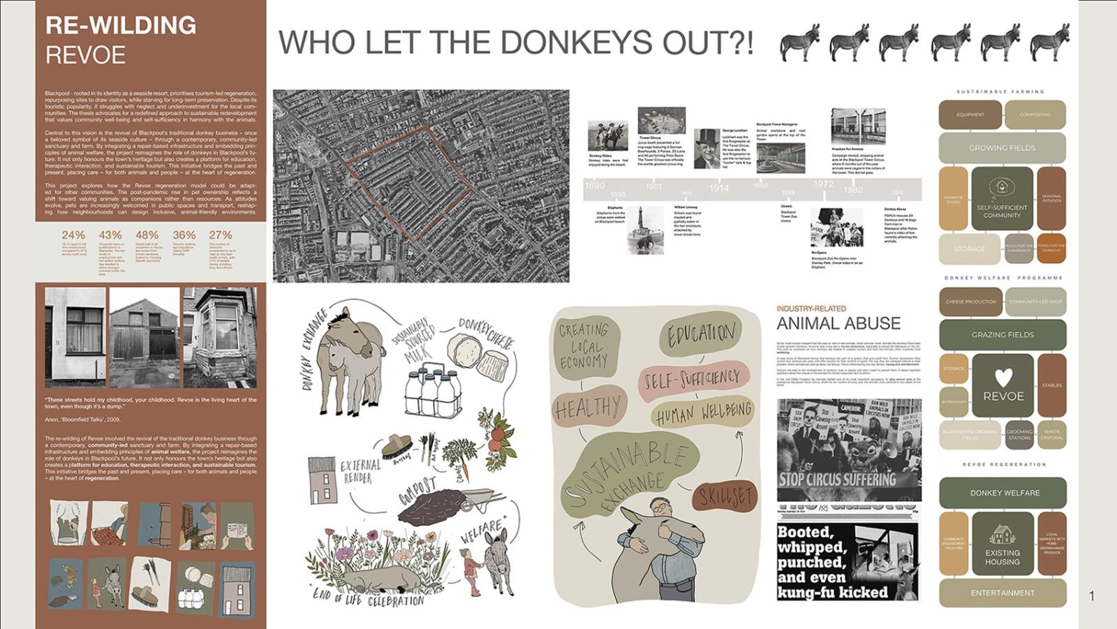 Re-Wilding Revoe Part 2 Project 2025 Patrycja Wolak University of Central Lancashire | UK Blackpool, long rooted in its identity as a seaside resort, prioritises tourism-led regeneration, often at the expense of long-term preservation and local investment. While popular with visitors, it faces ongoing neglect of its communities. This thesis proposes a sustainable redevelopment model that centres community well-being and animal welfare.At its core is the revival of Blackpool’s traditional donkey business—once a cultural icon—through a contemporary, community-led sanctuary and farm. This project reimagines donkeys not as attractions, but as part of a care-based, educational, and therapeutic framework. By embedding repair-focused infrastructure and ethical animal practices, the initiative honours heritage while promoting inclusive, sustainable tourism.It explores how the Revoe regeneration model can inspire similar community transformations elsewhere. The post-pandemic rise in pet ownership signals a shift in attitudes—animals are seen more as companions, reshaping how public spaces and transport can become more inclusive and animal-friendly. Tutor(s) Lee Ivett