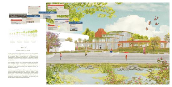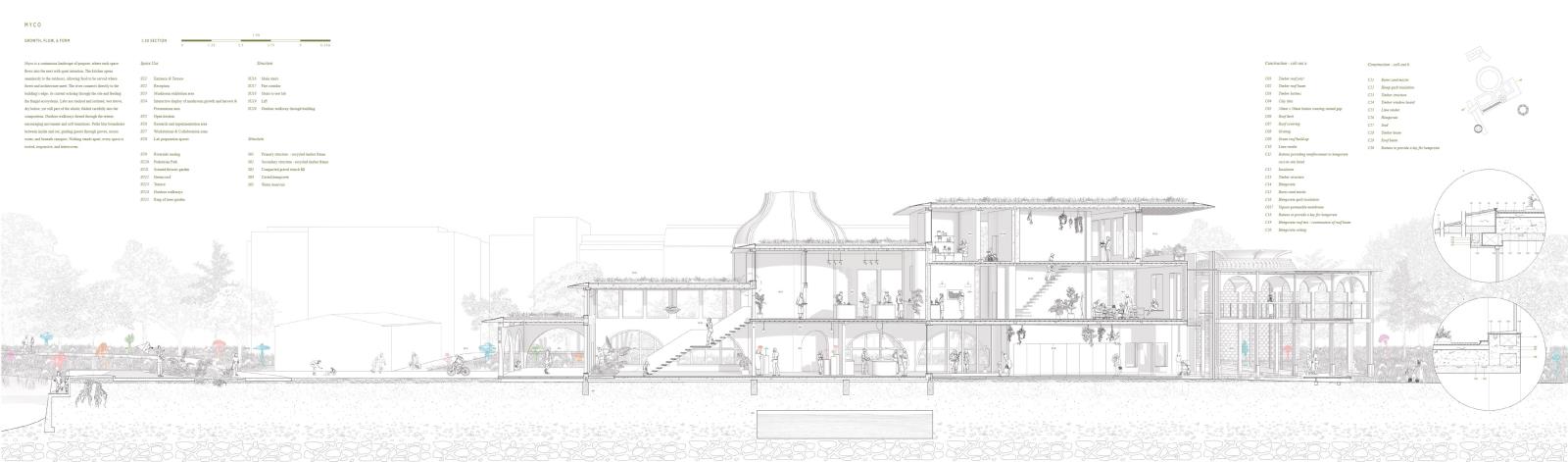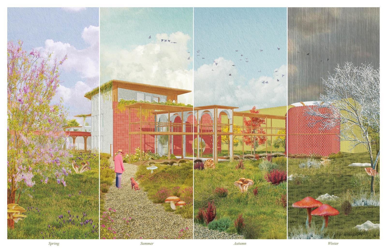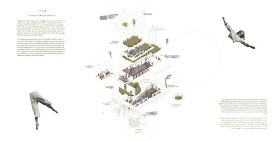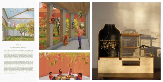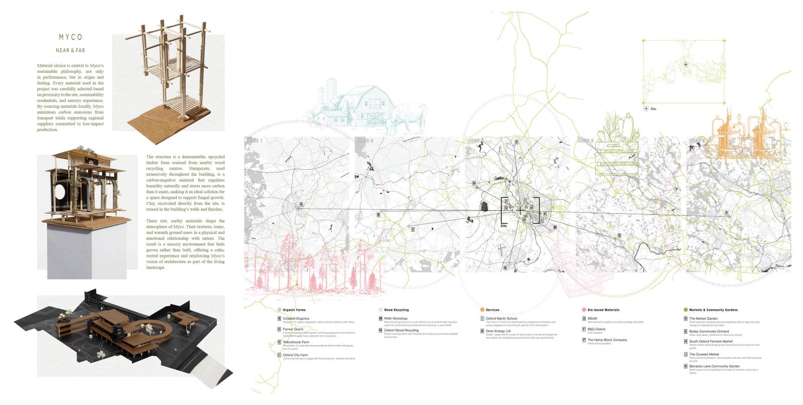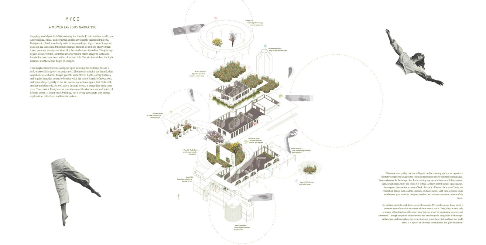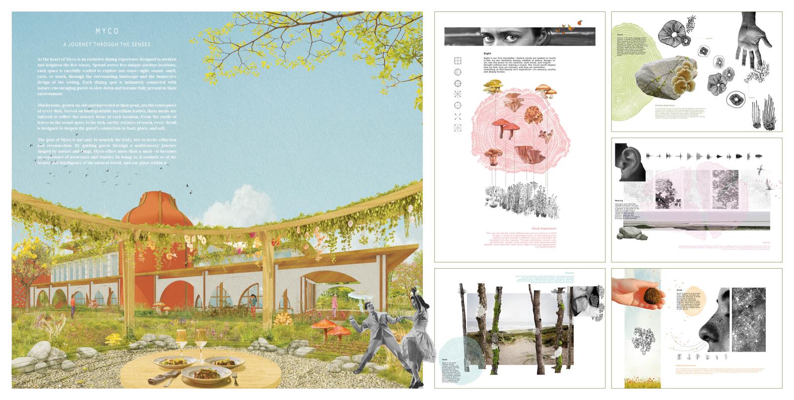 Myco: A culinary and scientific retreat Part 1 Project 2025 Pénélope Pomey Carpentier University of Reading | UK Myco is a visionary culinary and scientific retreat that reimagines the intersection of architecture, sustainability, and sensory experience. Set within a within a newly proposed, lush and evolving landscape, it houses a plant-based restaurant and a cutting-edge research lab dedicated to studying Pestalotiopsis Microspora, a fungus capable of breaking down plastic.At its heart, Myco invites guests on a multisensory dining journey through five outdoor spaces, each designed to heighten one of the senses. From tactile mycelium leather plates to the sound of rustling leaves and the scent of surrounding gardens, every element is curated to foster a deeper connection to food and nature.The project champions regenerative design: mushroom cultivation is integrated with water harvesting systems, and the architecture draws from fungal networks, using organic forms and sustainable materials like timber, hempcrete, and clay. Research labs explore fungi’s potential to combat landfill waste, bridging science with ecological renewal.Inspired by it surroundings, Oxford’s historic forms, but rooted in the future, Myco is not just a building, it’s a living ecosystem. It embodies a shift toward circular design, scientific innovation, and sensory awareness, shaping a more connected and sustainable world. Tutor(s) Michelle Tomlinson