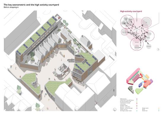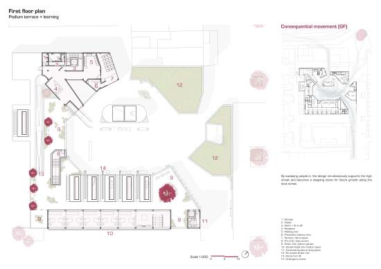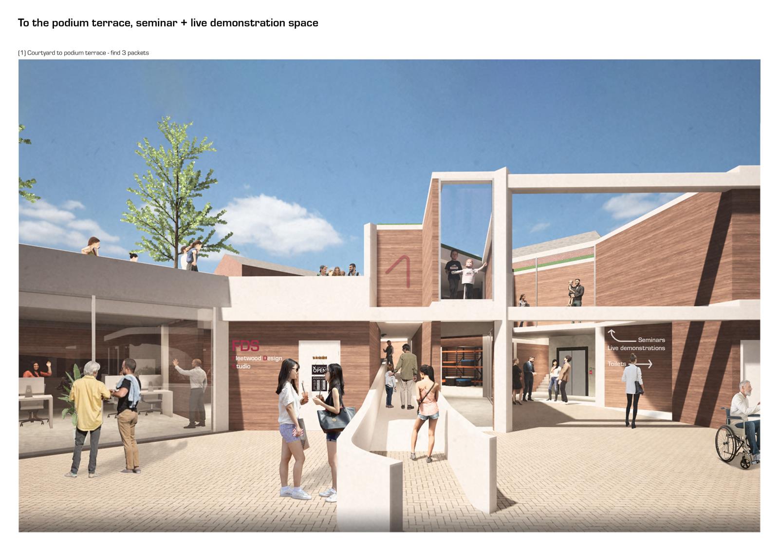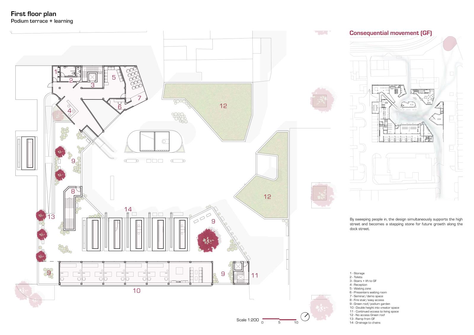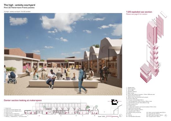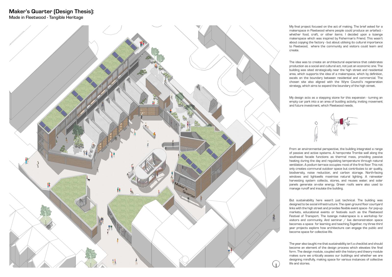 Situated on a tendril leading out from the heart of the Highstreet, my proposal acts as a bridge to the old dockland which the Council’s Regeneration Framework had outlined as an ideal zone for investment, hereby supporting Fleetwood’s future growth. Within the design, my architecture minimises barriers and revolves around a high- activity courtyard, where movement, making and accidental meeting points are encouraged.