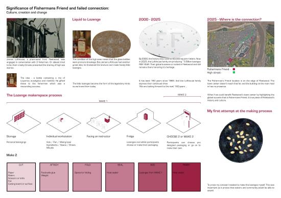 Maker’s Quarter is a project exploring the act of making, consequently celebrating the unique history of Fleetwood whilst supporting connection and memory whilst creating an artefact – tangible heritage. The lack of connection between Fisherman's Friends (A worldwide lozenge brand) and Fleetwood, led the project to becoming a cultural workshop where community and visitors could create lozenges and their packaging as keepsakes or gifts, embodying the story of Fleetwood.