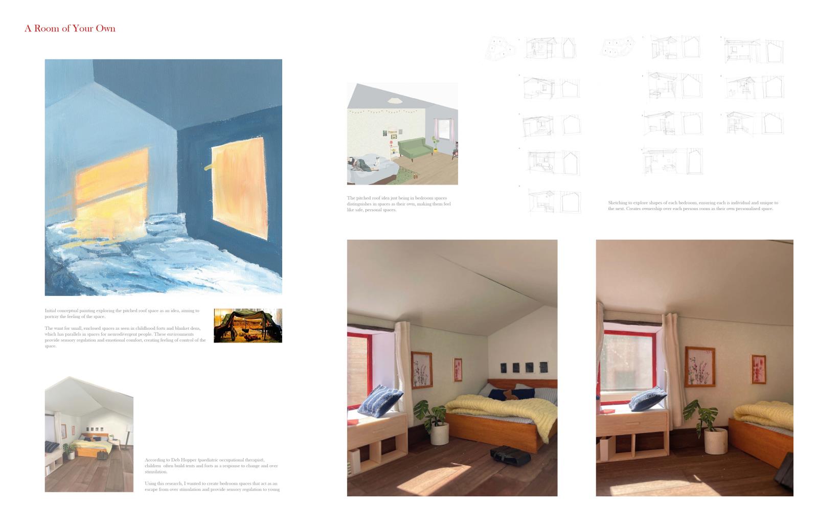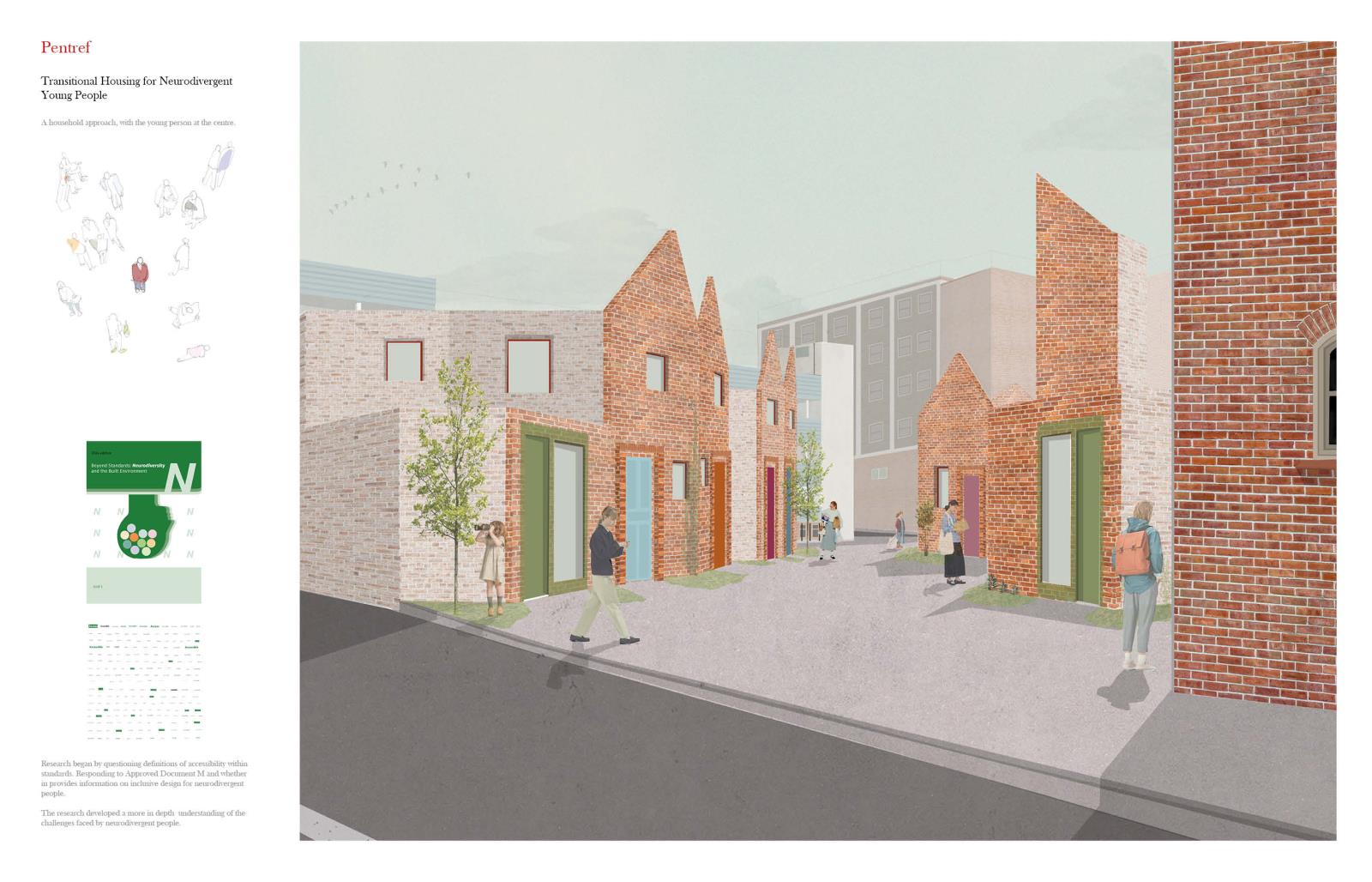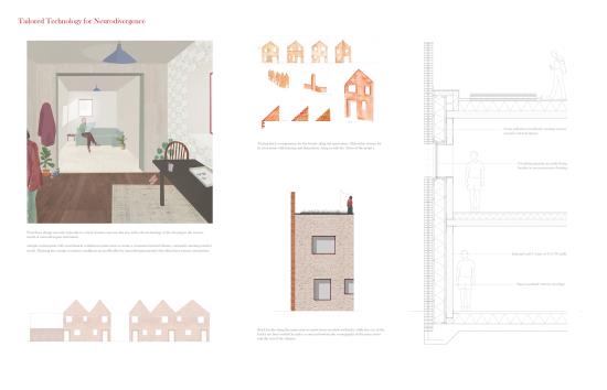 Questioning policy, designs and standards that fail to accommodate for neurodiversity, the project aims to deliver a transitional housing scheme that provides a flexible environment where young people can change and grow at their own pace. Challenging existing housing schemes that provide one-size-fits-all solutions and offer limited flexibility for the changing needs of young people.